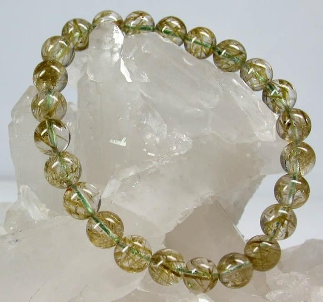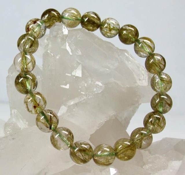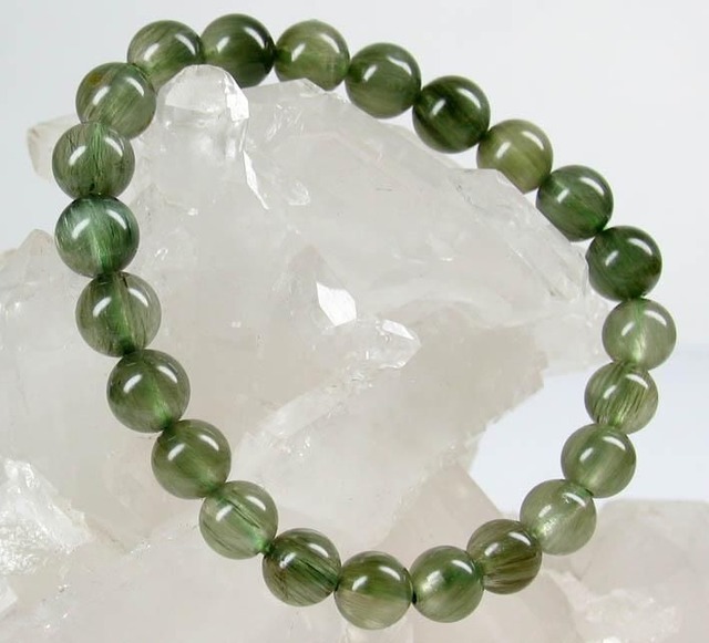 ブラジル産、極上のグリーンルチルクォーツ(緑針水晶)ブレスレットです。 グリーンルチルは、水晶の中に針状のアクチノライト(緑閃石)という鉱物が内包されている水晶のことです。緑色の針が美しくビジネスを成功に導く効果があると言われてます。 水晶玉の直径:8~8.5mm*33玉 重さ:17g 16センチゴム使用。 ☆天然のものですので、若干不純物、色むら、天然キズがある場合がございますので、予めご了承お願いします。