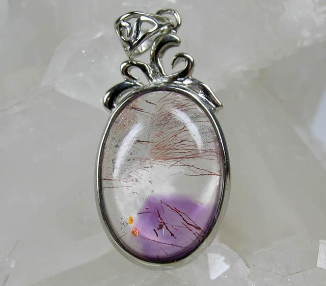 ブラジル・エスピリトサントで採れたスーパーセブンクォーツのペンダントトップです。 スーパーセブンとは、赤、黒、紫、黄色、褐色などのさまざまな色と、針状や小板状の鉱物を内包した、独特の風情のある水晶です。一つの水晶原石の中に、アメジスト、スモーキークォーツ、ルチル、カコクセナイト、レピドクロサイト、ゲイサイトの7種類の鉱石が含まれた状態で産出したモノで、ファイアセイクリッドクォーツやメロディストーンとも呼ばれます。複数の異なる要素を含んだスーパーセブンは、浄化の必要がないほどパワーが強いと言われており、ヒーラーの間でも特に人気のある石です。人の心の「愛と調和」に共鳴し、持つ人のまわりに、個性的で良い気を持った人々が集まると言われています。それがさらに良い循環を促して、大きな成長と発展をもたらすとされています。 サイズ::縦35mm、幅:21mm、厚さ:13mm 重さ:11g 金具:シルバー925 産地:ブラジル・エスピリトサント 天然のものですので若干不純物、色むら、クラック、天然キズがある場合がございますので、予めご了承お願いします。