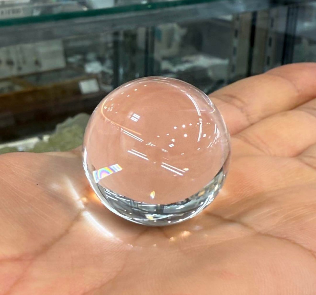 当店のAAAクラス無色透明水晶丸玉は、目視で100%無色透明無傷の天然水晶(ロッククリスタル)丸玉の事を呼びます。肉眼で内包物(極小さな気泡やクラックなど)はまったく見えません。最高級水晶玉です。