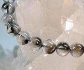 プラチナルチル水晶は「ブルッカイトルチル」とも言われ、水晶中に板チタンが繊維状に結晶化した稀少な鉱物です。繊細な絹の繊維を思わせるルチルが実に美しく、その白い輝きは格別モノです。ブルッカイトが密集しているところは黒く見えています。