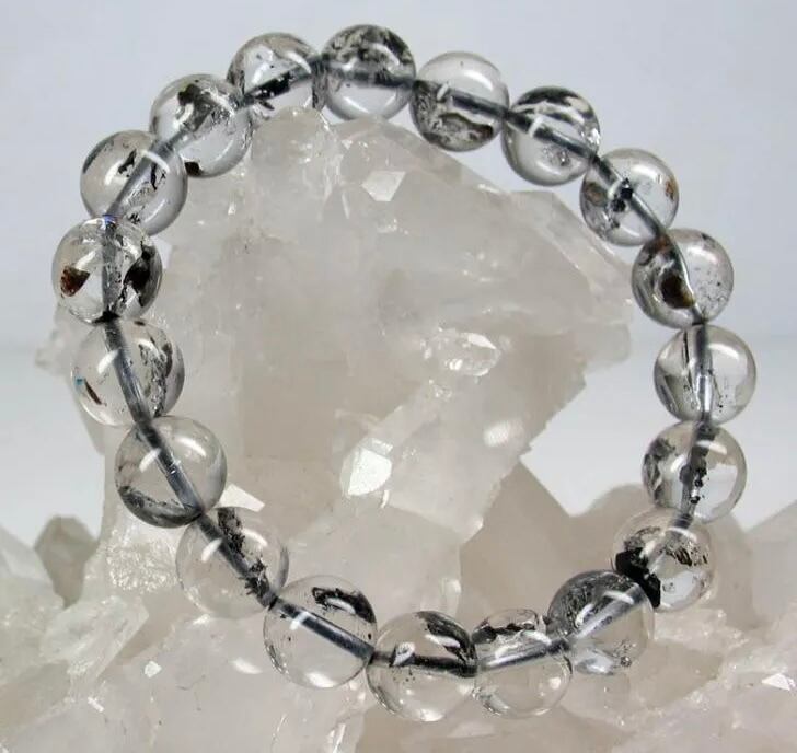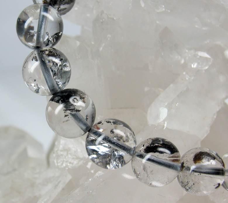 透き通るような透明感の中に黒いインクリュージョンと黒い内包物が見られるのが特徴で、エレスチャルのブレスレットです。