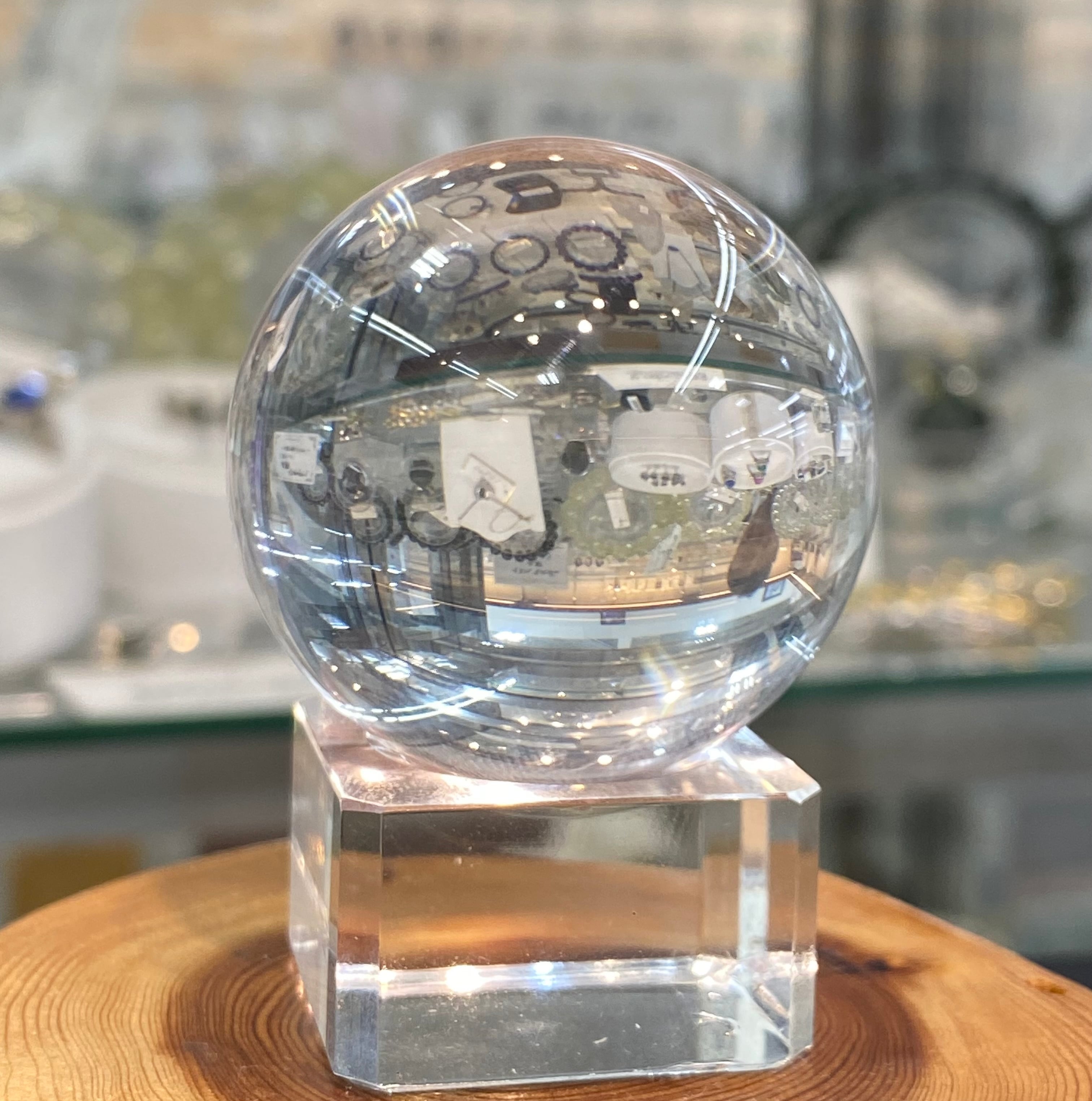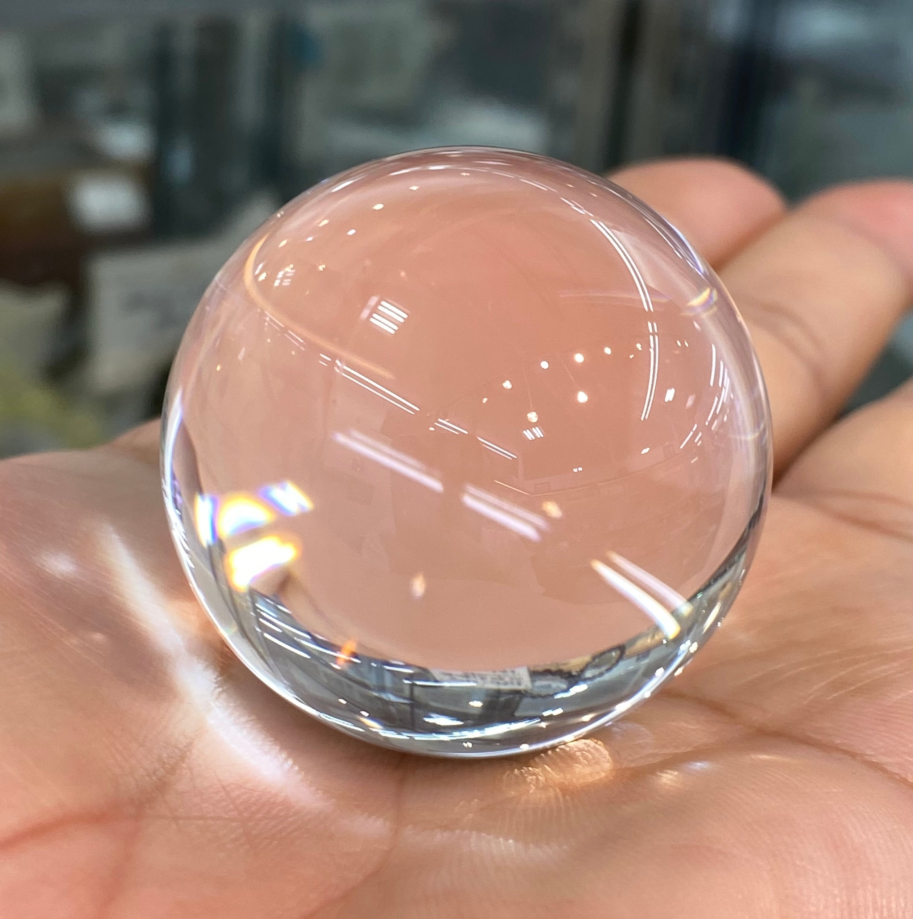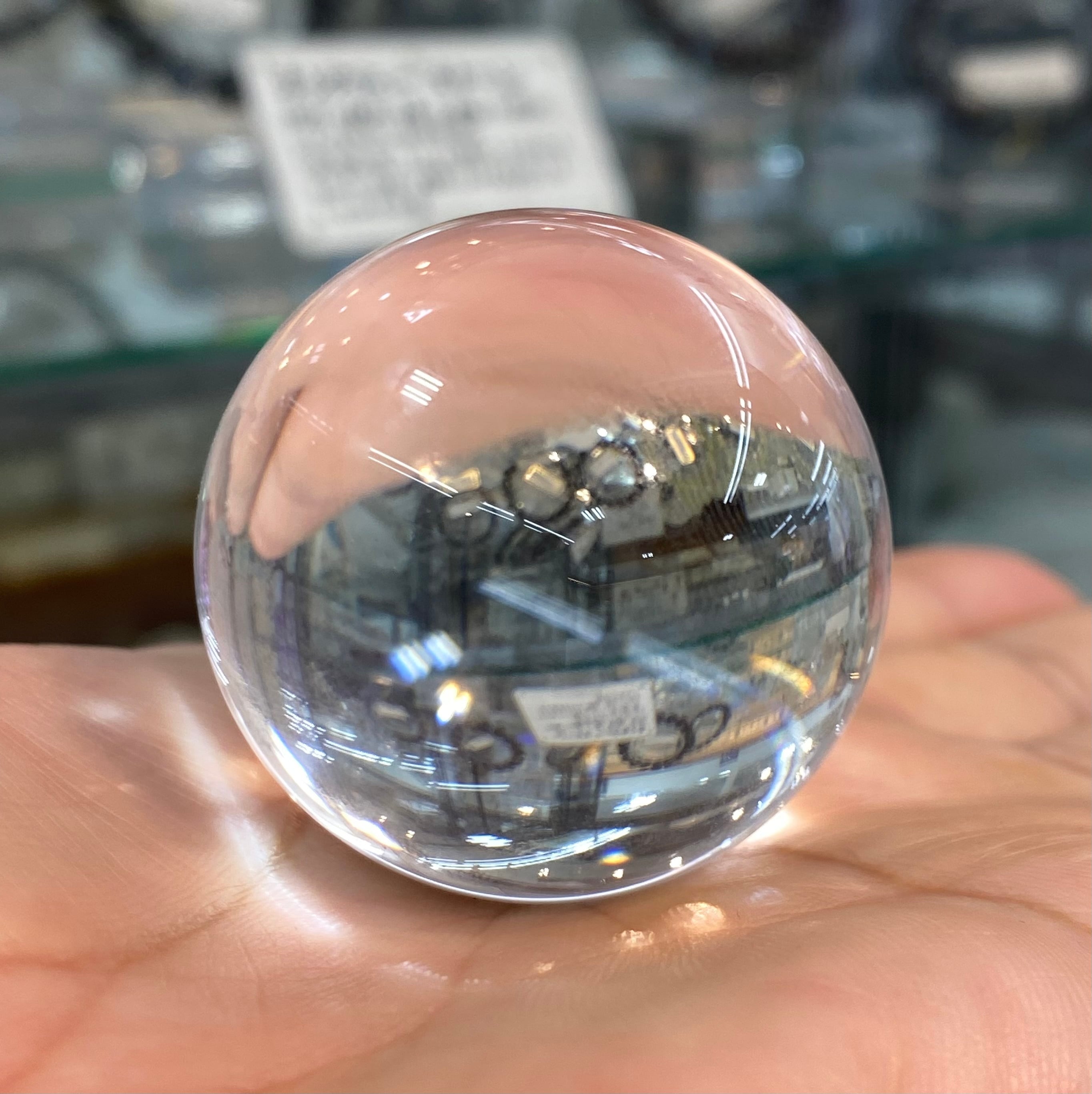 当店のAAAクラス無色透明水晶丸玉は、目視で100%無色透明無傷の天然水晶(ロッククリスタル)丸玉の事を呼びます。肉眼で内包物(極小さな気泡やクラックなど)はまったく見えません。最高級水晶玉です。