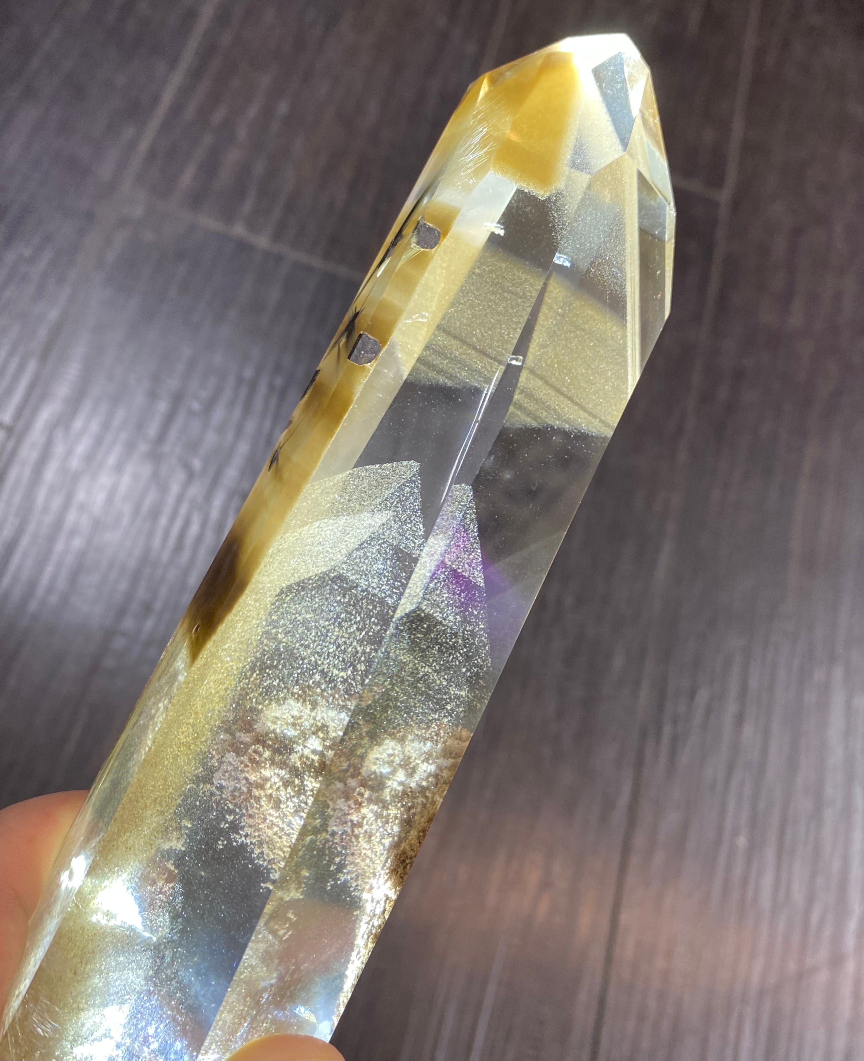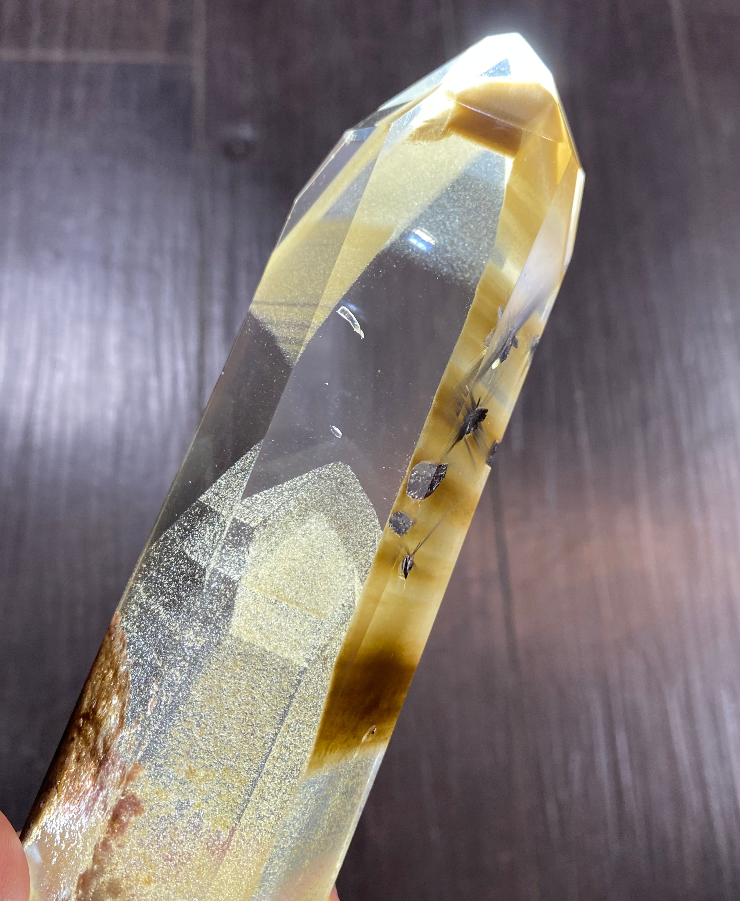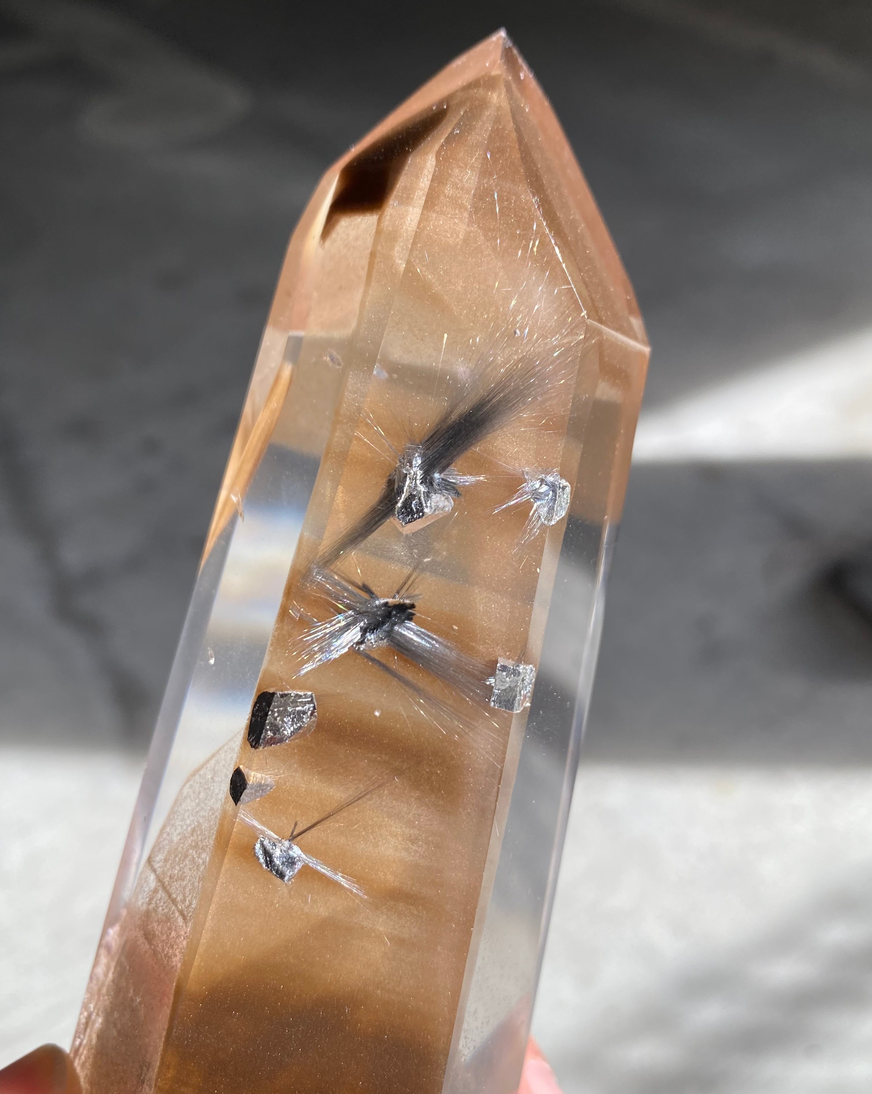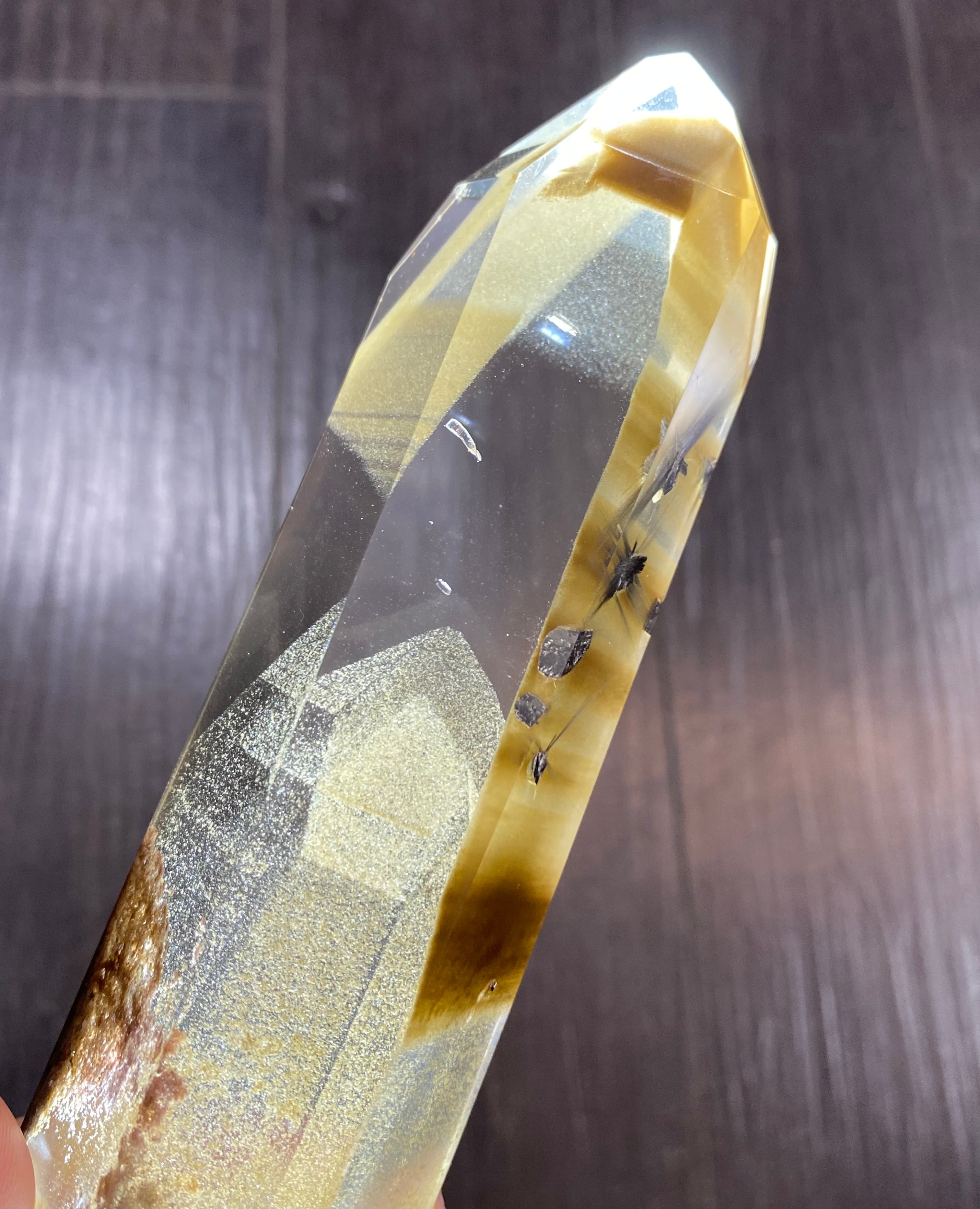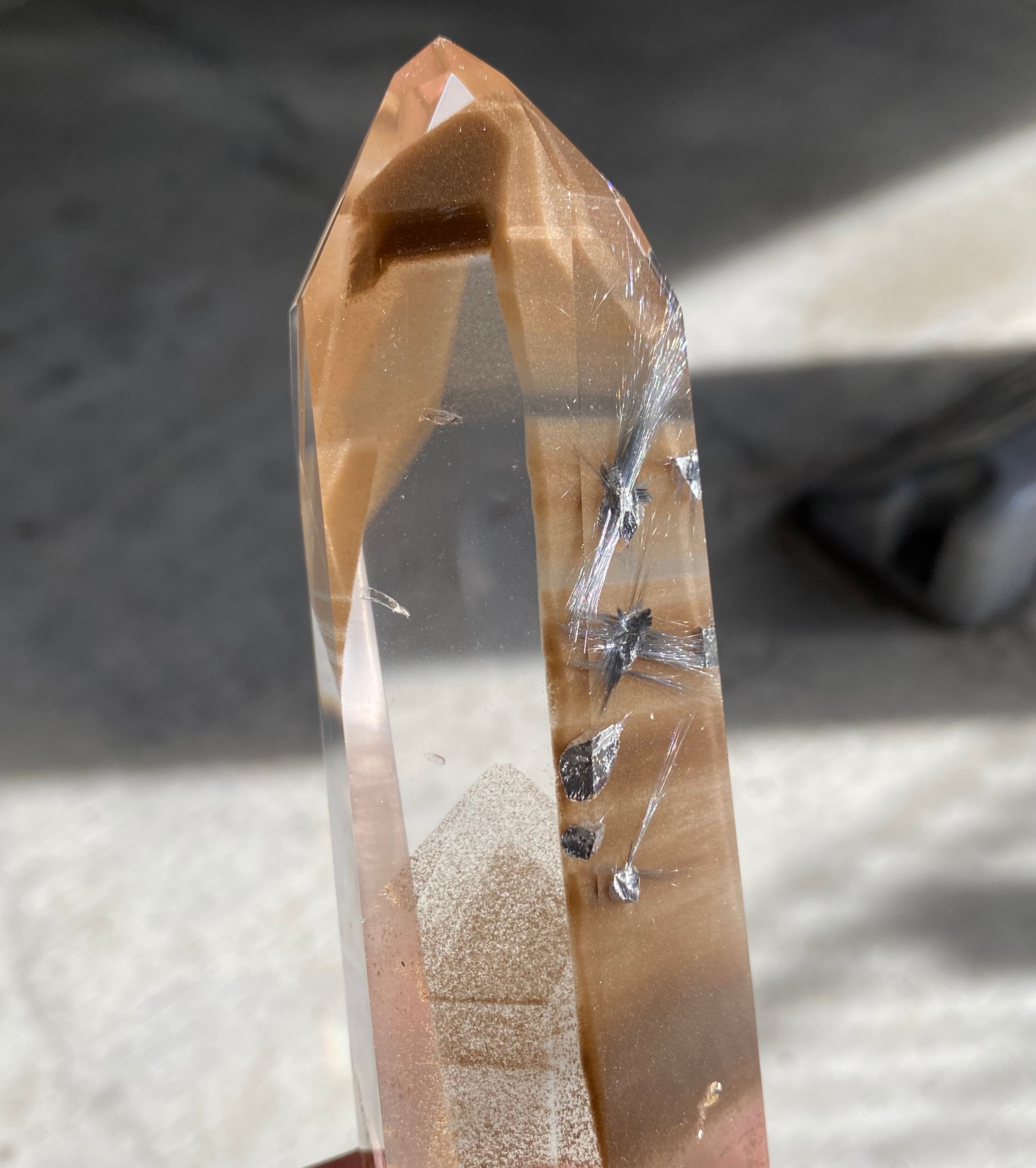 ブルッカイトルチル(プラチナルチル)入り、ブラウンファントム水晶ポイントです。磨き。最高品質♪