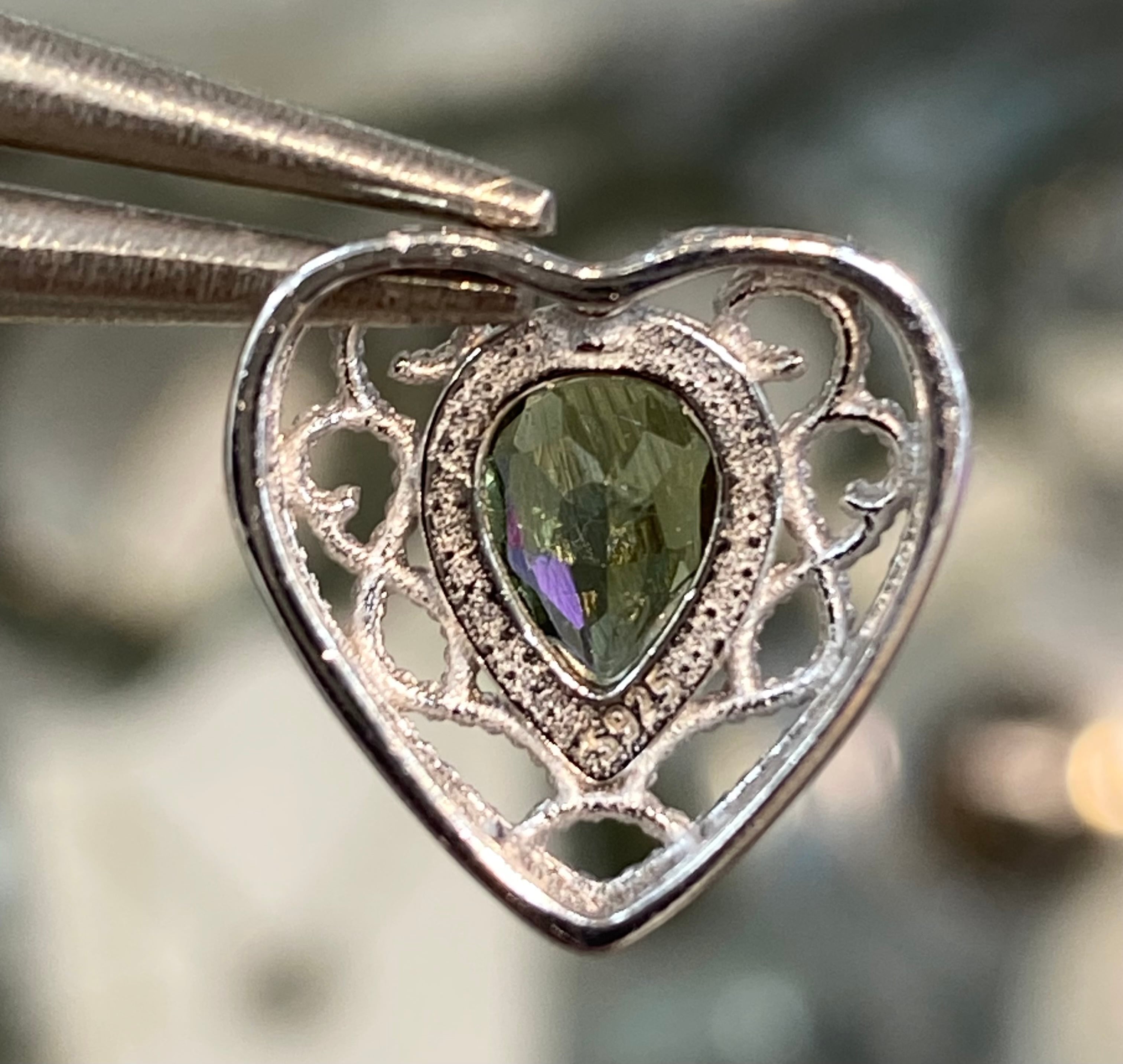 美しいフォレストグリーン色をしていまして、透かすと特にモルダバイト特有の綺麗なダークグリーン系の色合いを見せてくれます。