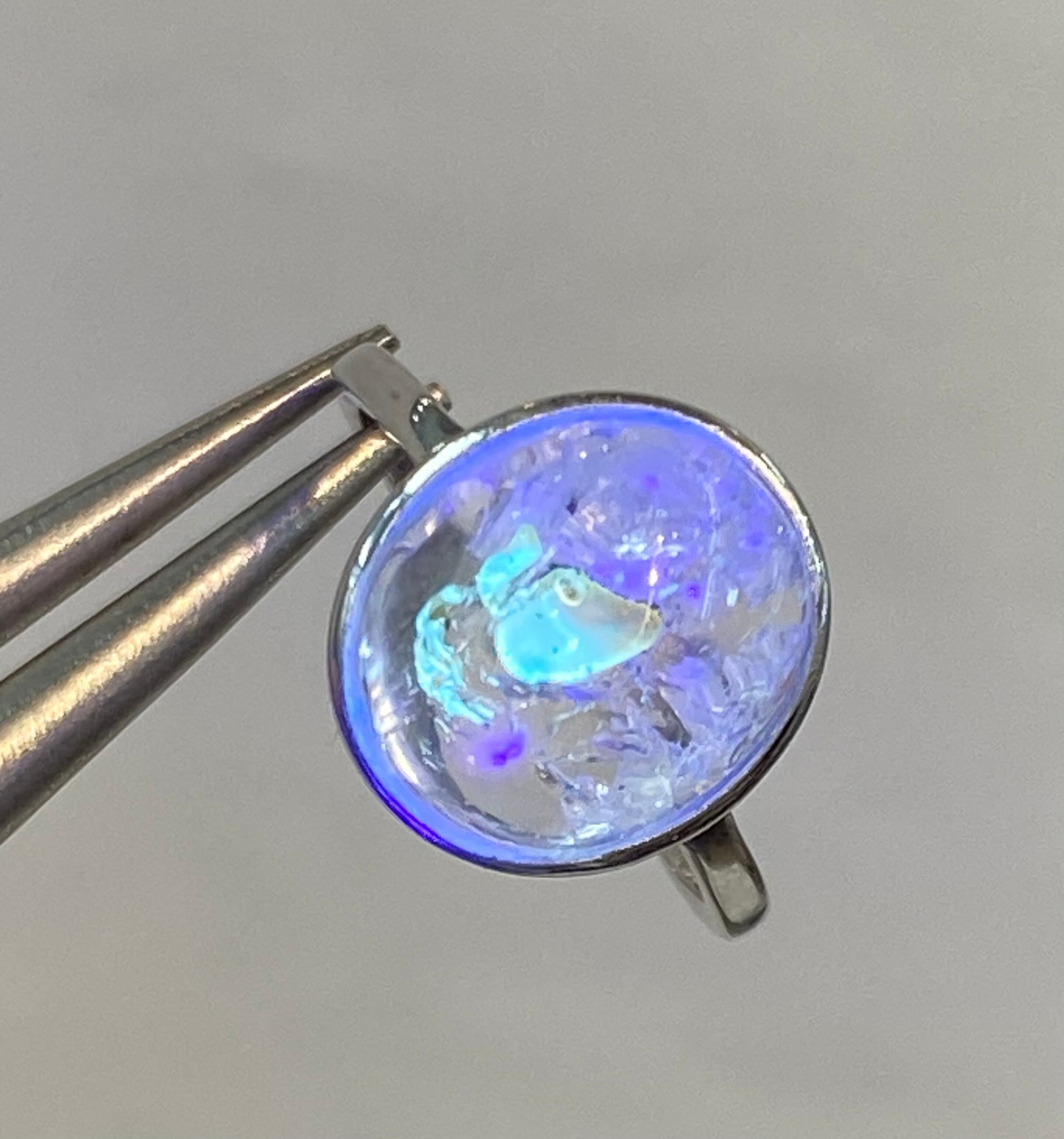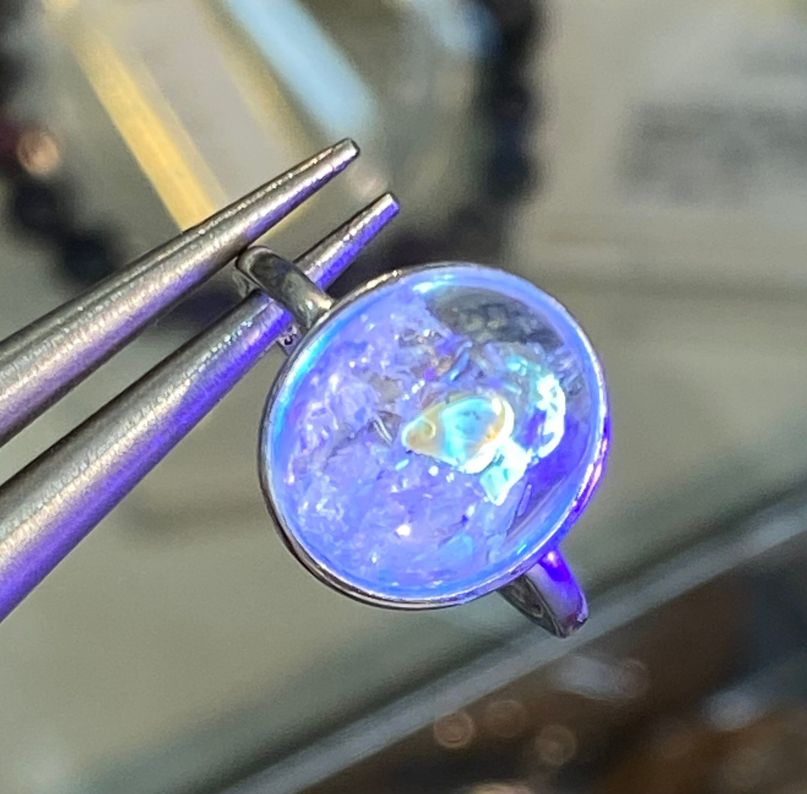 オイルインクォーツは紫外線を当てると蛍光する性質を持っているので、ブラックライトを当てると、水晶の中のオイルが反射してネオンブルーの光が浮かび上がり、幻想的で非常に美しく輝きます。