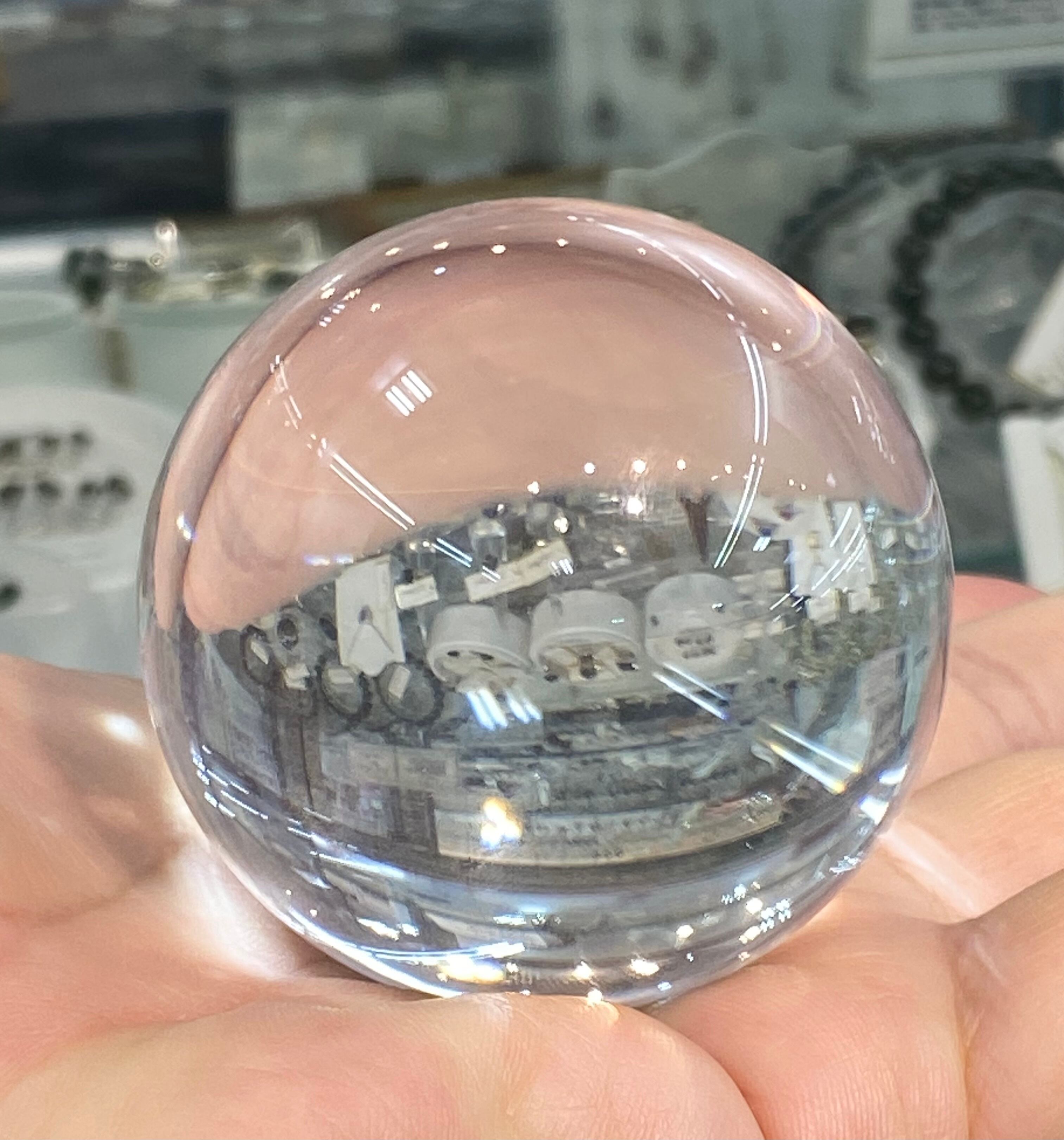 当店のAAAクラス無色透明水晶丸玉は、目視で100%無色透明無傷の天然水晶(ロッククリスタル)丸玉の事を呼びます。肉眼で内包物(極小さな気泡やクラックなど)はまったく見えません。最高級水晶玉です。