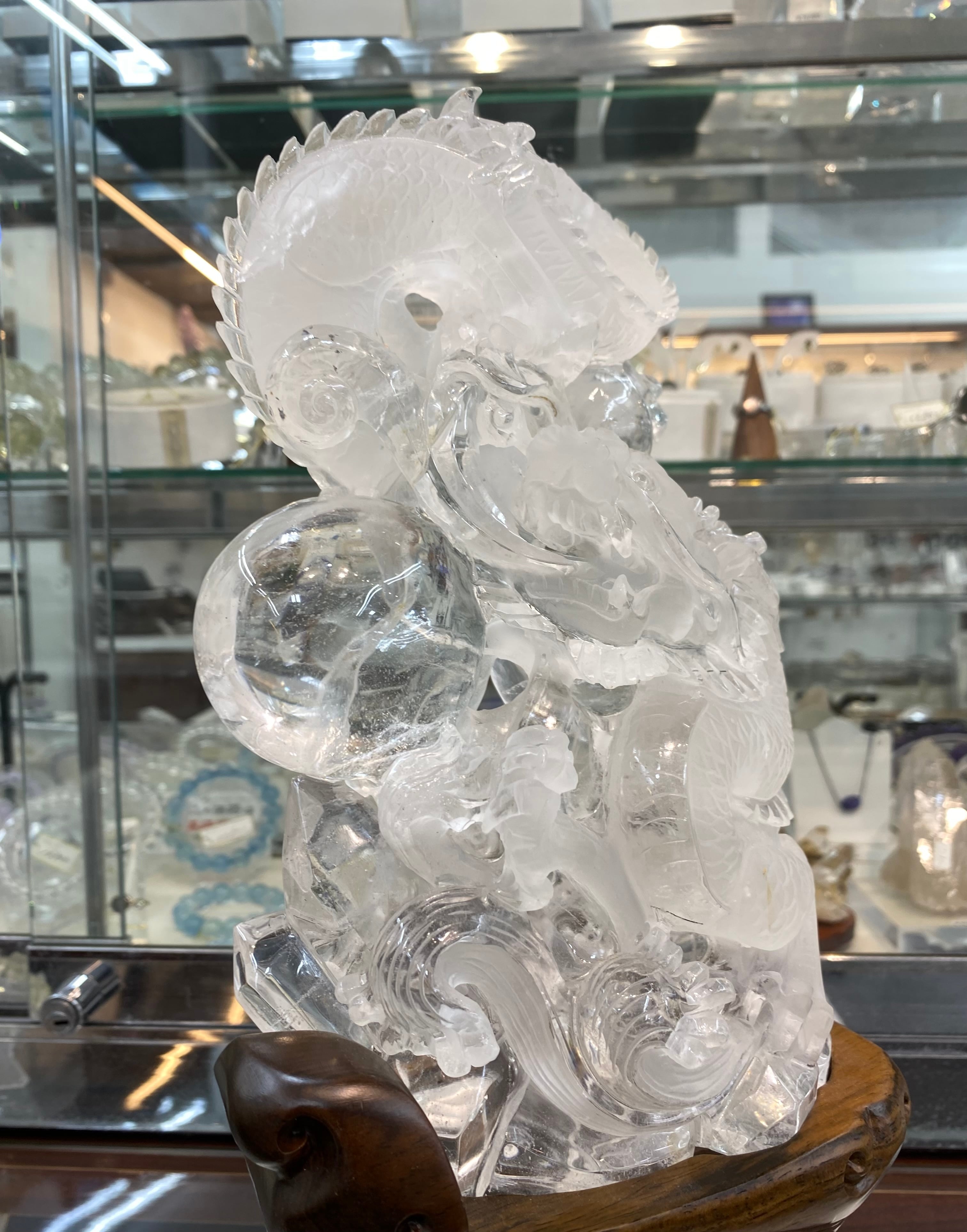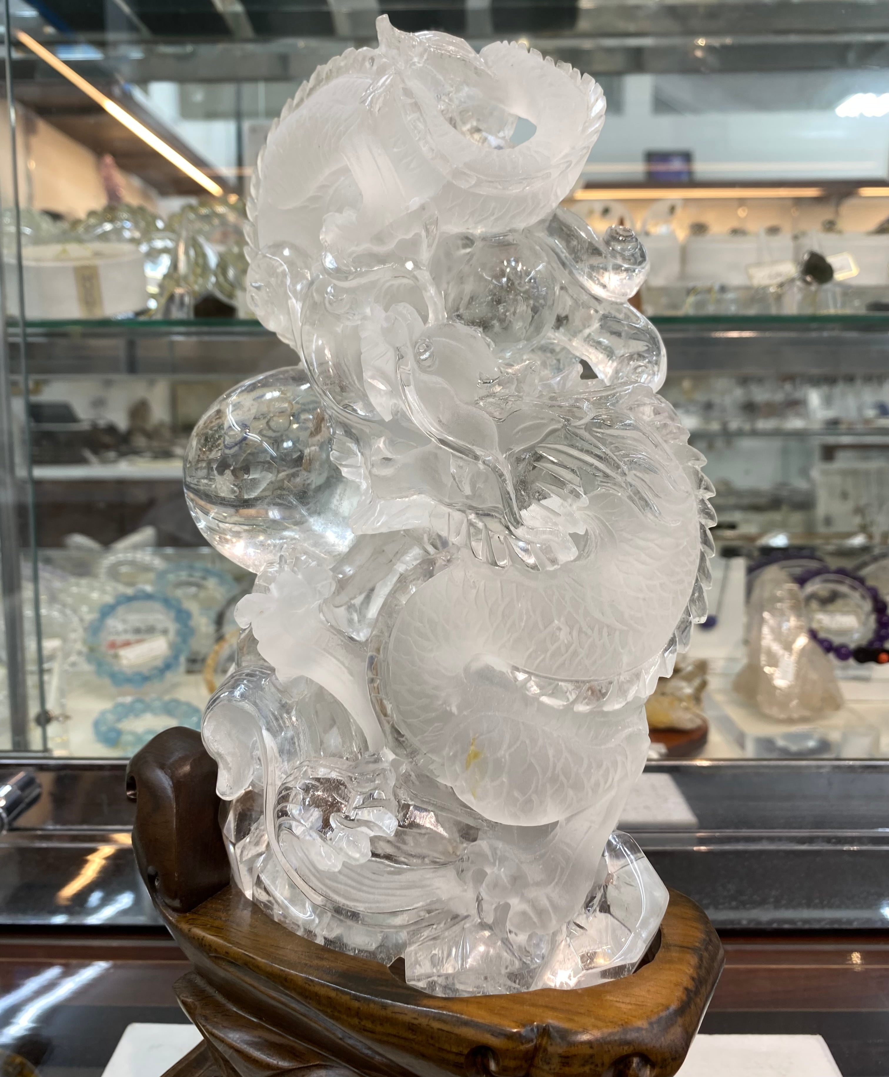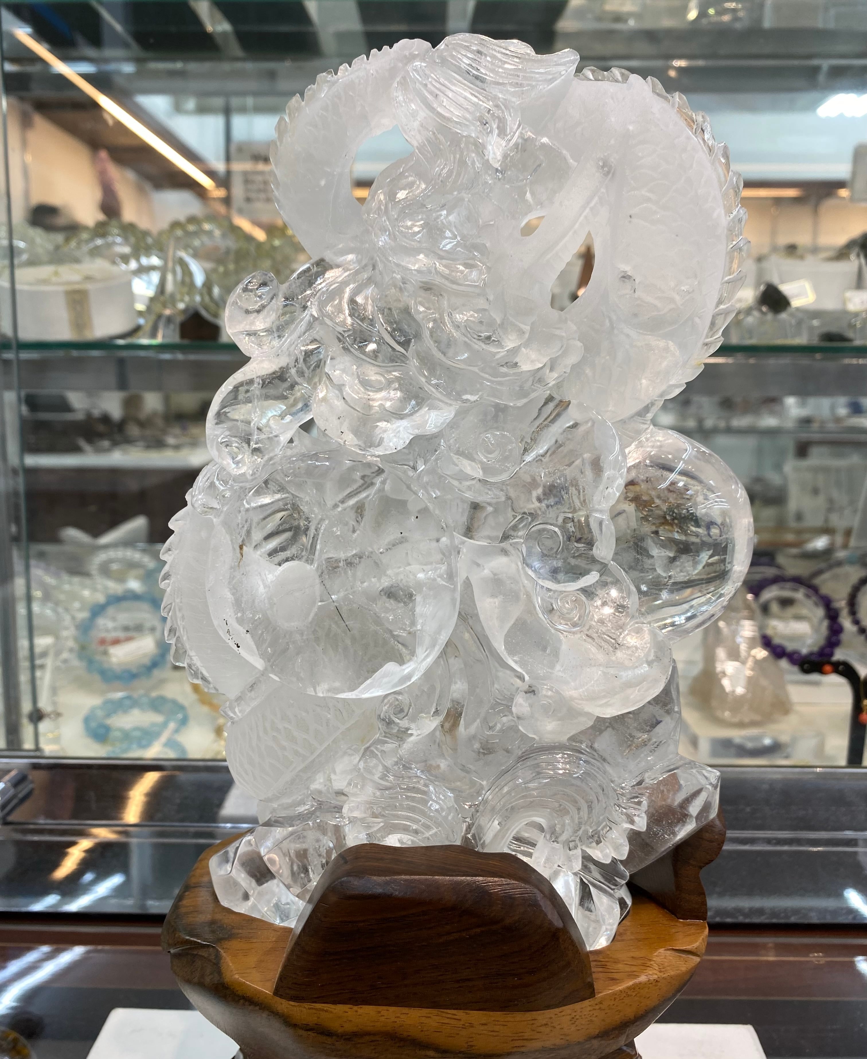 虹入り!ブラックルチル入りの天然本水晶を熟練彫刻師が丹精を込めて透かし彫りした水晶昇龍です。