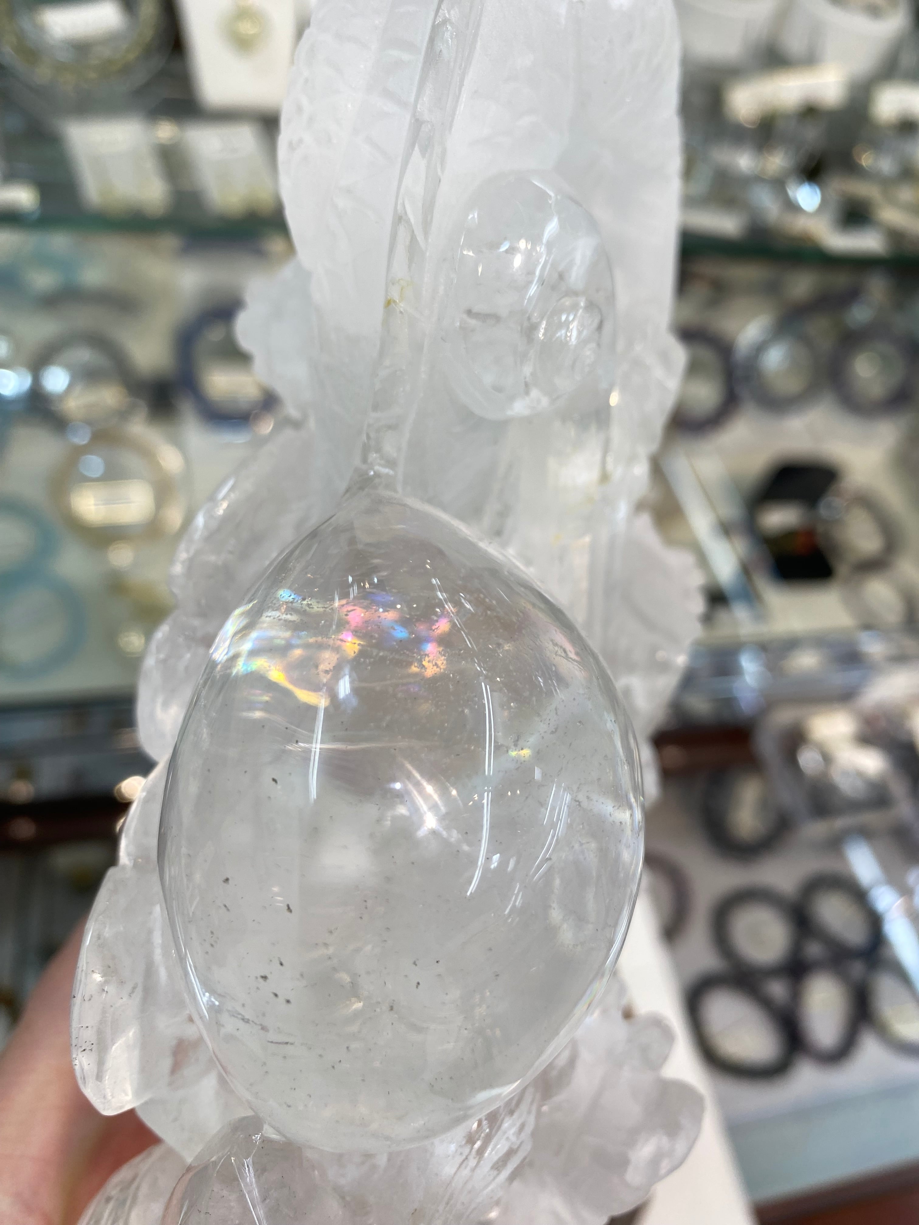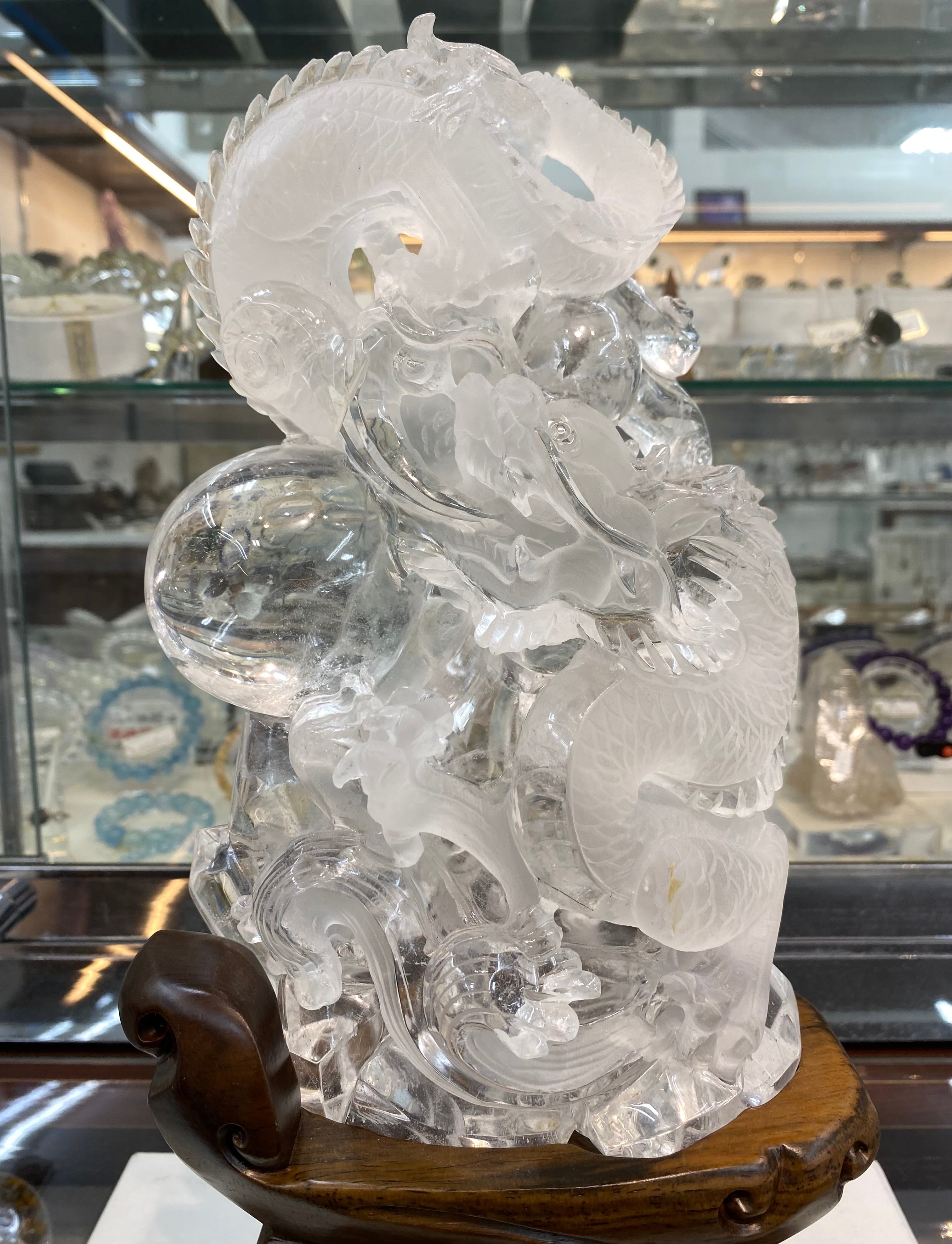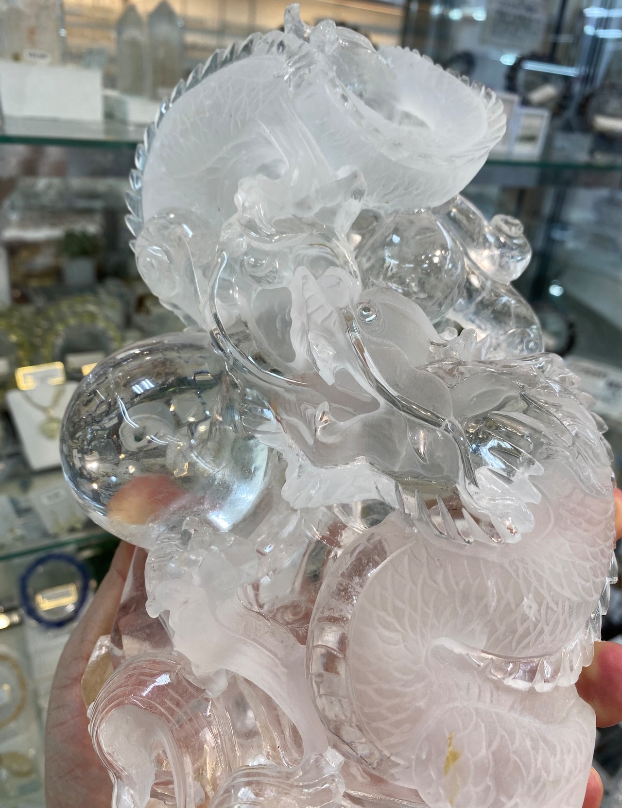 虹入り!ブラックルチル入りの天然本水晶を熟練彫刻師が丹精を込めて透かし彫りした水晶昇龍です。