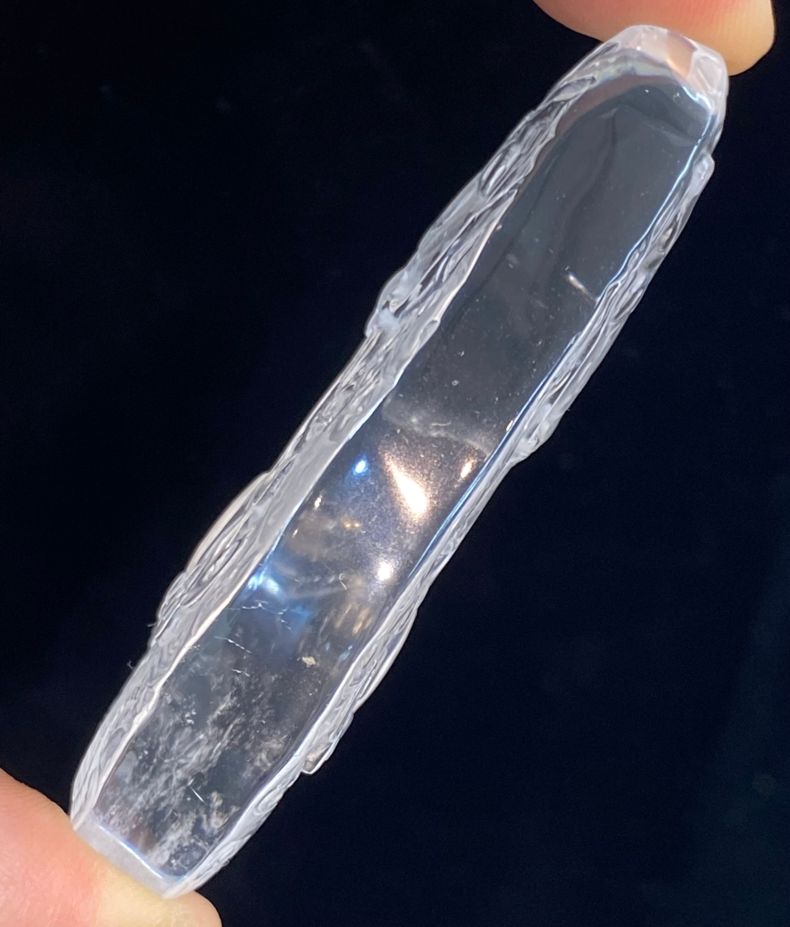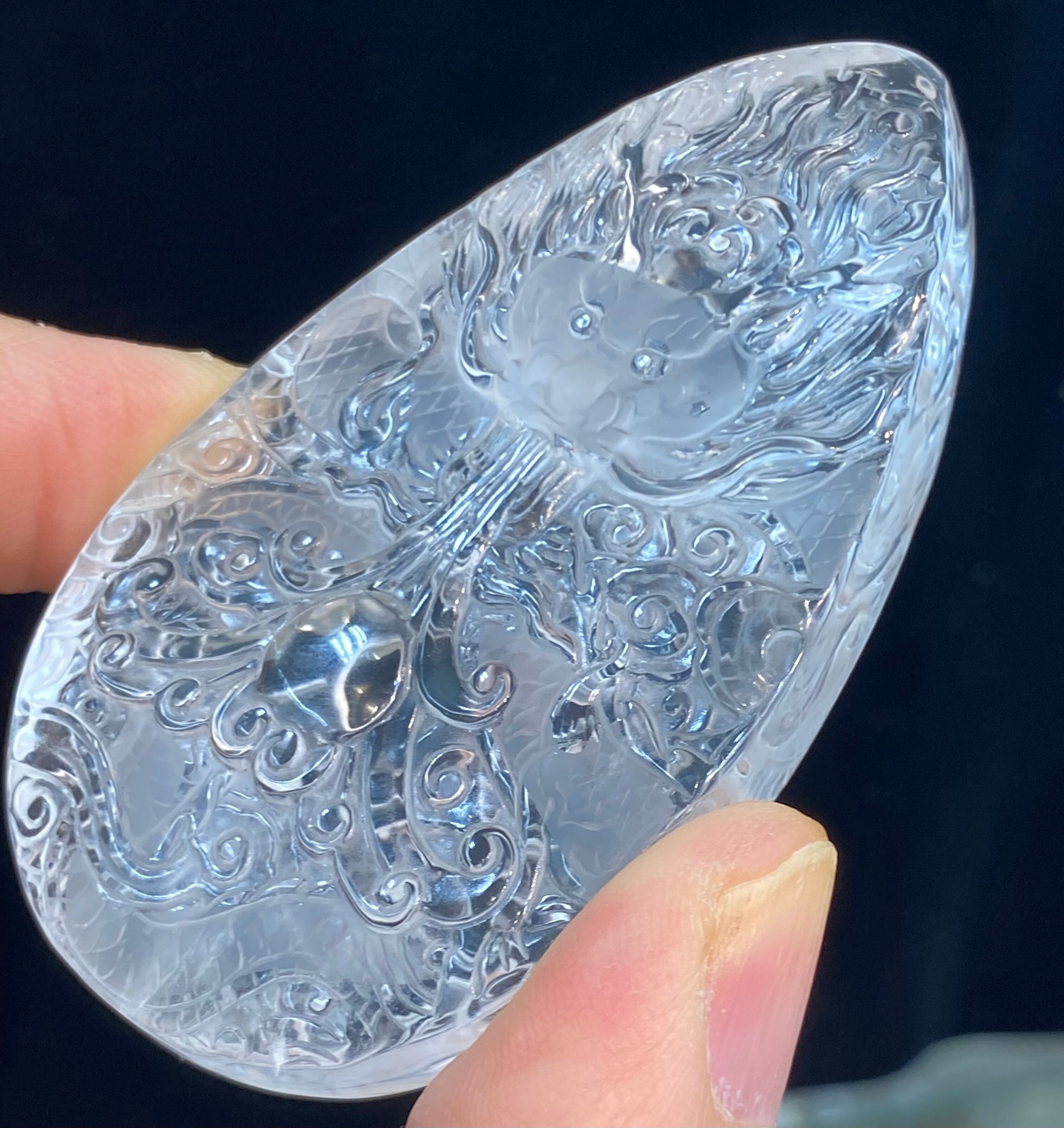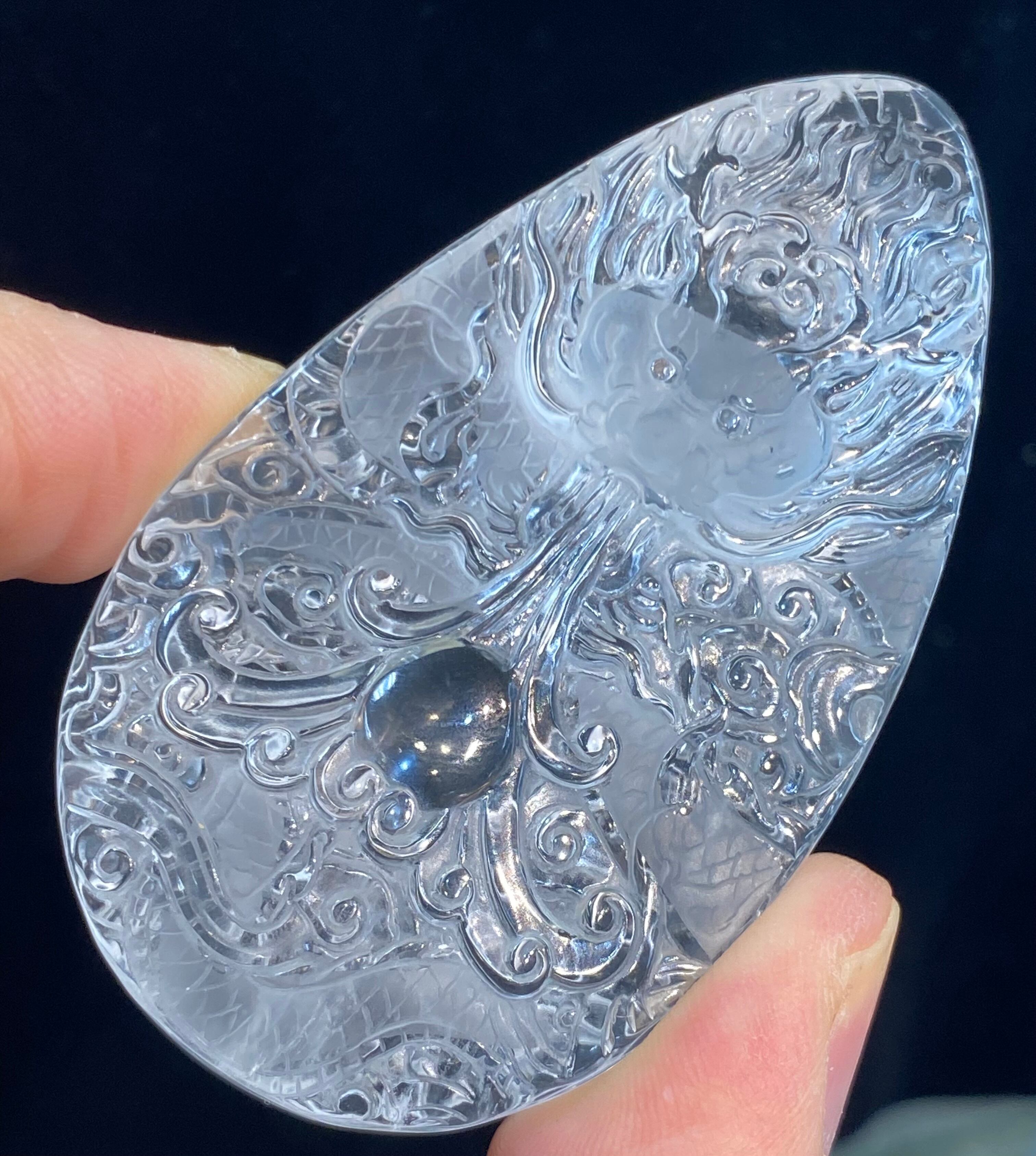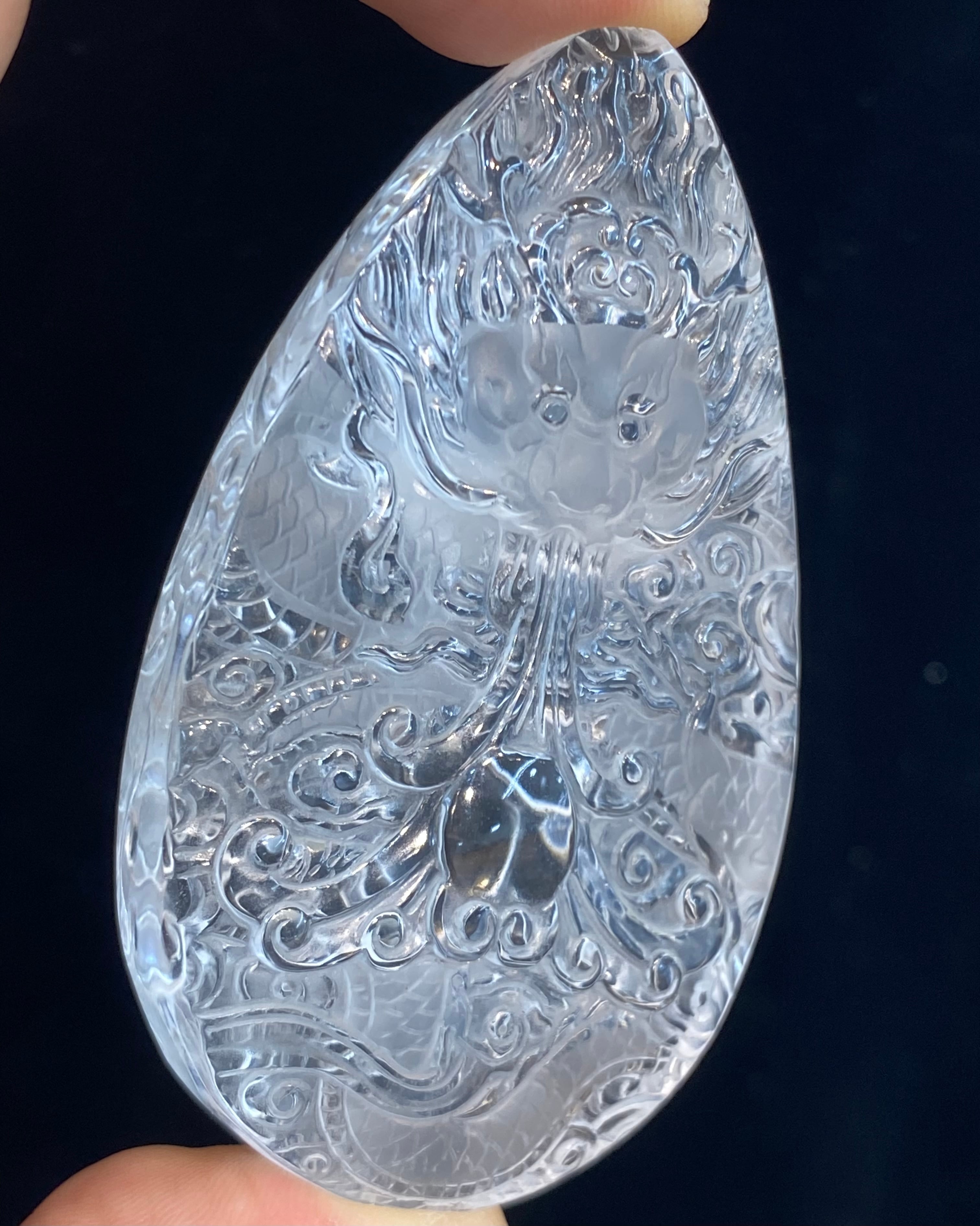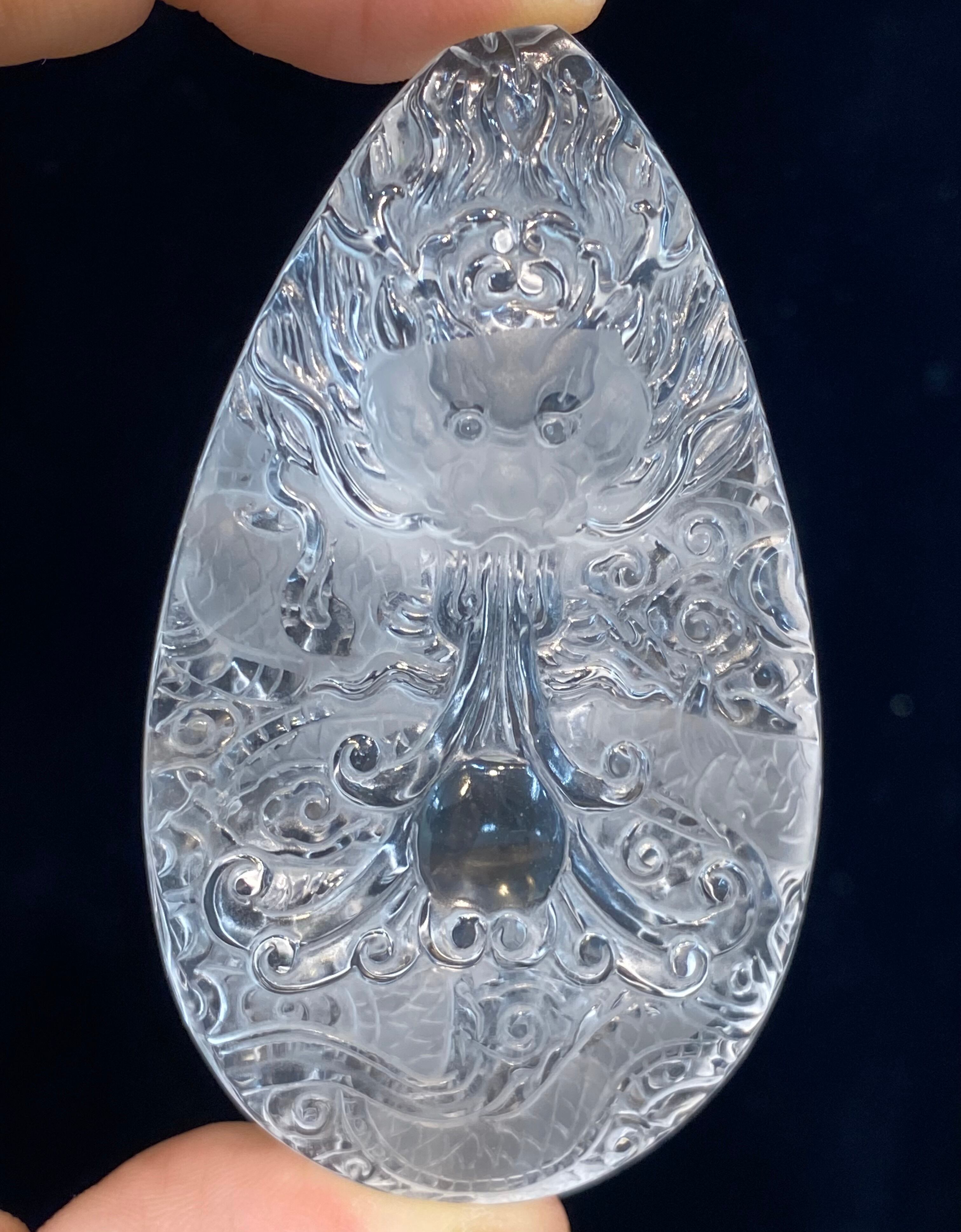 透明度抜群の天然本水晶を両面から彫刻された水晶昇り龍です。非常に繊細で精巧に彫り上げた逸品です。
