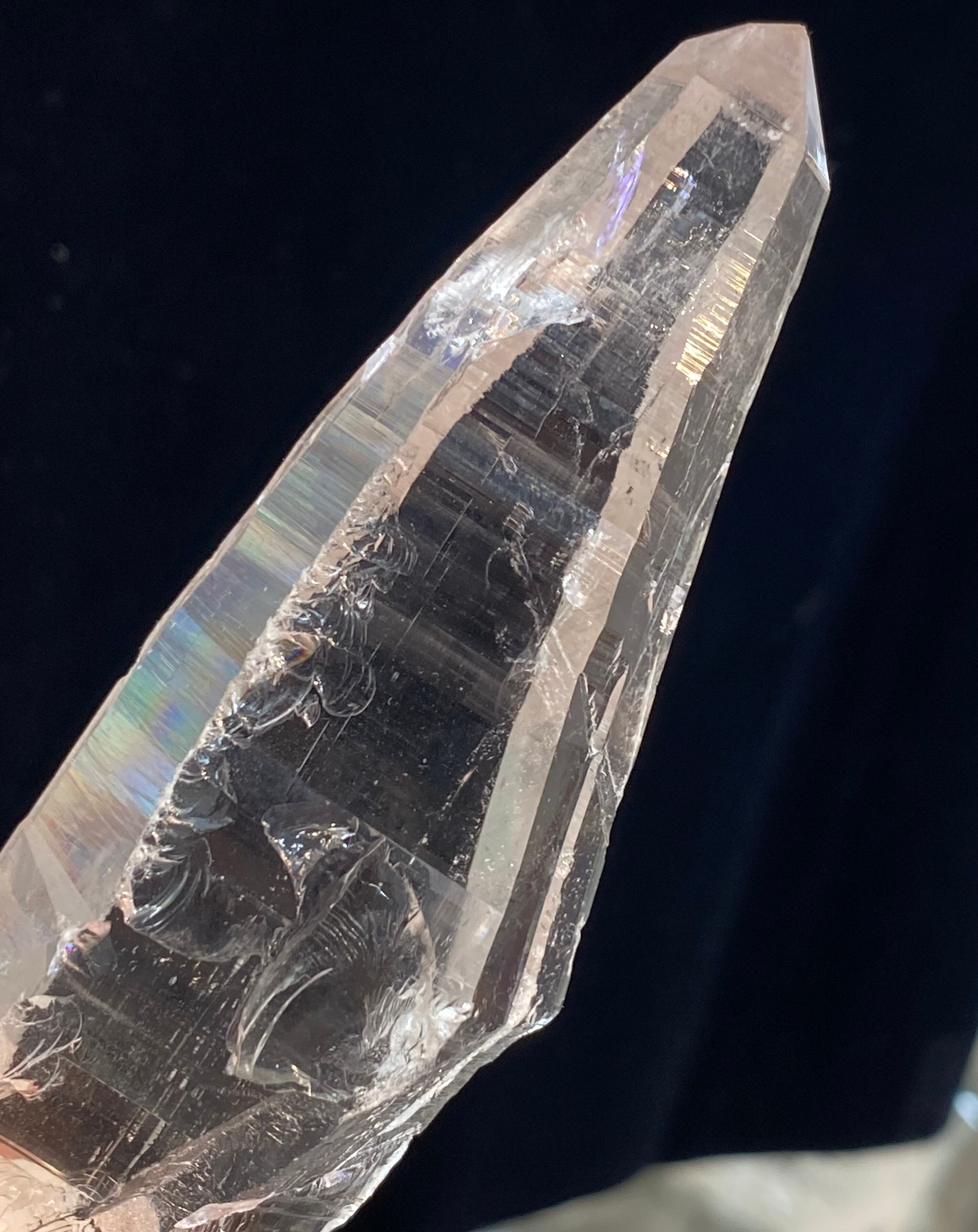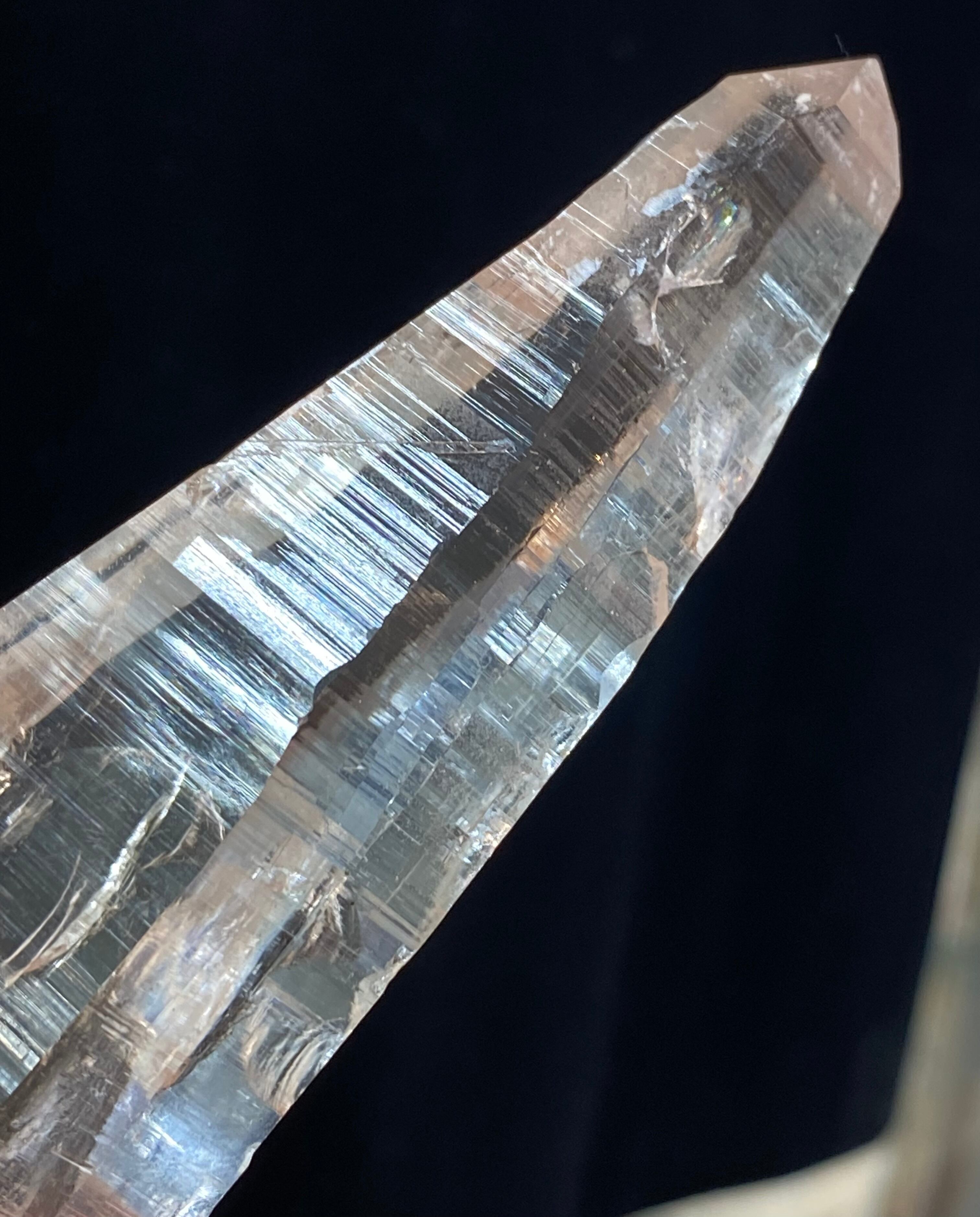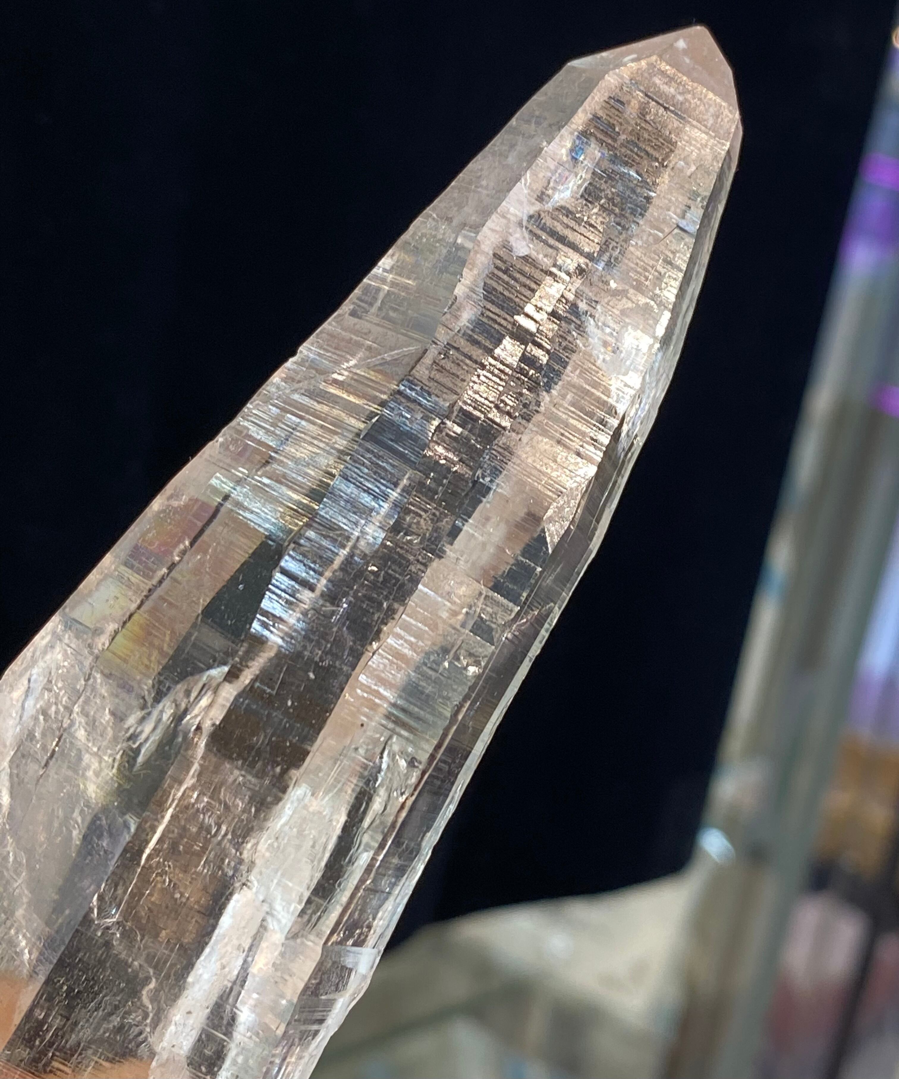 最高グレードのガネッシュ・ヒマール産ヒマラヤ水晶ナチュラルポイントです。その透明度と輝きは普通のガネッシュ・ヒマール産ヒマラヤ水晶とは一線を画す格別なものです。ガネッシュヒマールの聖なる山々が創造したこの上もない美しいヒマラヤ水晶を届け致します。底面は見事にセルフヒールドの再生結晶面で覆われ、ボディーにはヒマラヤ水晶独特の条線のテクスチャーと縦に入った接合線が何とも言えない極美の世界を創り上げています。
