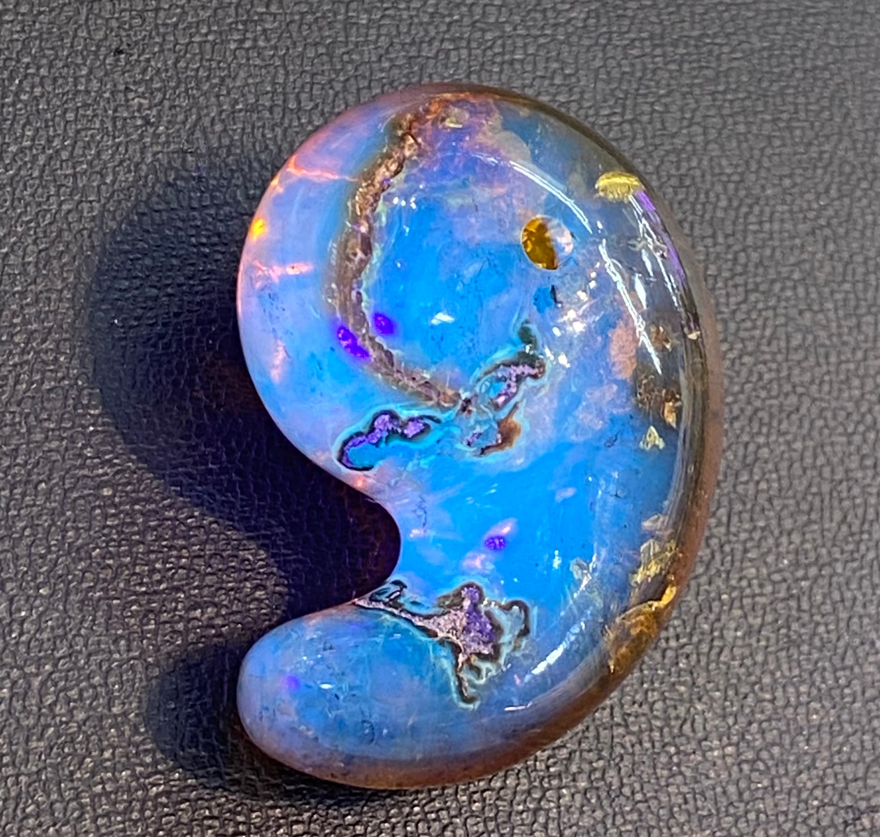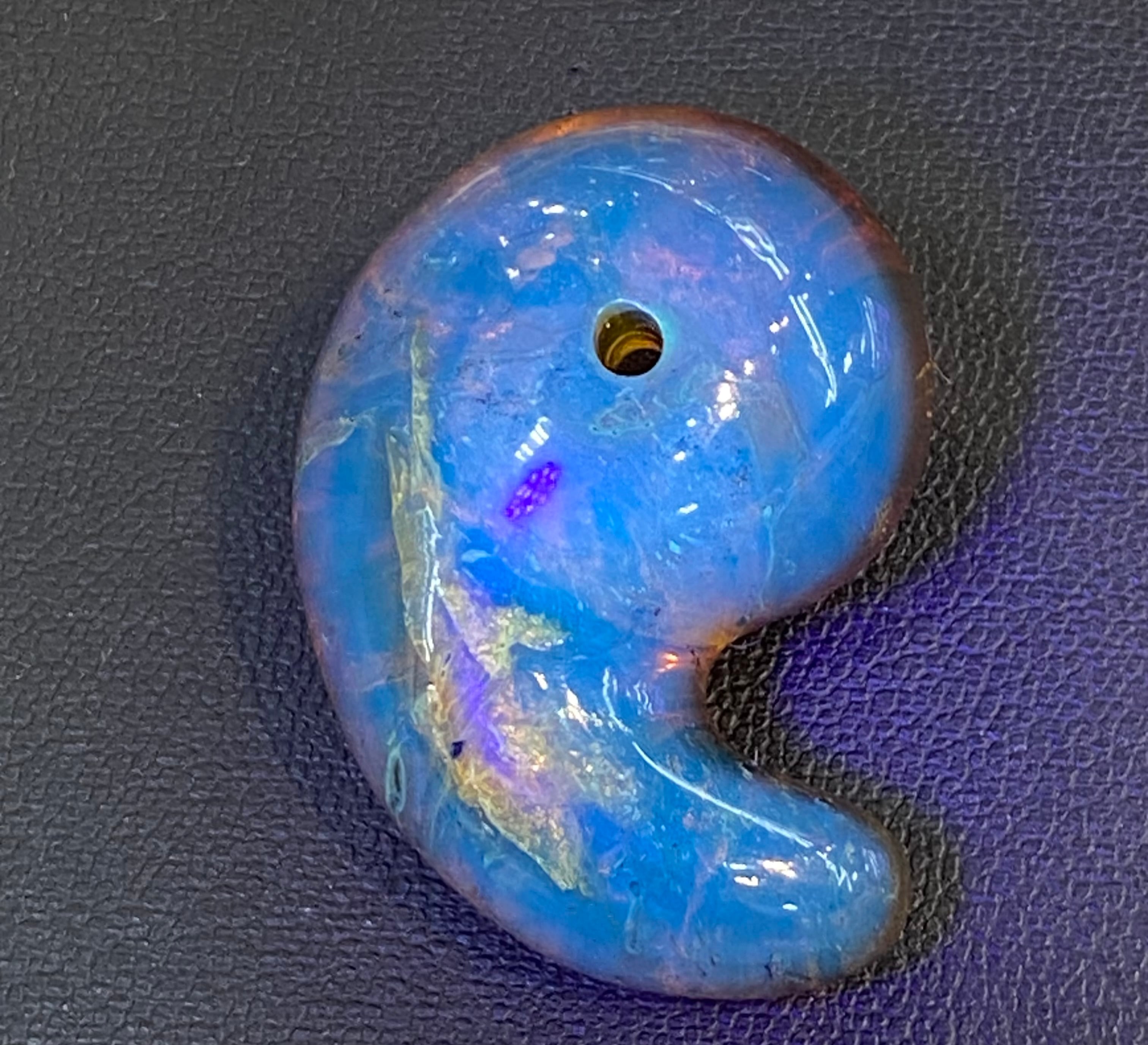 一見普通のアンバーとはなんら変りはないですが、太陽光やブラックライトなどの紫外線が当たると神秘的な美しいブルー光が表面を覆います。