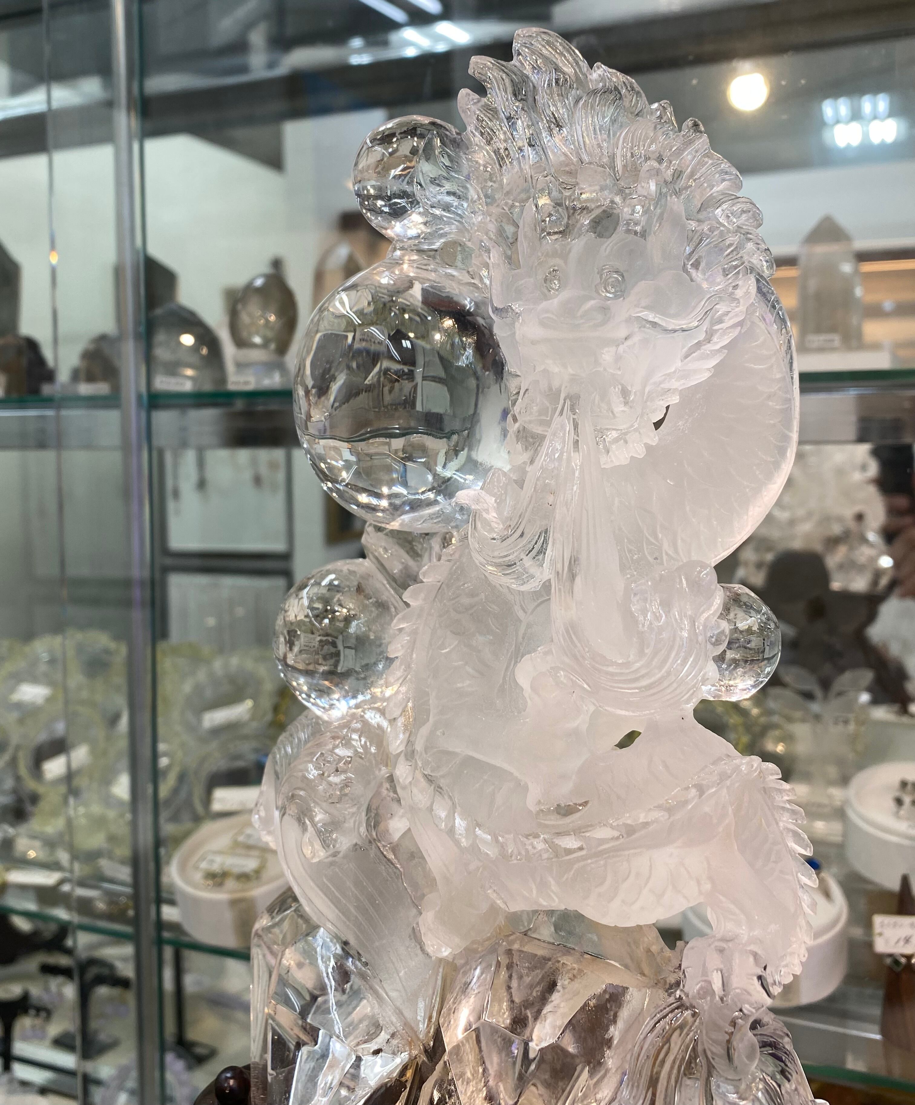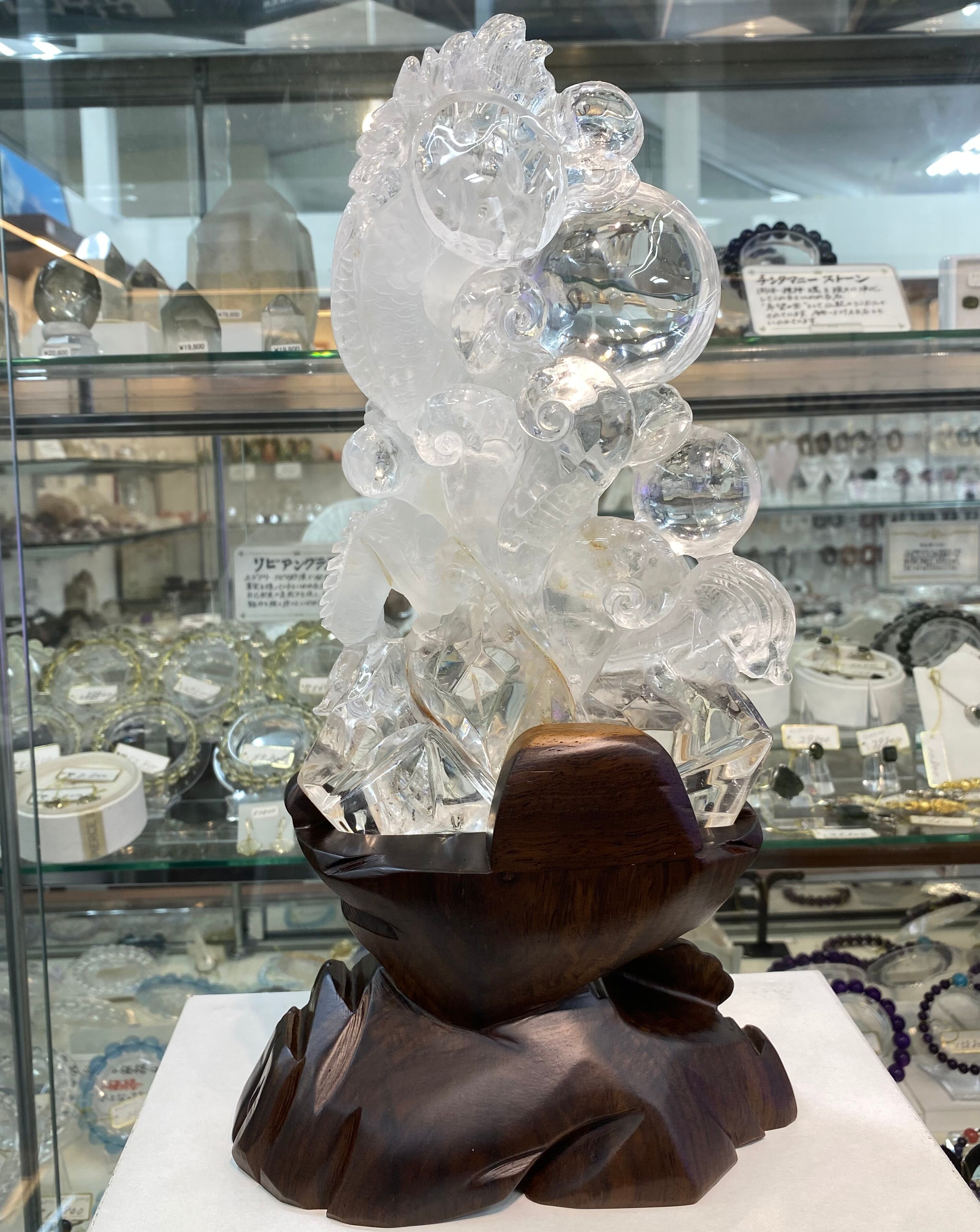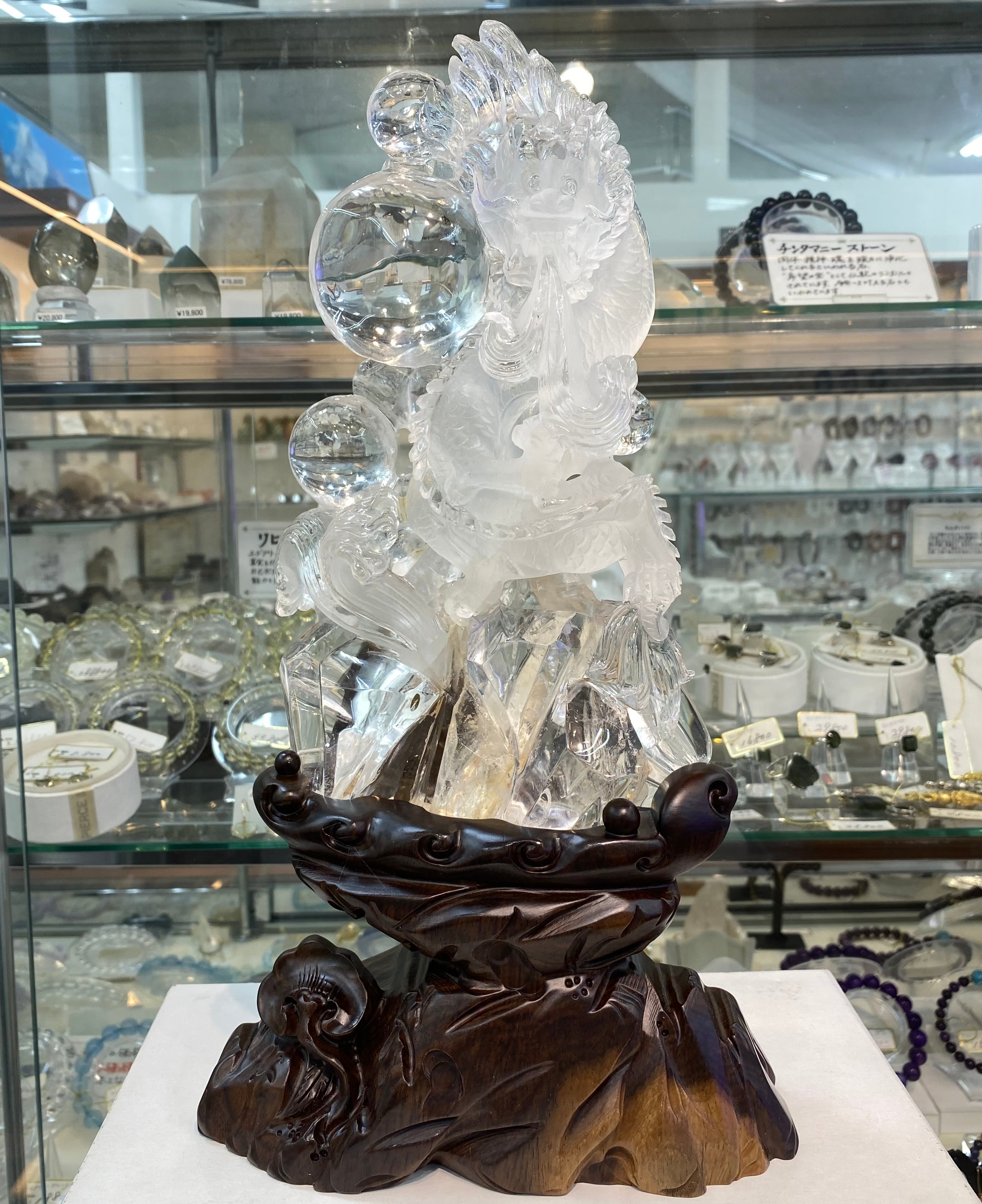 ライモナイト入りの天然本水晶を熟練彫刻師が丹精を込めて透かし彫りした水晶昇龍です。