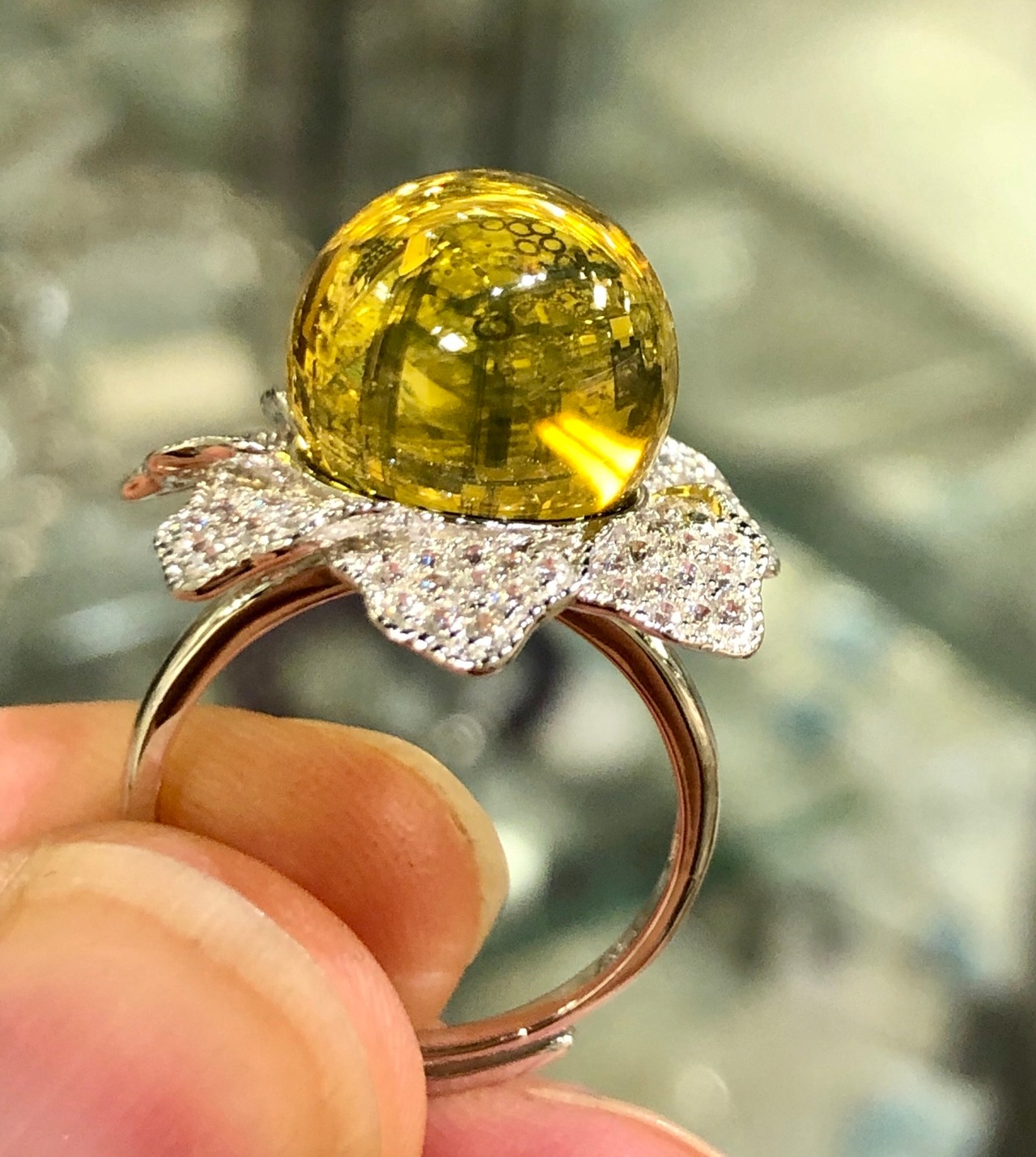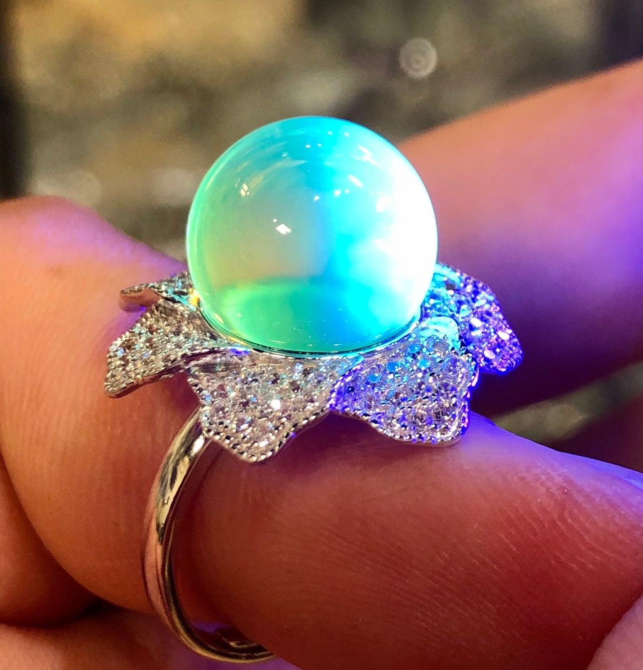 一見普通のアンバーとはなんら変りはないですが、太陽光やブラックライトなどの紫外線が当たると神秘的な美しいブルー光が表面を覆います。