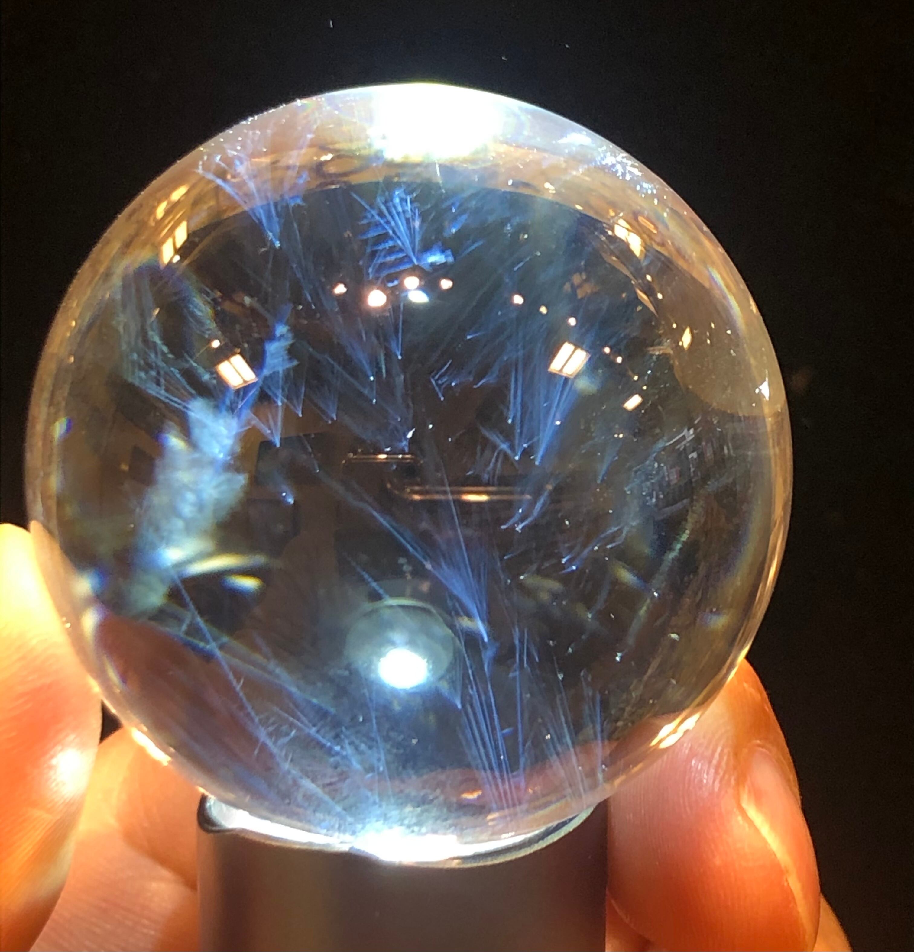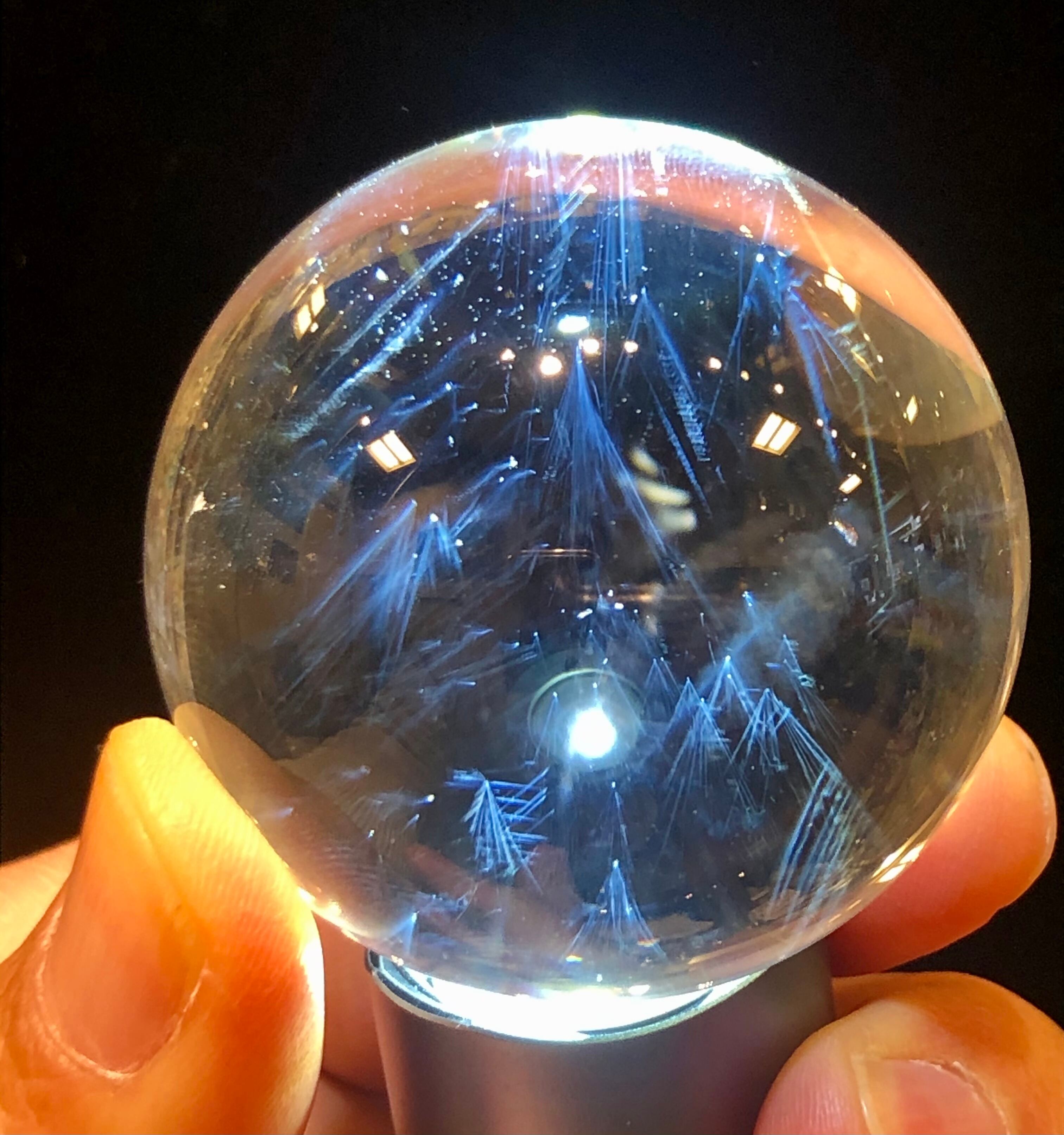 殆どロッククリスタルに近い透明度が抜群の水晶丸玉にブルーエンジェルラダーがまるで流れ星のように綺麗に結晶された究極の水晶スフィアです。直径50mm!滅多に市場に出ないレア物です!