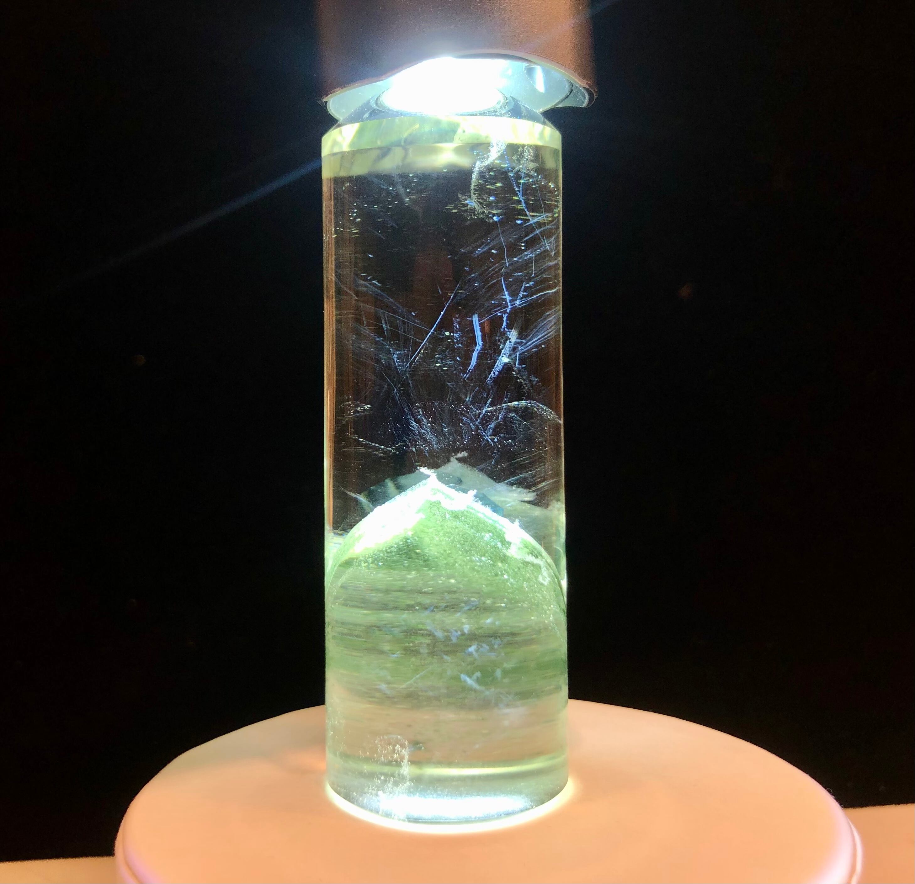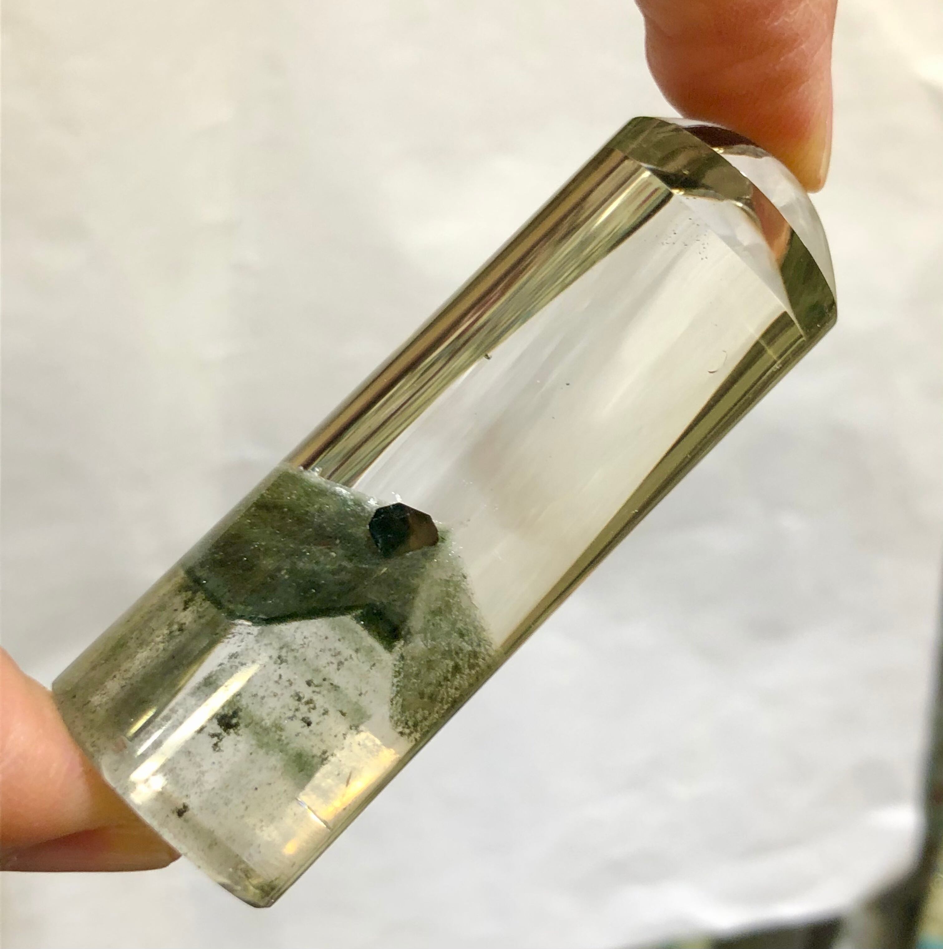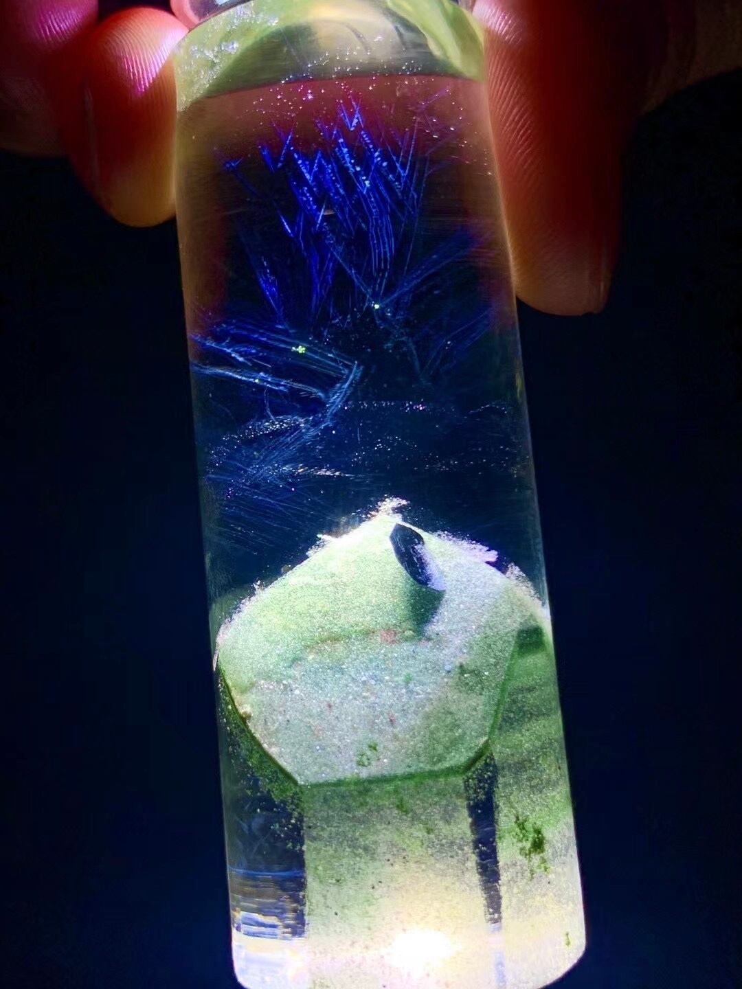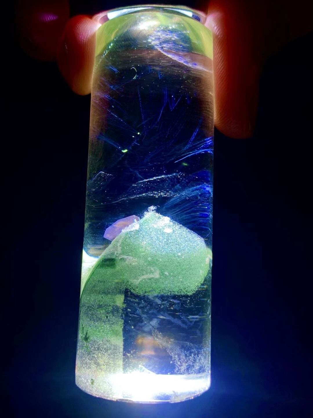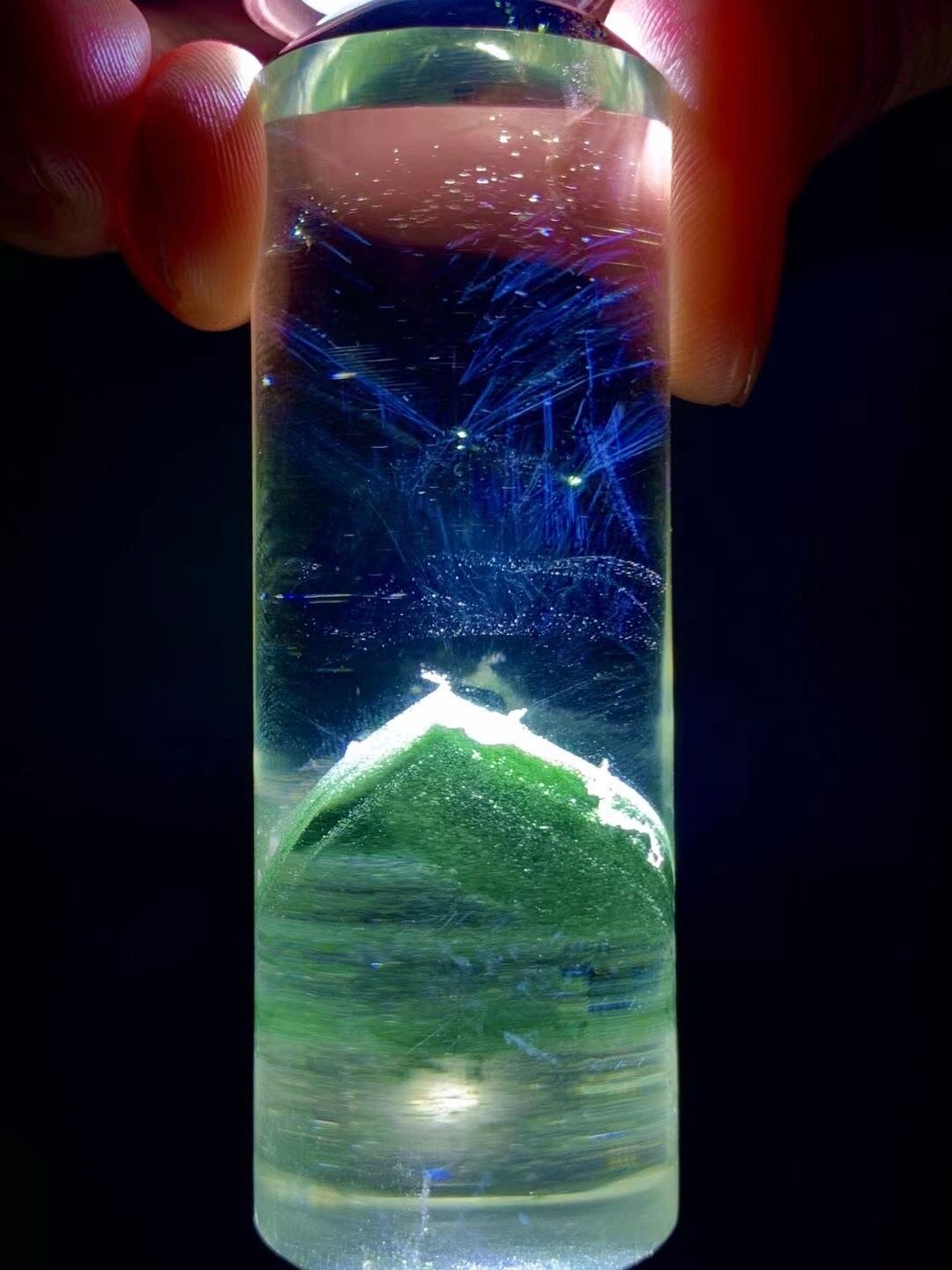 ライトを当てるとグリーンファントムの上にまるで花火のようなブルーエンジェルラダーが神秘的に浮かび上がり幻想的な景色が見られます。ファントムの下の方にラダーが入っており、ファントムのファーセットに大きなヘマタイトが鎮座してます。滅多に市場に出ないレア物をコレクションにどうぞ!