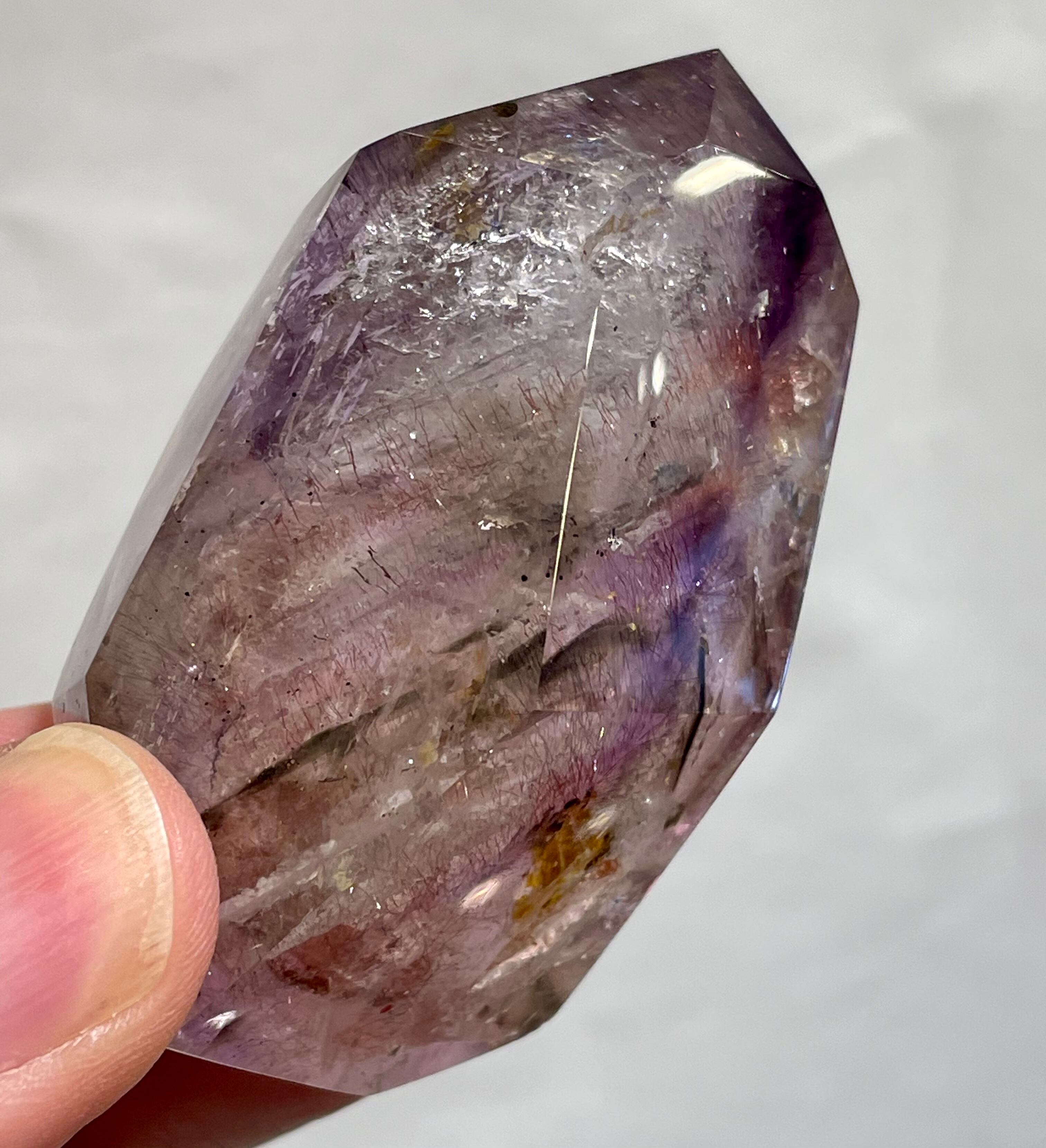 水晶を傾けて見るとレピドクロサイトが花びらのような流れ、至るところに虹が入って非常に綺麗です。