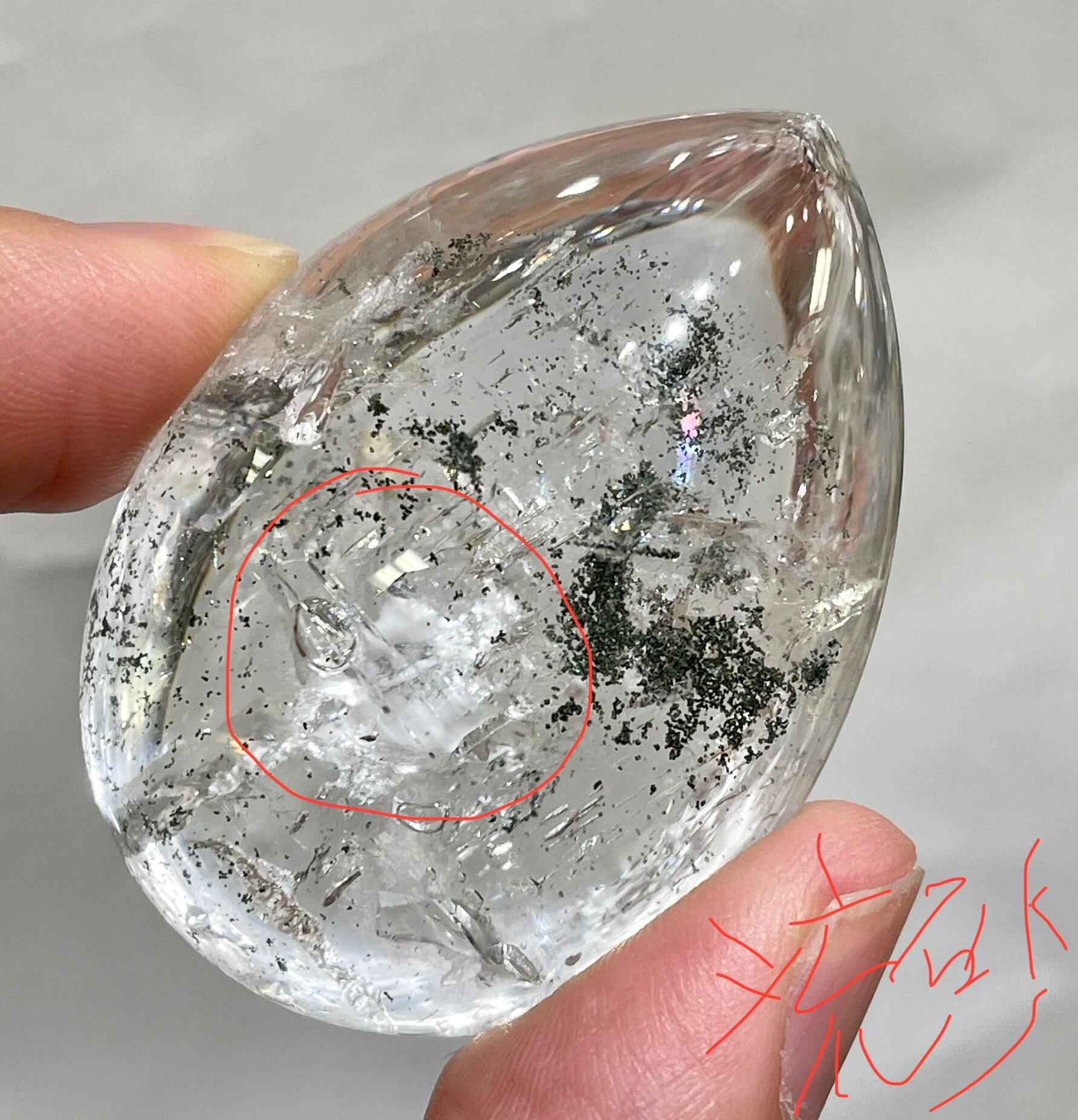 水晶の中でも強靭なパワーを持つのが水入り水晶と言われ、太古の水が閉じ込められたものは大変貴重で「ウォータードロップクォーツ」「ウォーターインクォーツ」と呼ばれ、特別視されています。窪みに閉じ込められたその水は、何千年前か何億年前のものだといわれております。