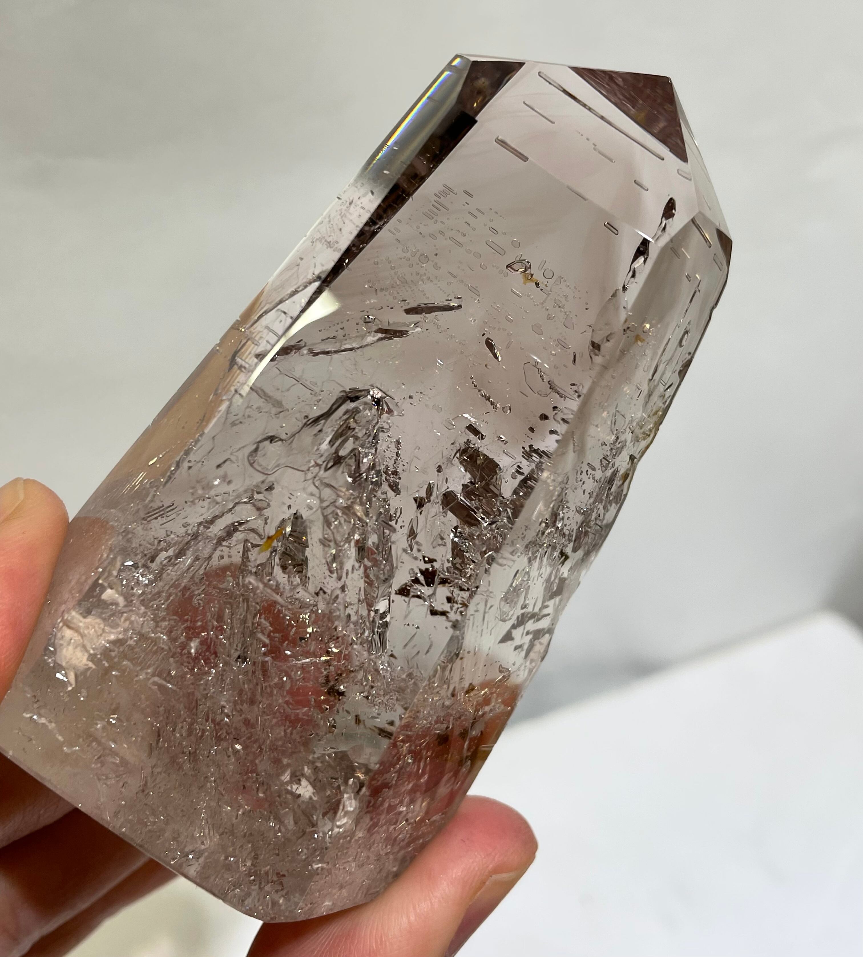 このエレスチャルポイントは、非常に高い光沢感と透明感が特徴で、内部に見られる骸晶や形など、エレスチャルの見本とも言える形状です。