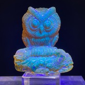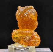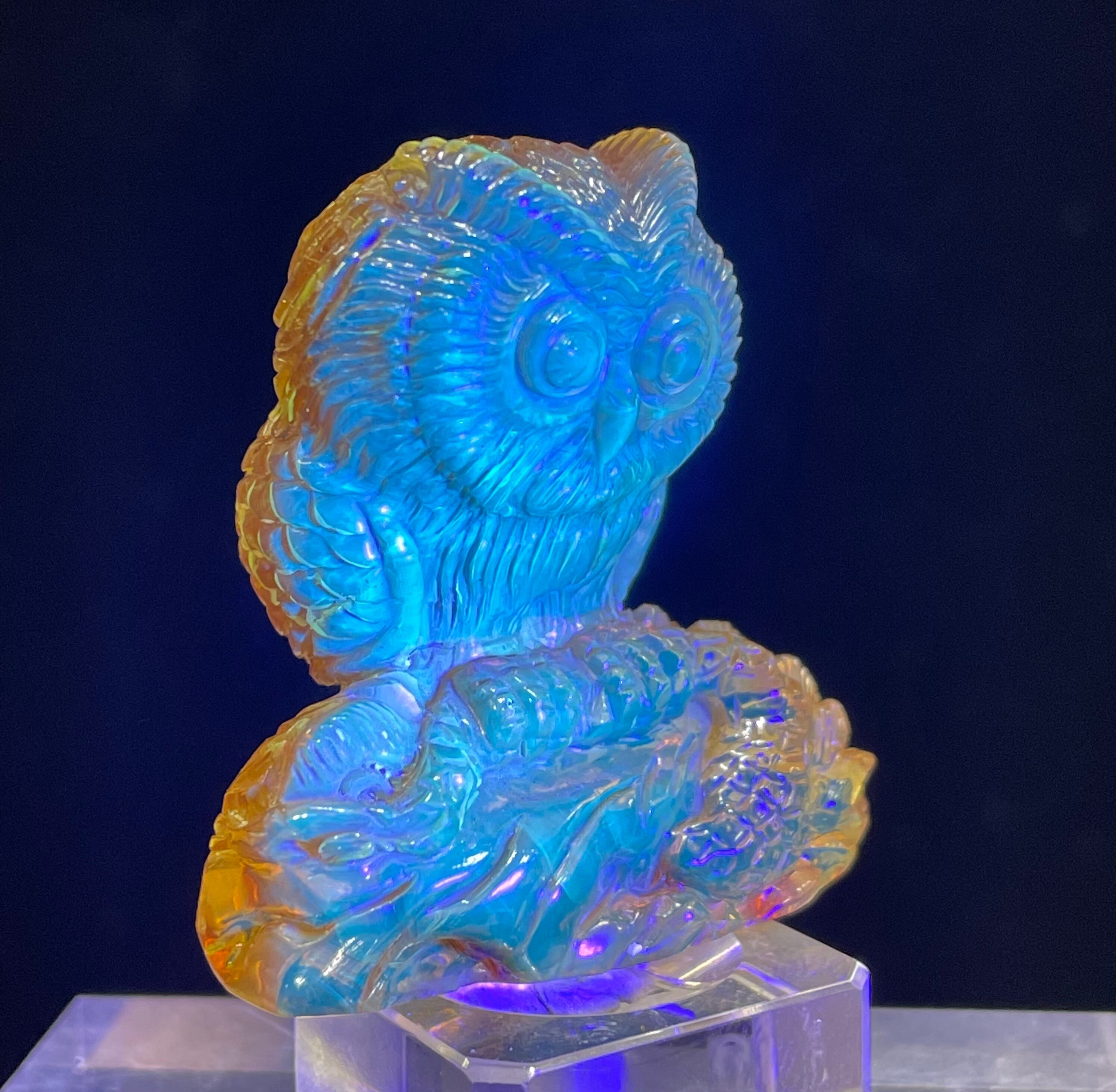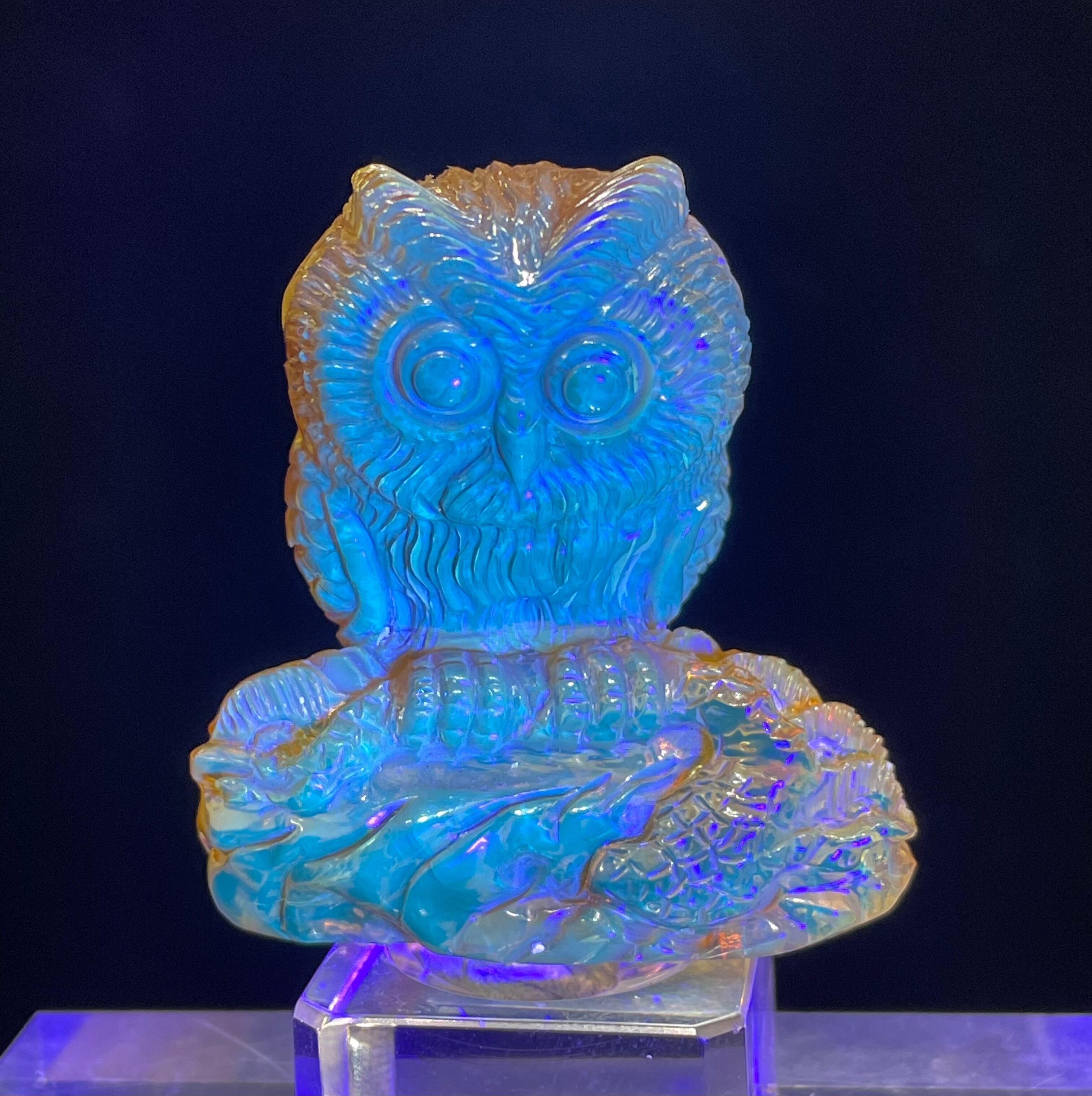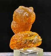 ドミニカ共和国産、天然ブルーアンバー(琥珀)を一流の彫刻師が丹精を込めて彫刻したフクロウです。一刀彫り。