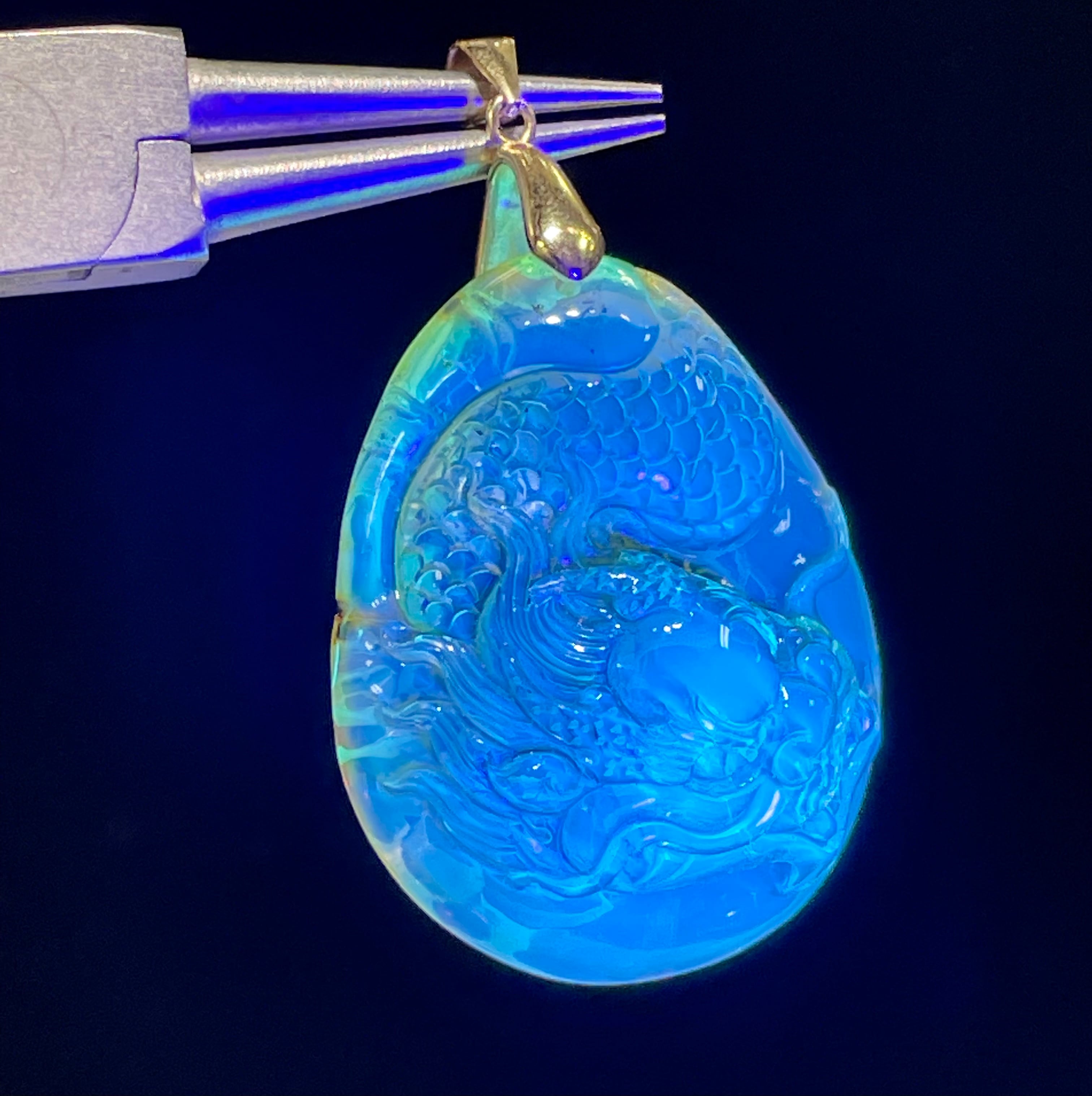 原因は火山の影響で琥珀の中に微量の金属のイオンが含まれ、このような蛍光効果のブルーになるそうです。