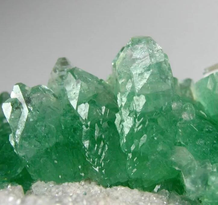 白い沸石に覆われた母岩の上に、とてもクリアーで、光沢の強い、美しいグリーンの結晶が印象的な極上の逸品です。