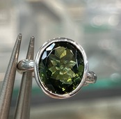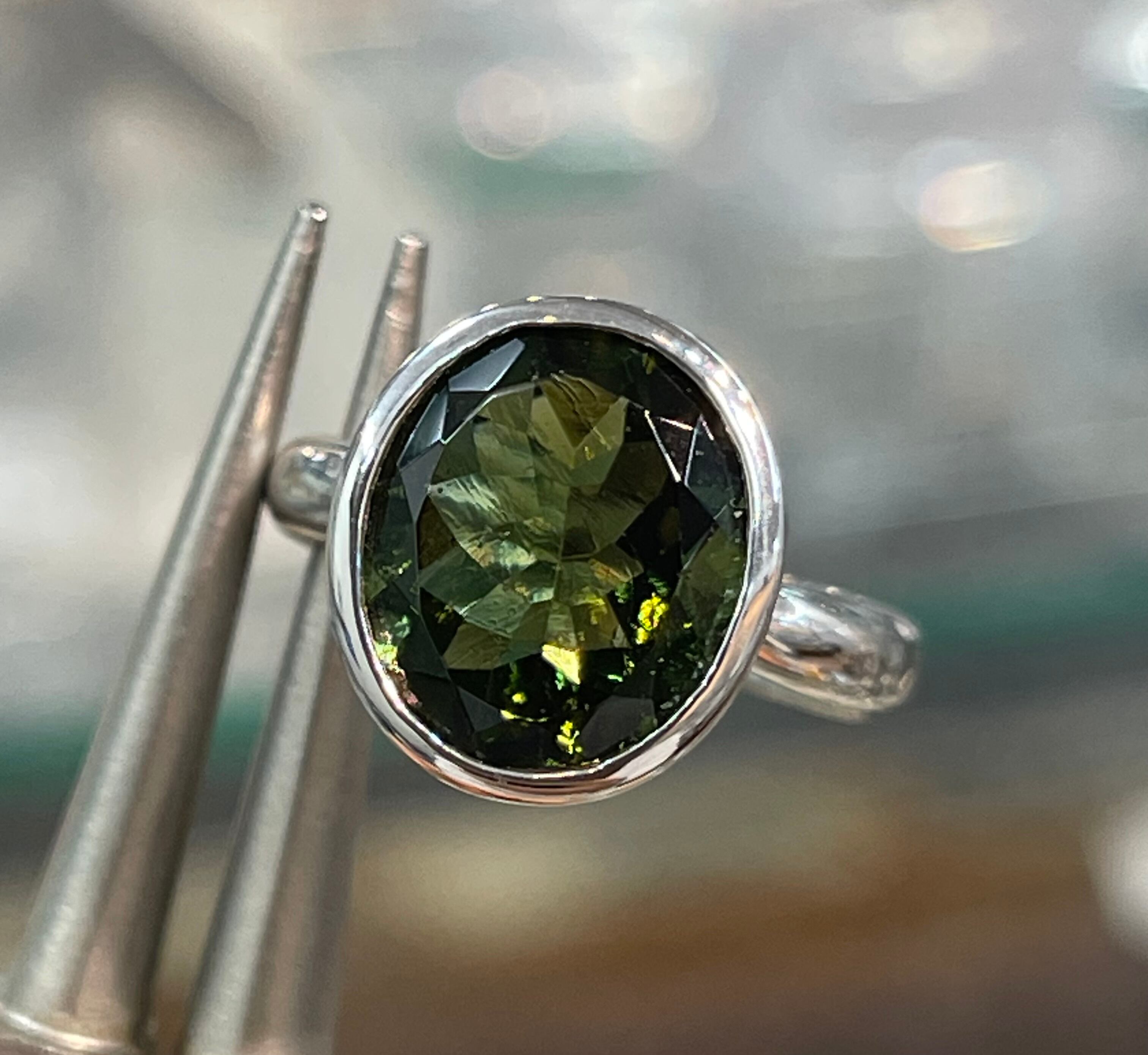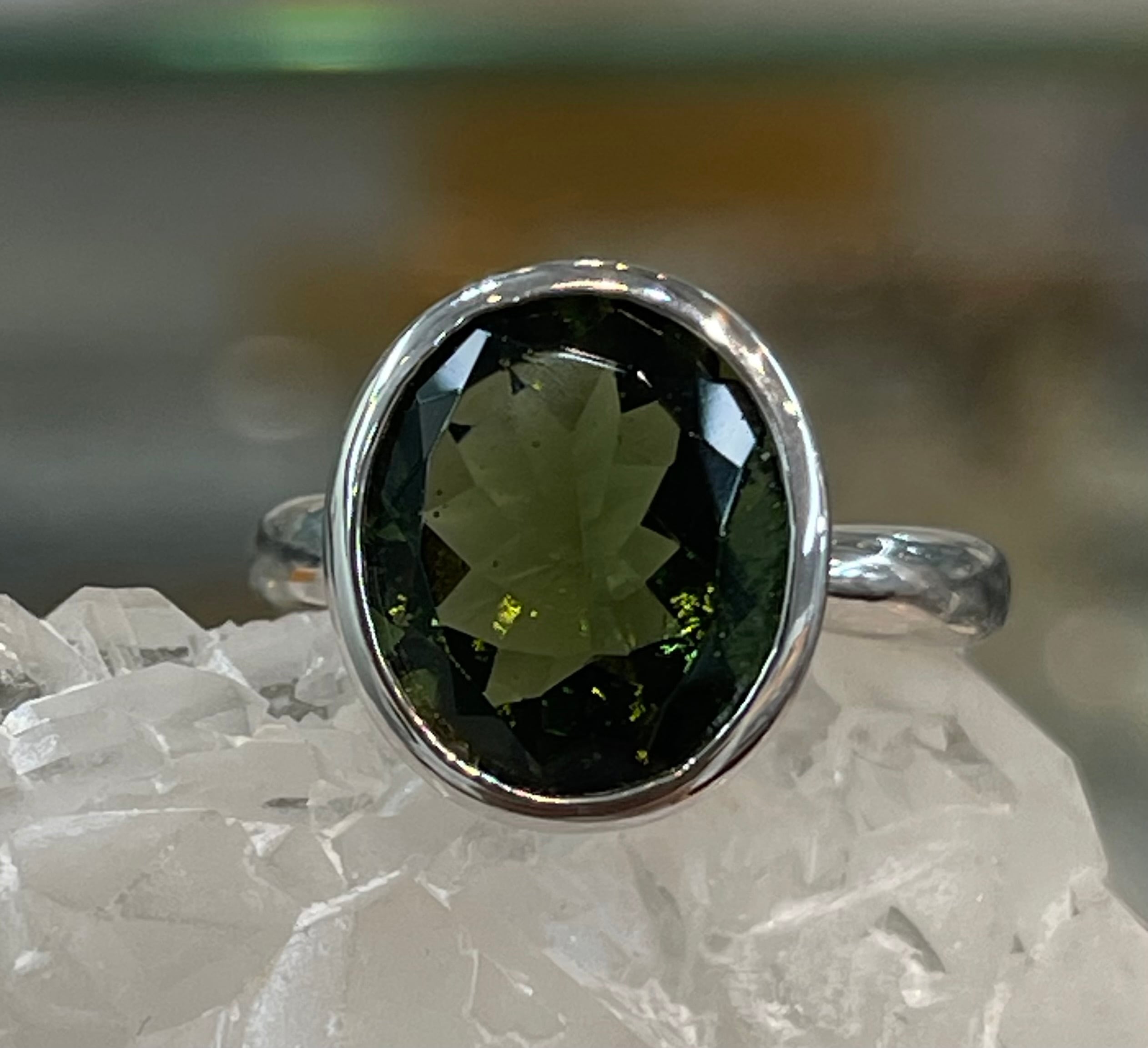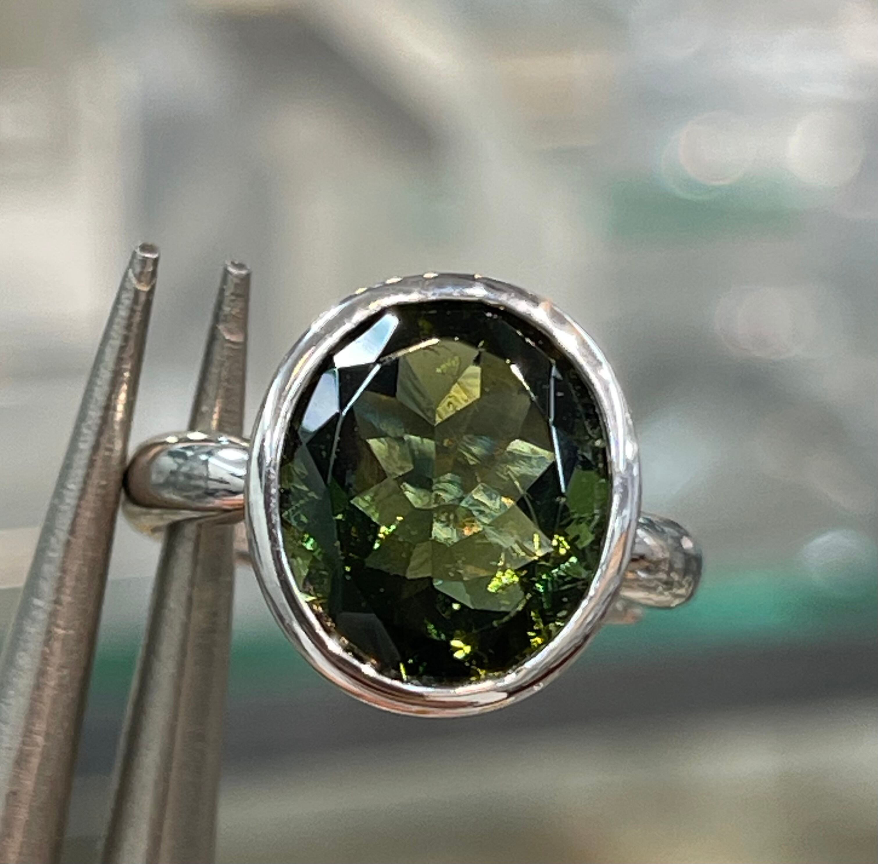宝石質の天然モルダバイト指輪です。プリンセスカットで光を反射してキラキラ♪