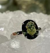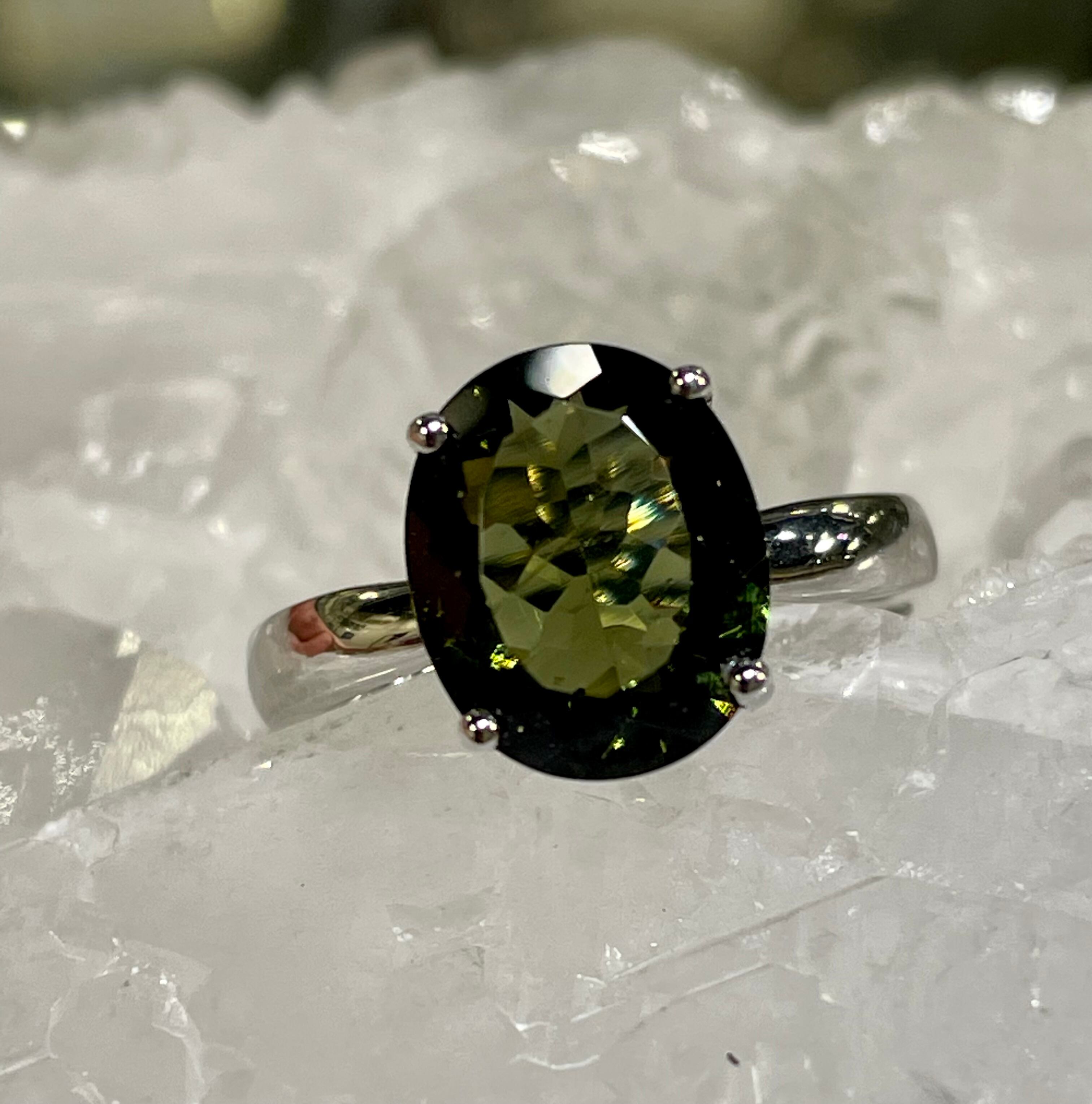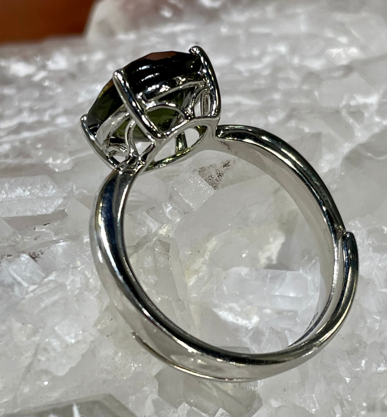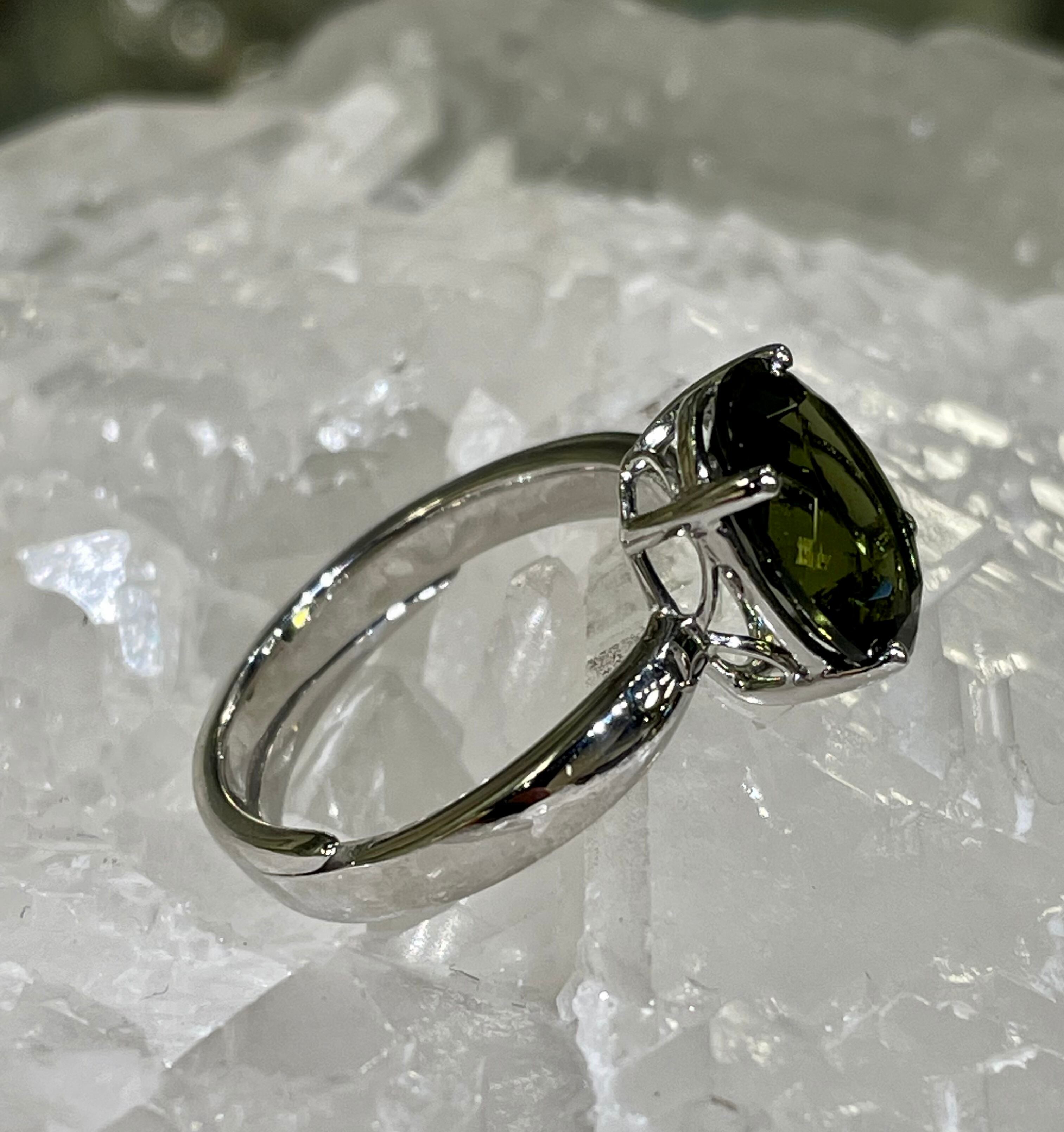 宝石質の天然モルダバイト指輪です。プリンセスカットで光を反射してキラキラ♪