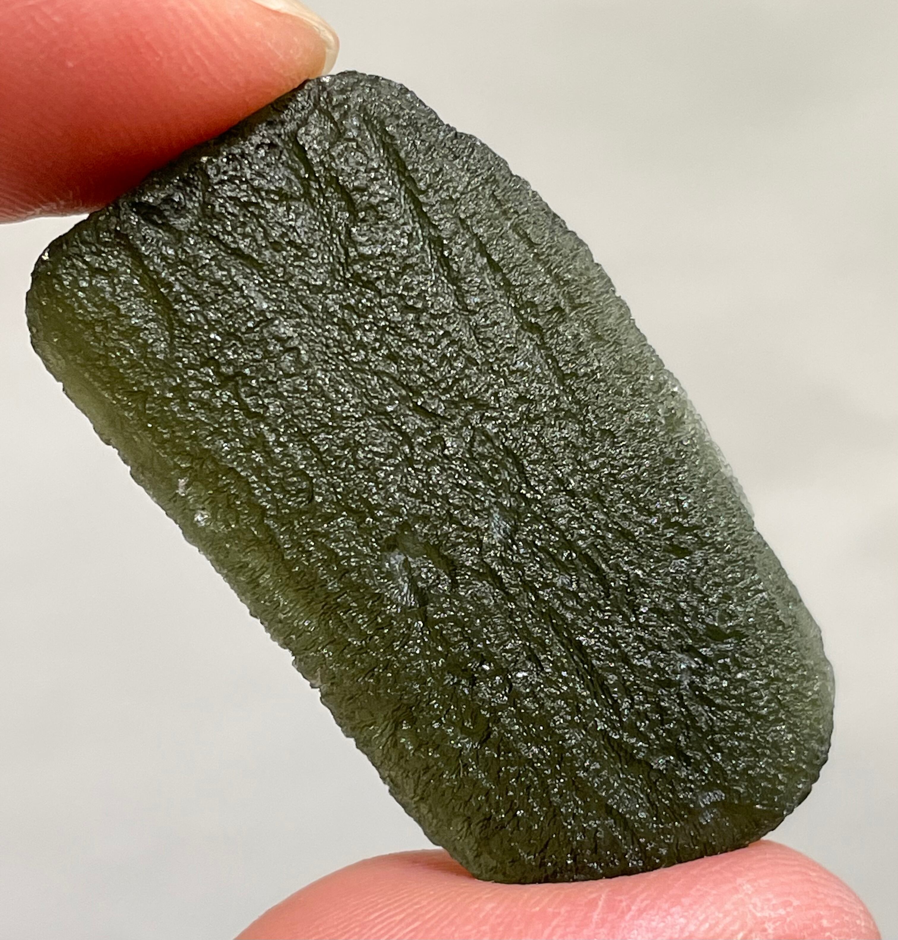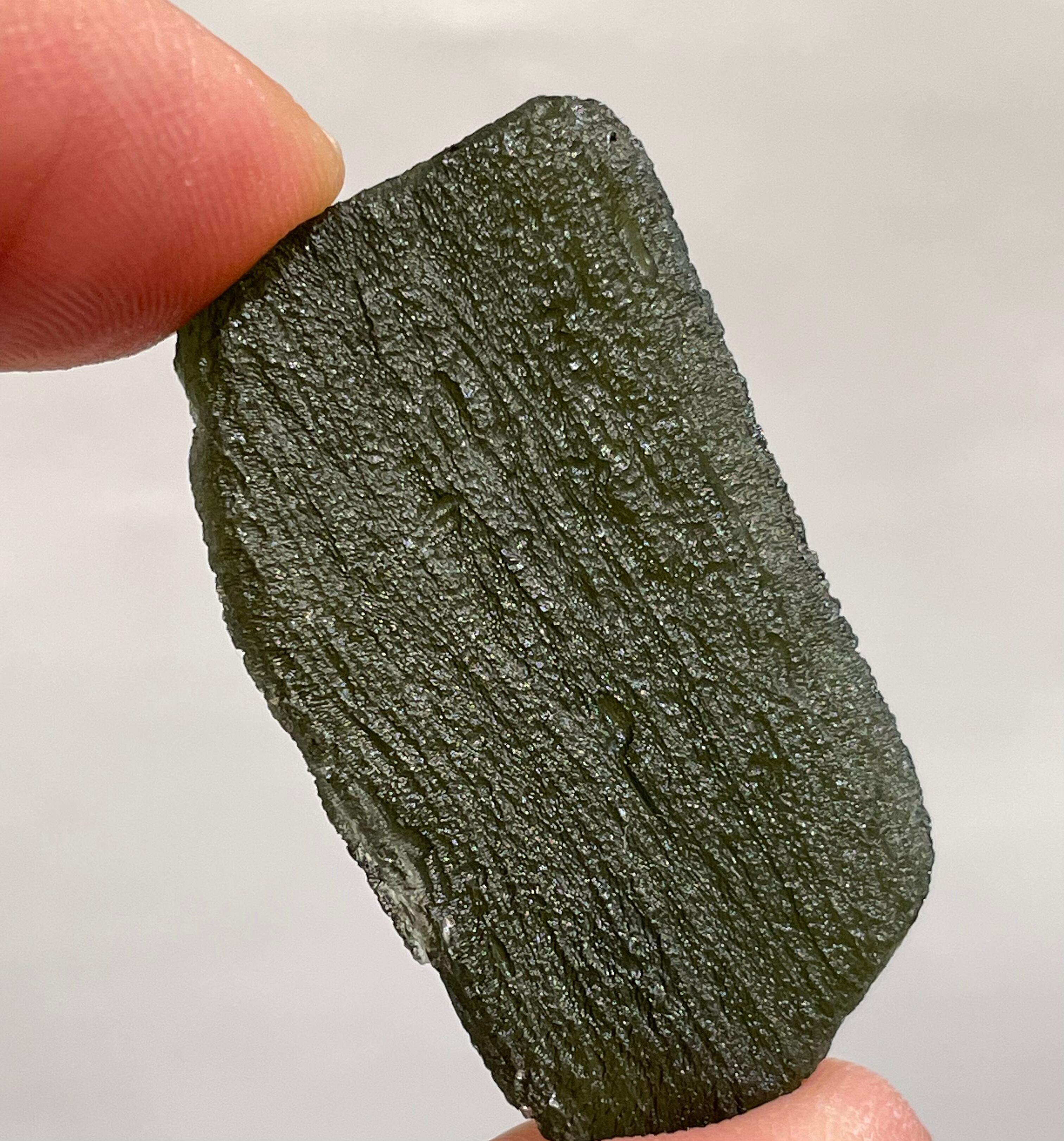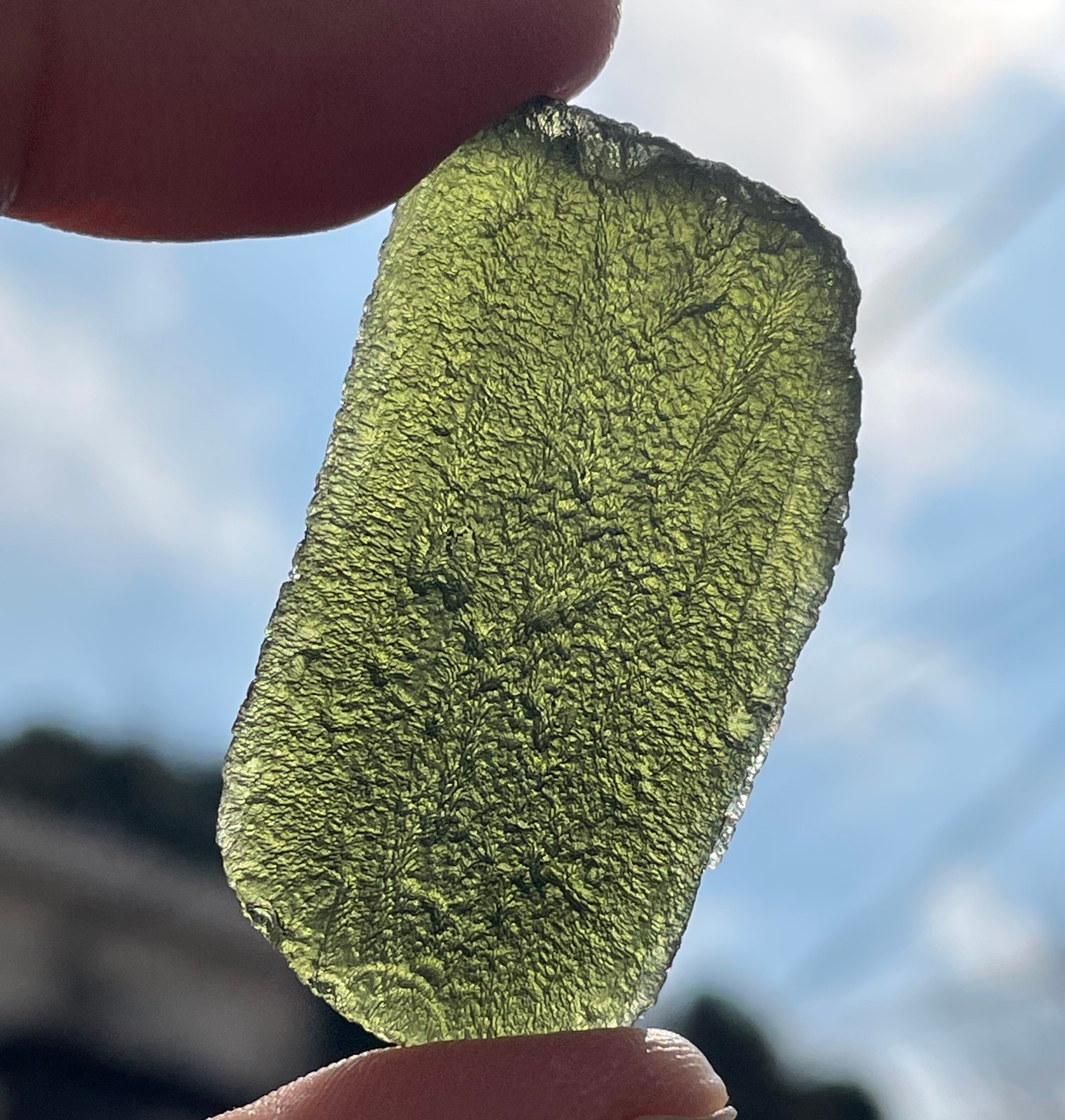 美しいフォレストグリーン色をしていまして、透かすと特にモルダバイト特有の綺麗なダークグリーン系の色合いを見せてくれます。