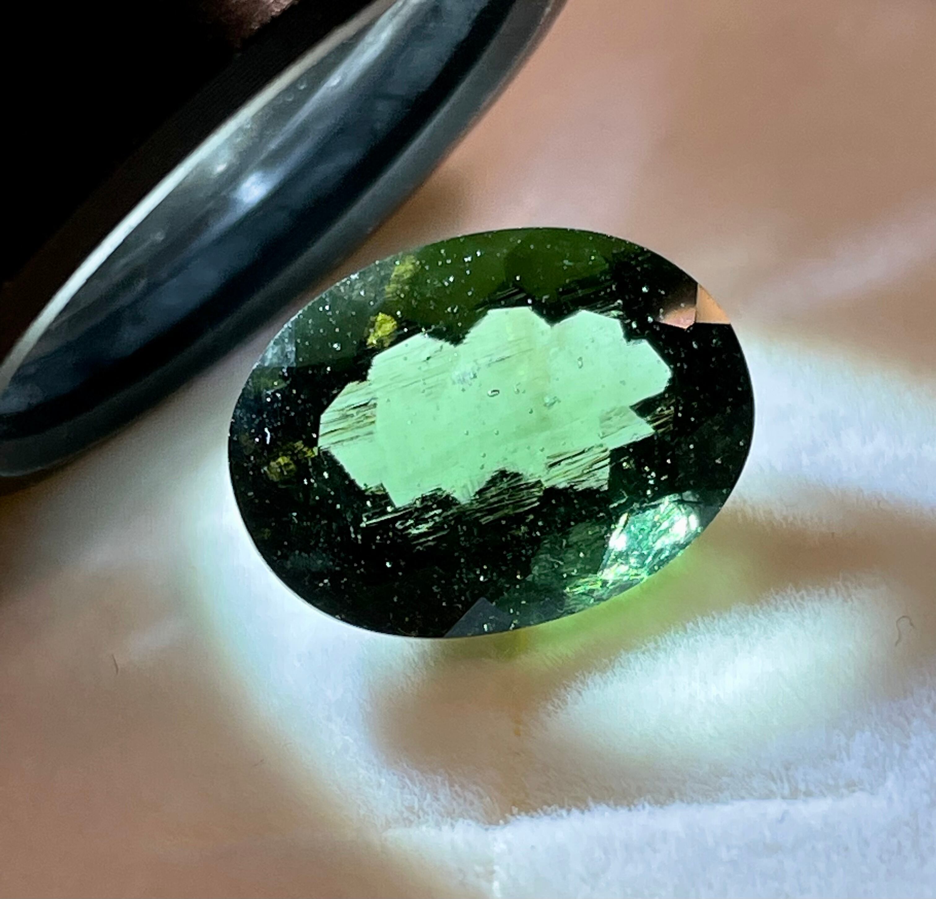 美しいフォレストグリーン色をしていまして、透かすと特にモルダバイト特有の綺麗なダークグリーン系の色合いを見せてくれます。