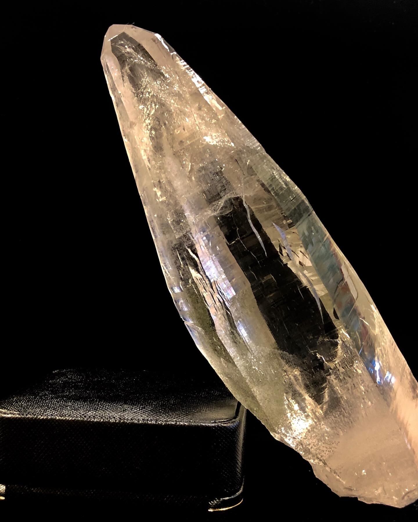 どっしりとしたボディに抜群の光沢感を持ち、かなりの大きさにもかかわらず、その透明度と輝きは格別なものです。ボディには横長のタイルを貼り合わせたようなヒマラヤ水晶独特の条線のテクスチャーと縦に入った接合線が何とも言えない極美の世界を創り上げています。底面は見事にセルフヒールドの再生結晶面で覆われており光を反射して実に美しい♪