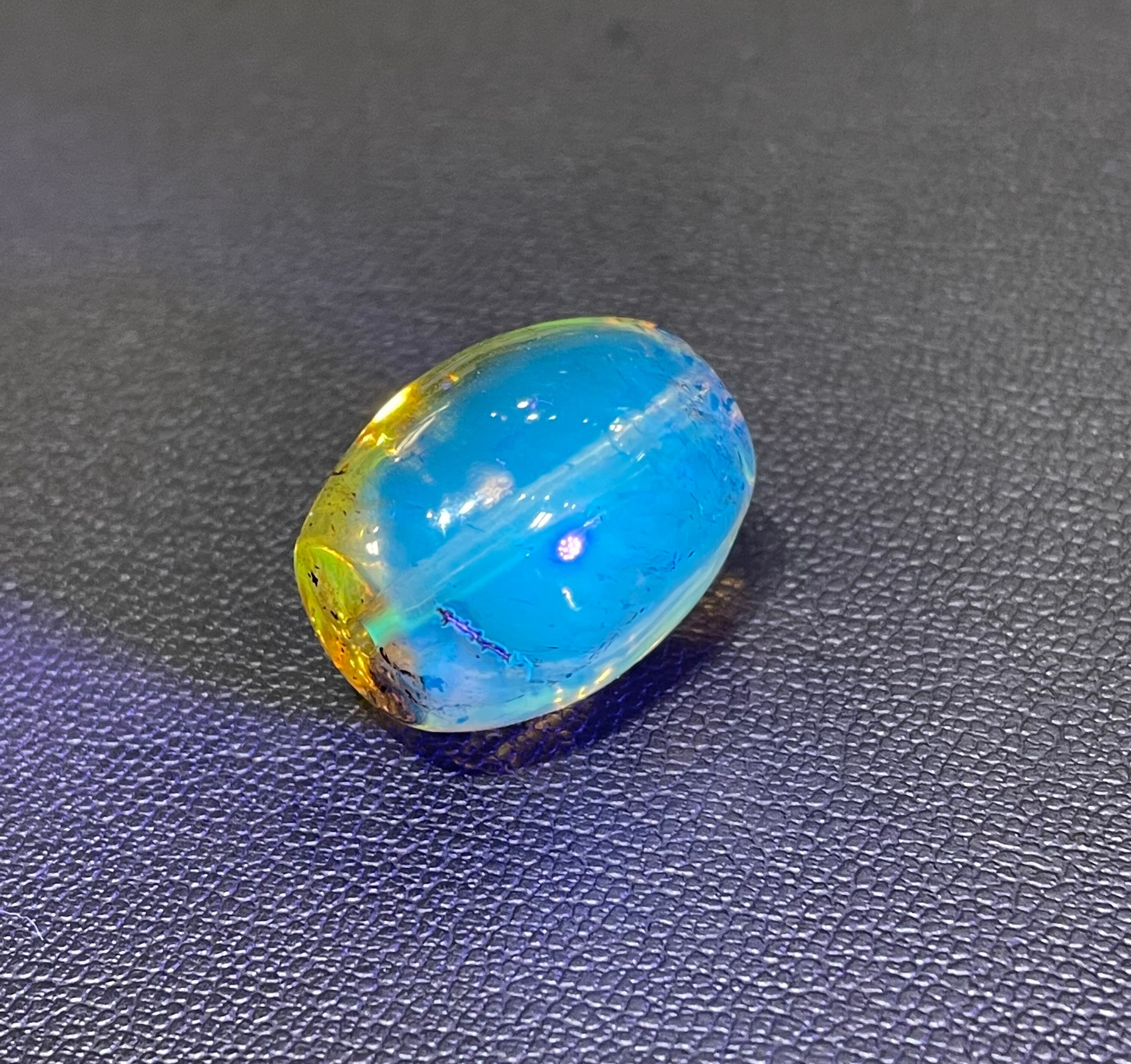 一見普通のアンバーとはなんら変りはないですが、太陽光やブラックライトなどの紫外線が当たると神秘的な美しいブルー光が表面を覆います。