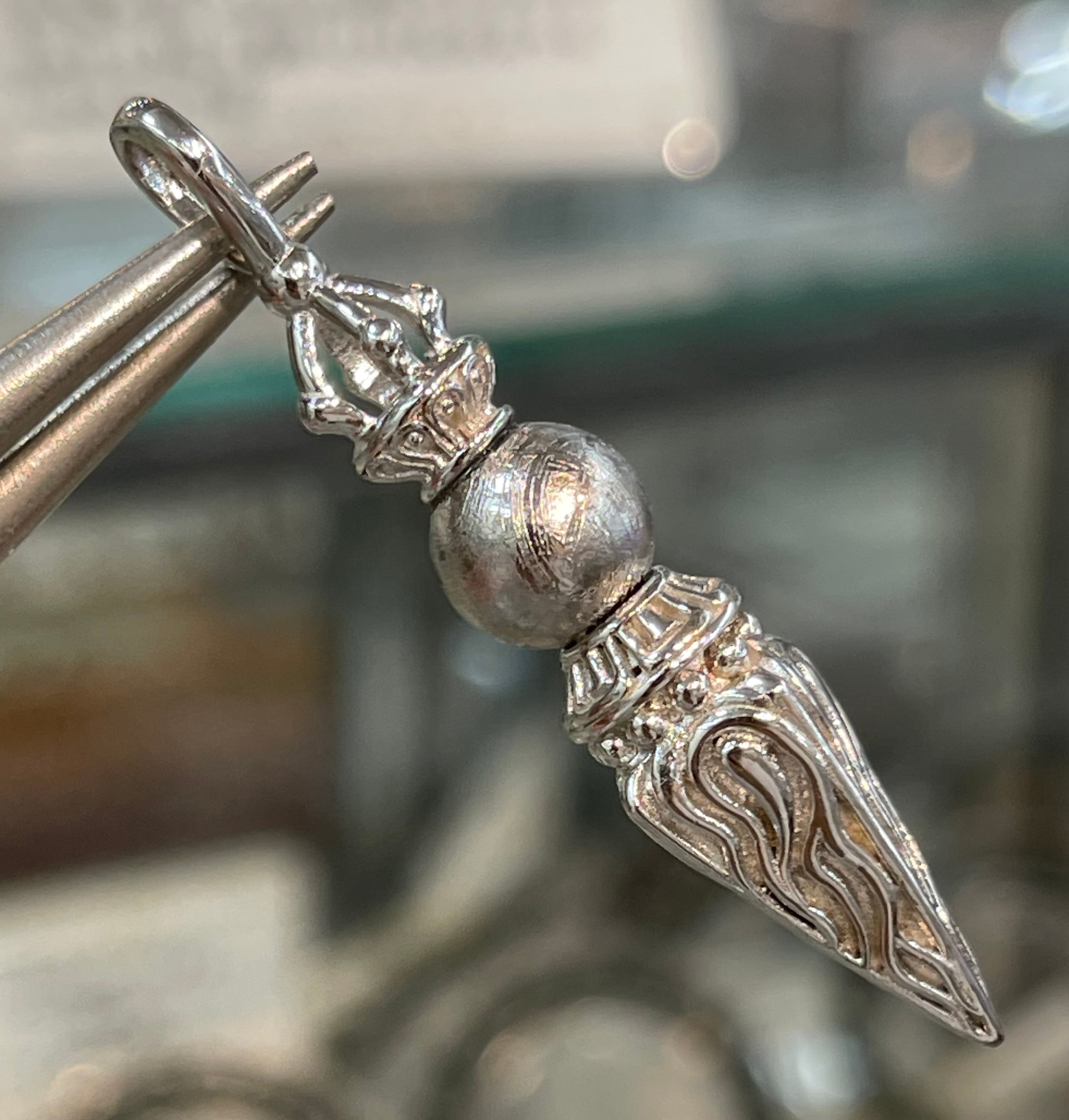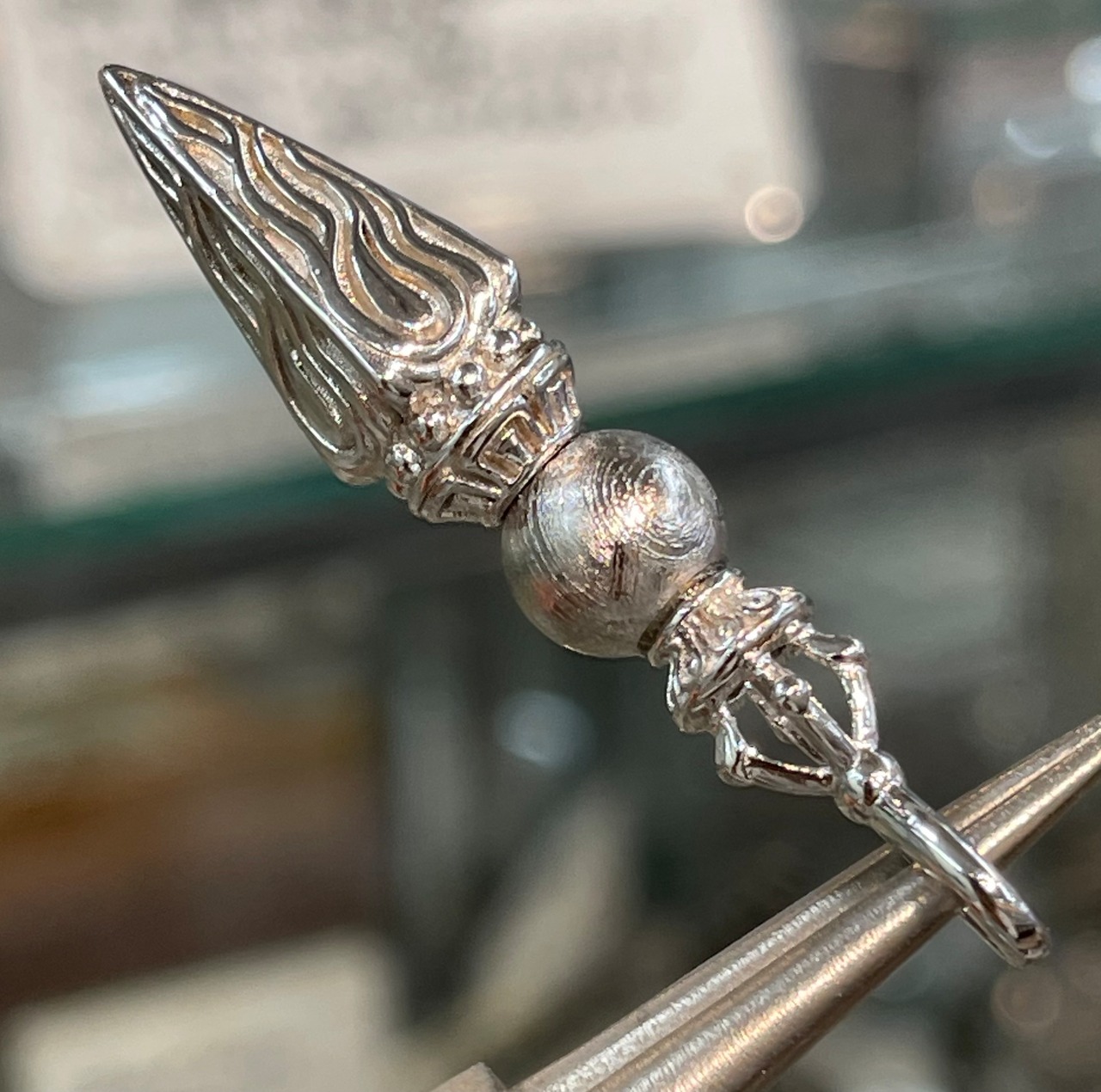 チベット法具!プルパ型で、真ん中の丸玉が8mmの天然ギベオンを使っており、両端がシルバー925 です。