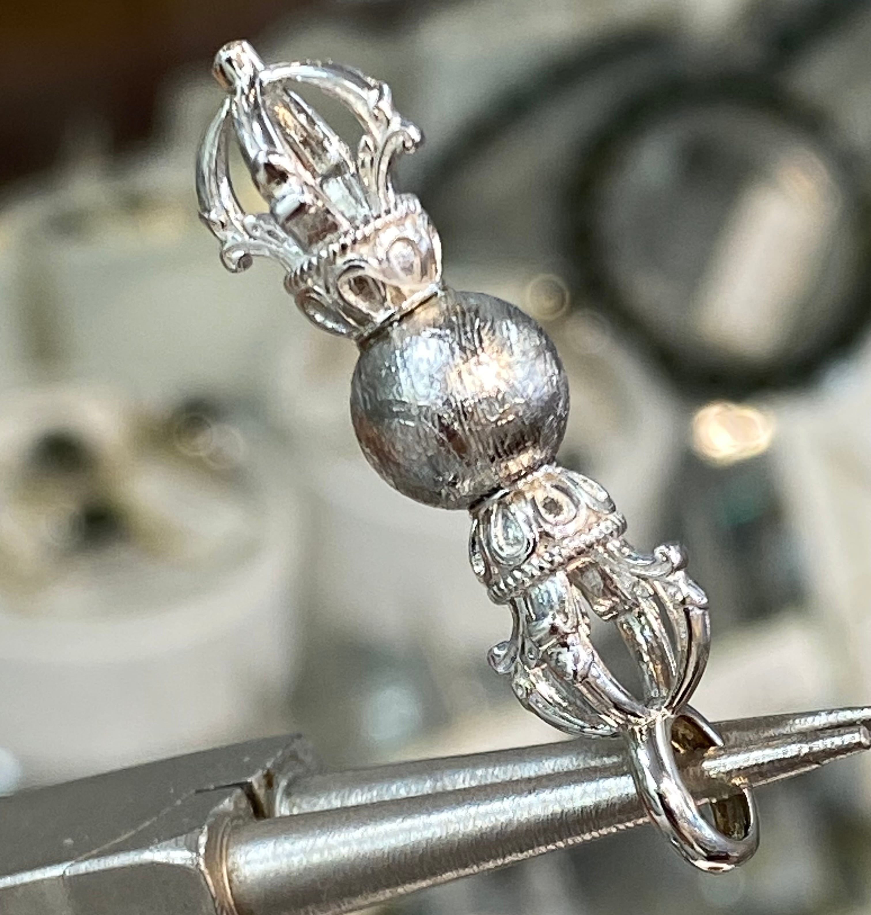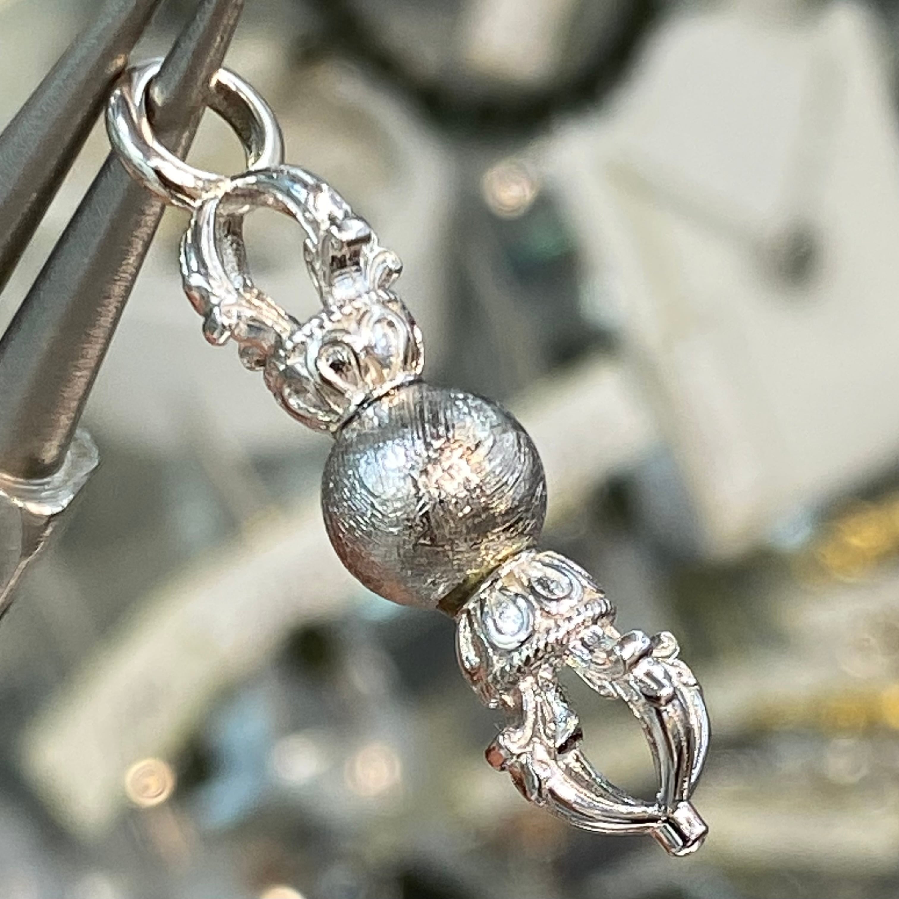 チベット法具!バジュラ型で、真ん中の丸玉が8mmの天然ギベオンを使っており、両端がシルバー925 です。