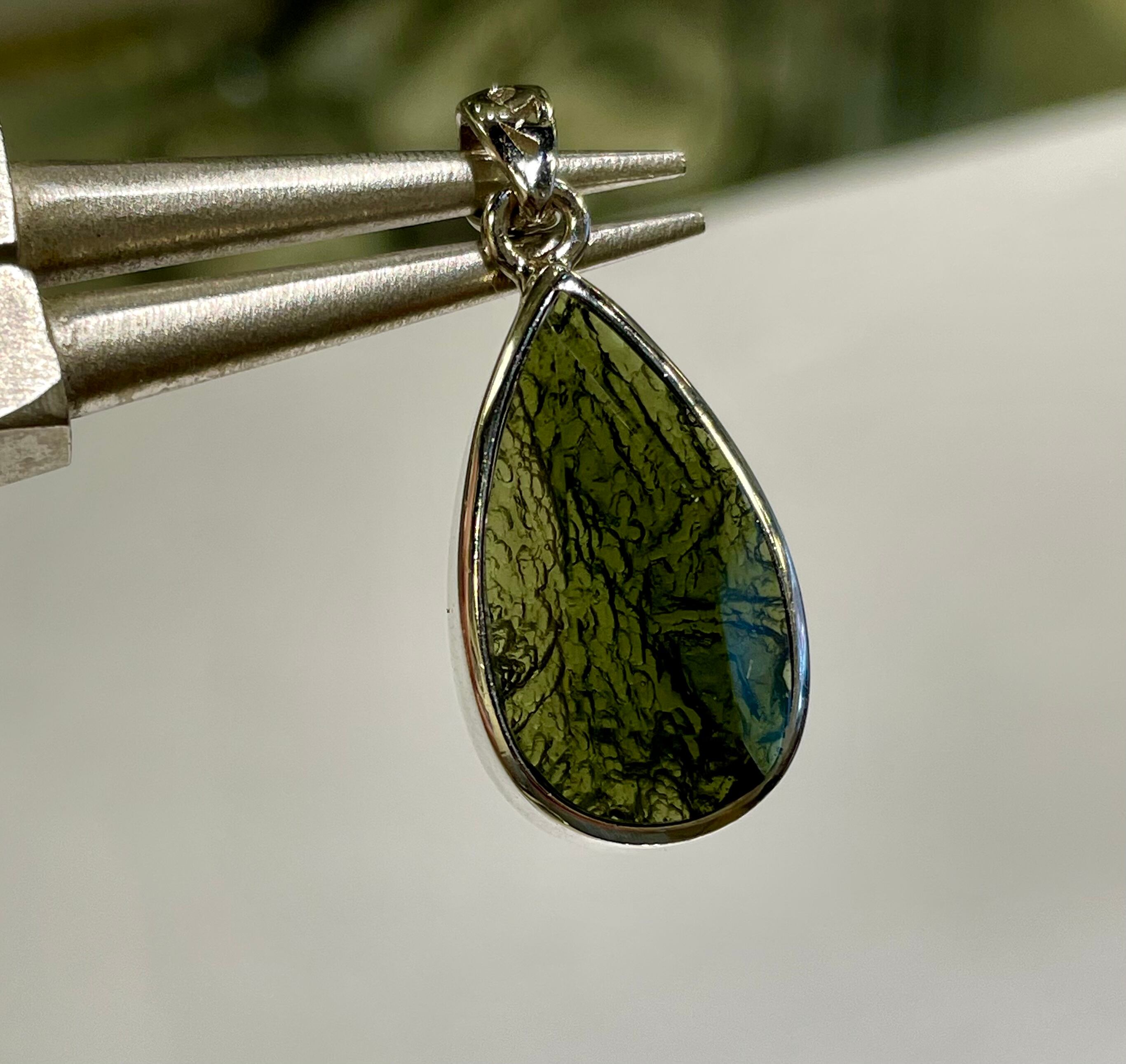美しいフォレストグリーン色をしていまして、透かすと特にモルダバイト特有の綺麗なダークグリーン系の色合いを見せてくれます。