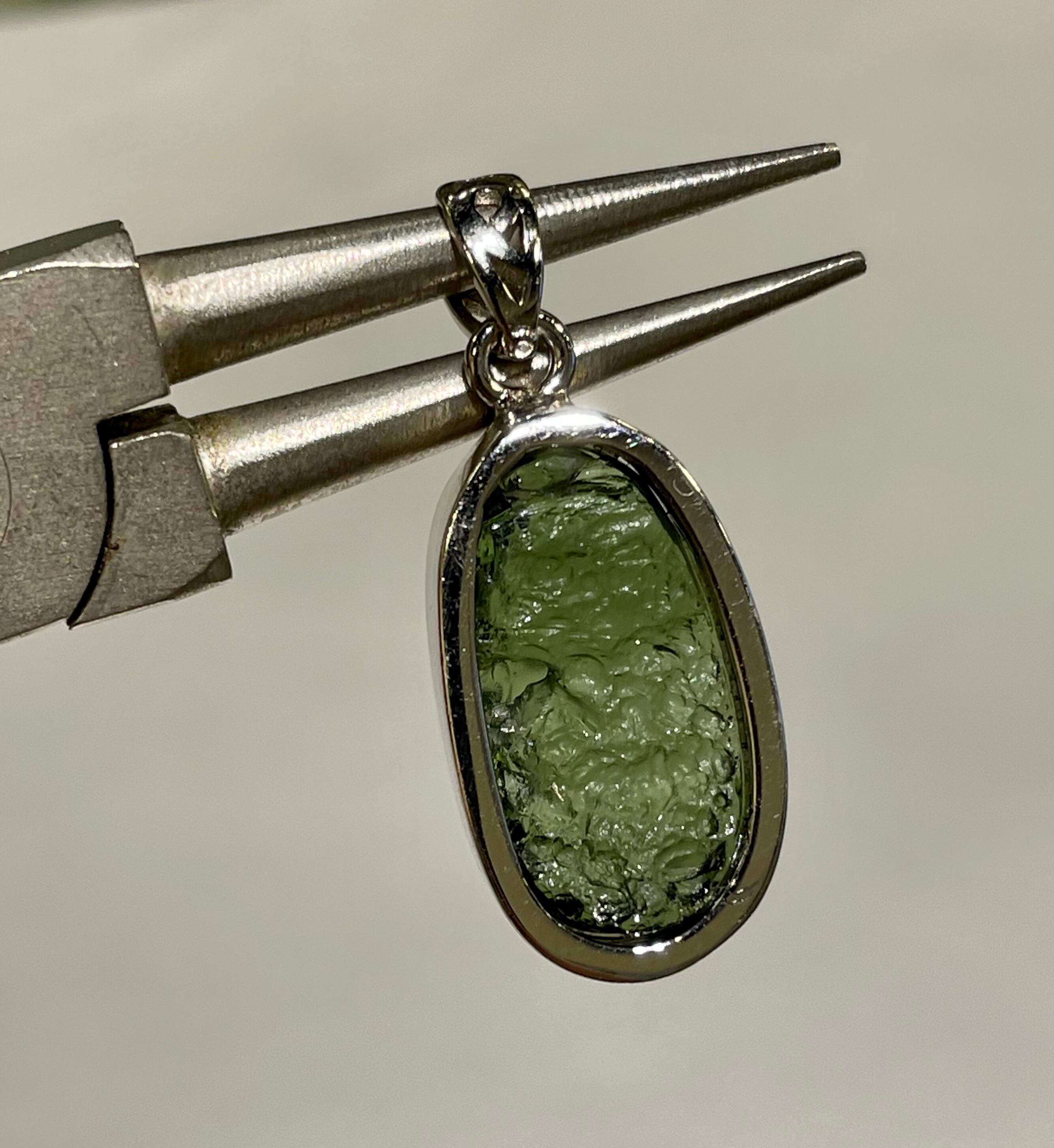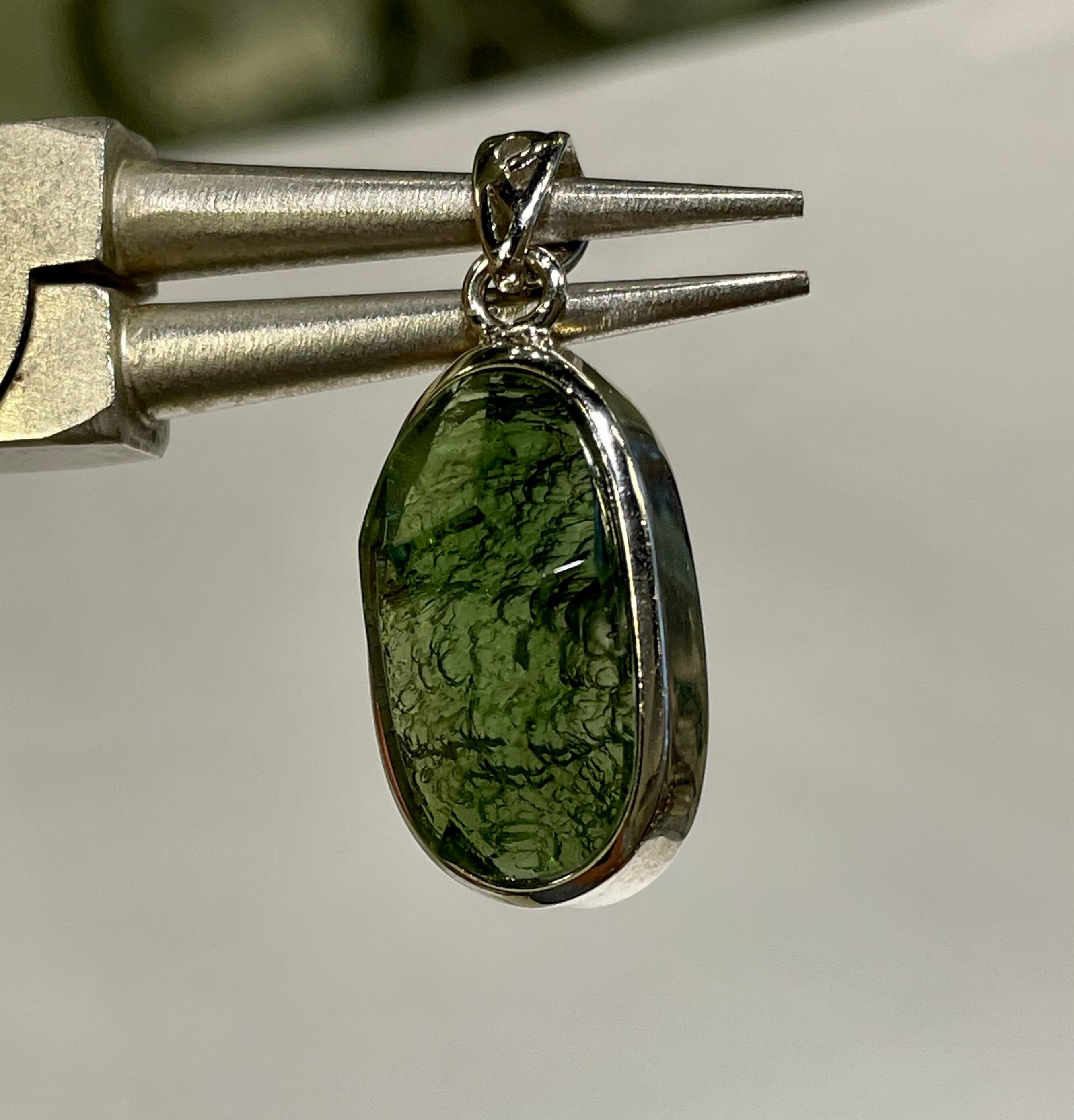 美しいフォレストグリーン色をしていまして、透かすと特にモルダバイト特有の綺麗なダークグリーン系の色合いを見せてくれます。