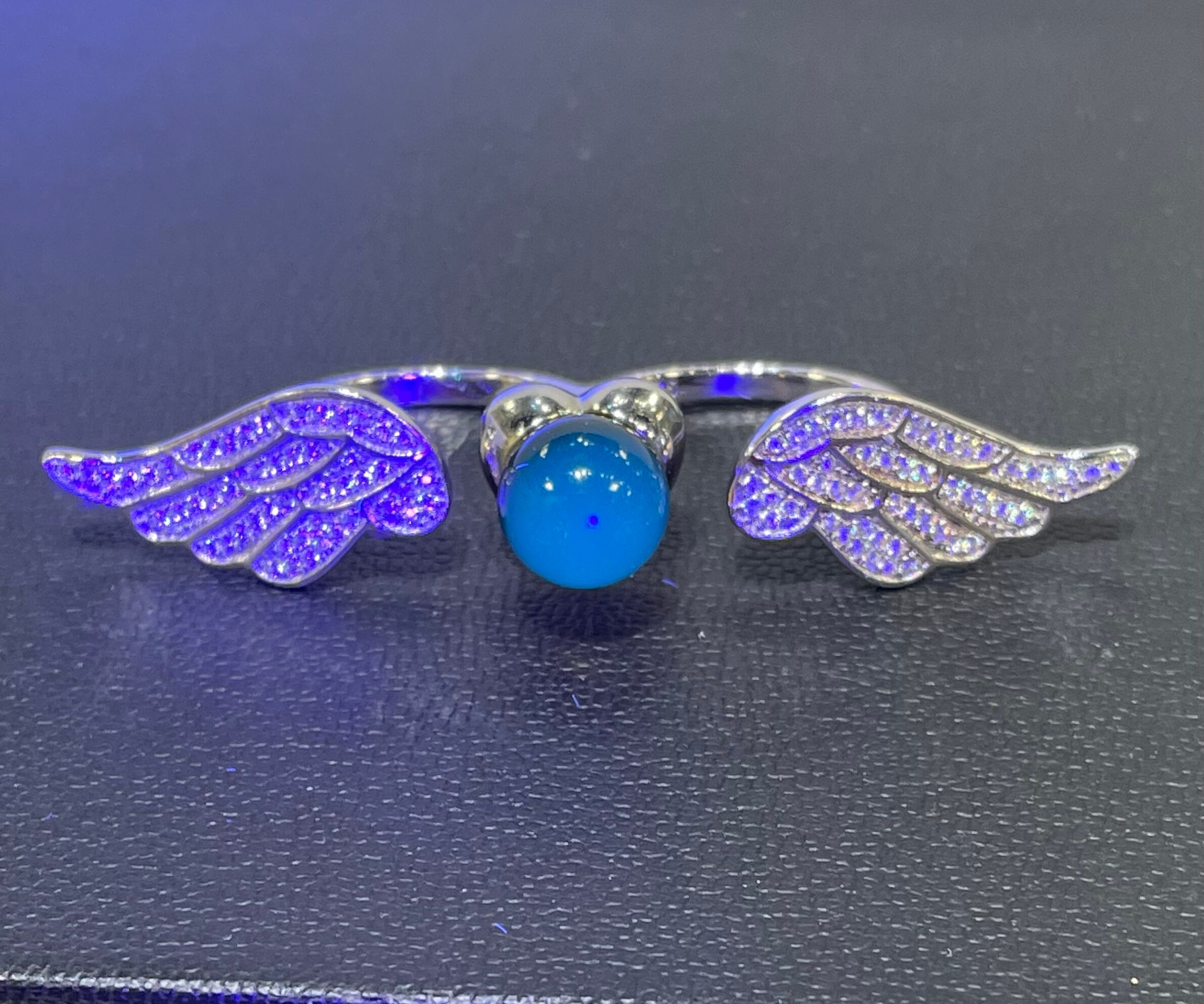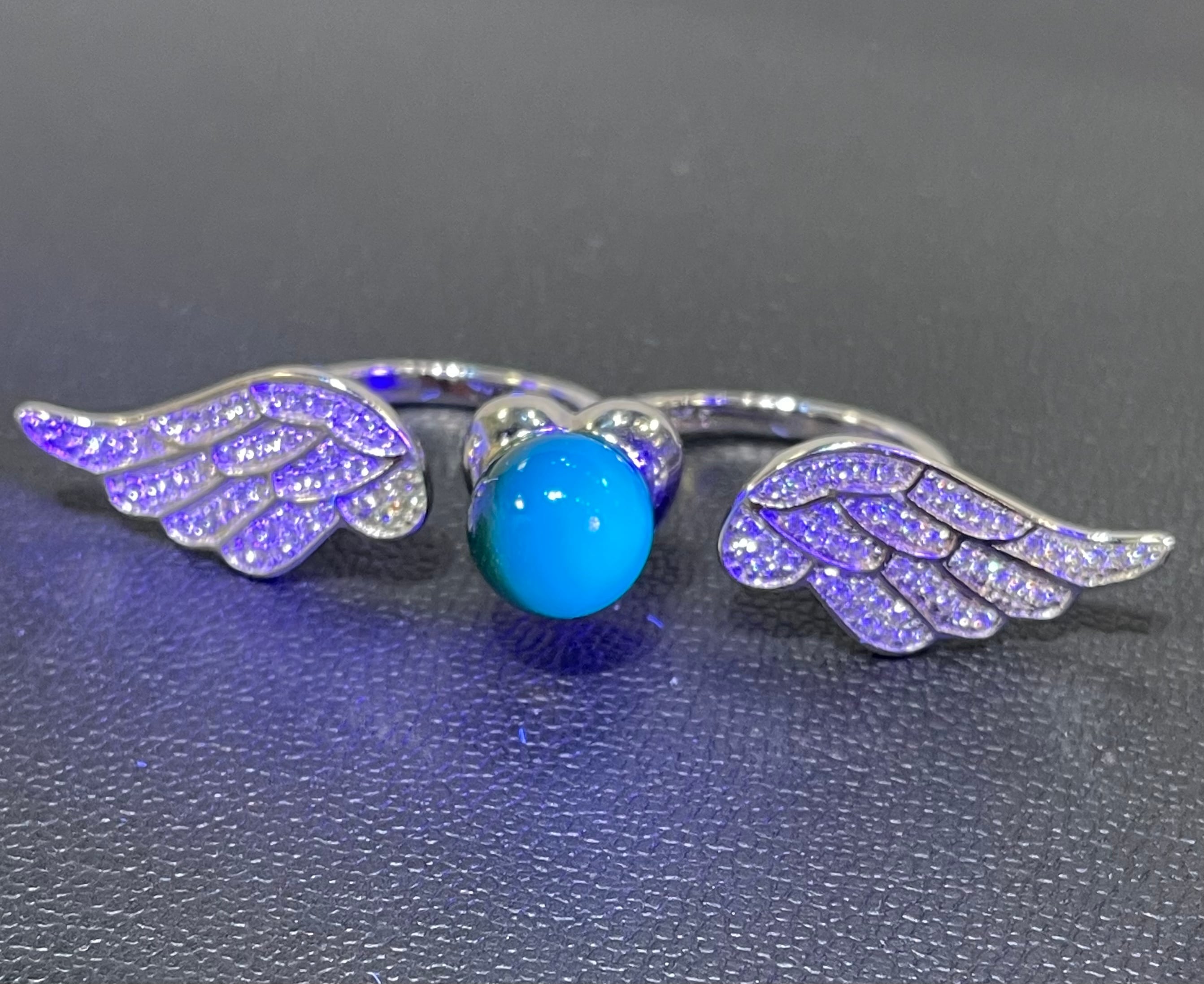 一見普通のアンバーとはなんら変りはないですが、太陽光やブラックライトなどの紫外線が当たると神秘的な美しいブルー光が表面を覆います。