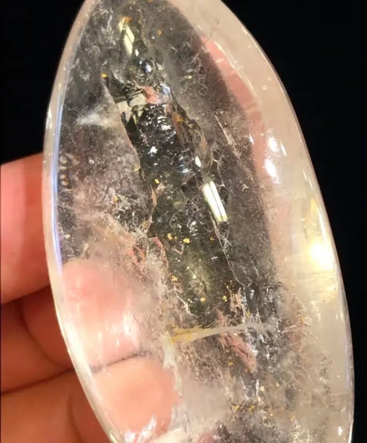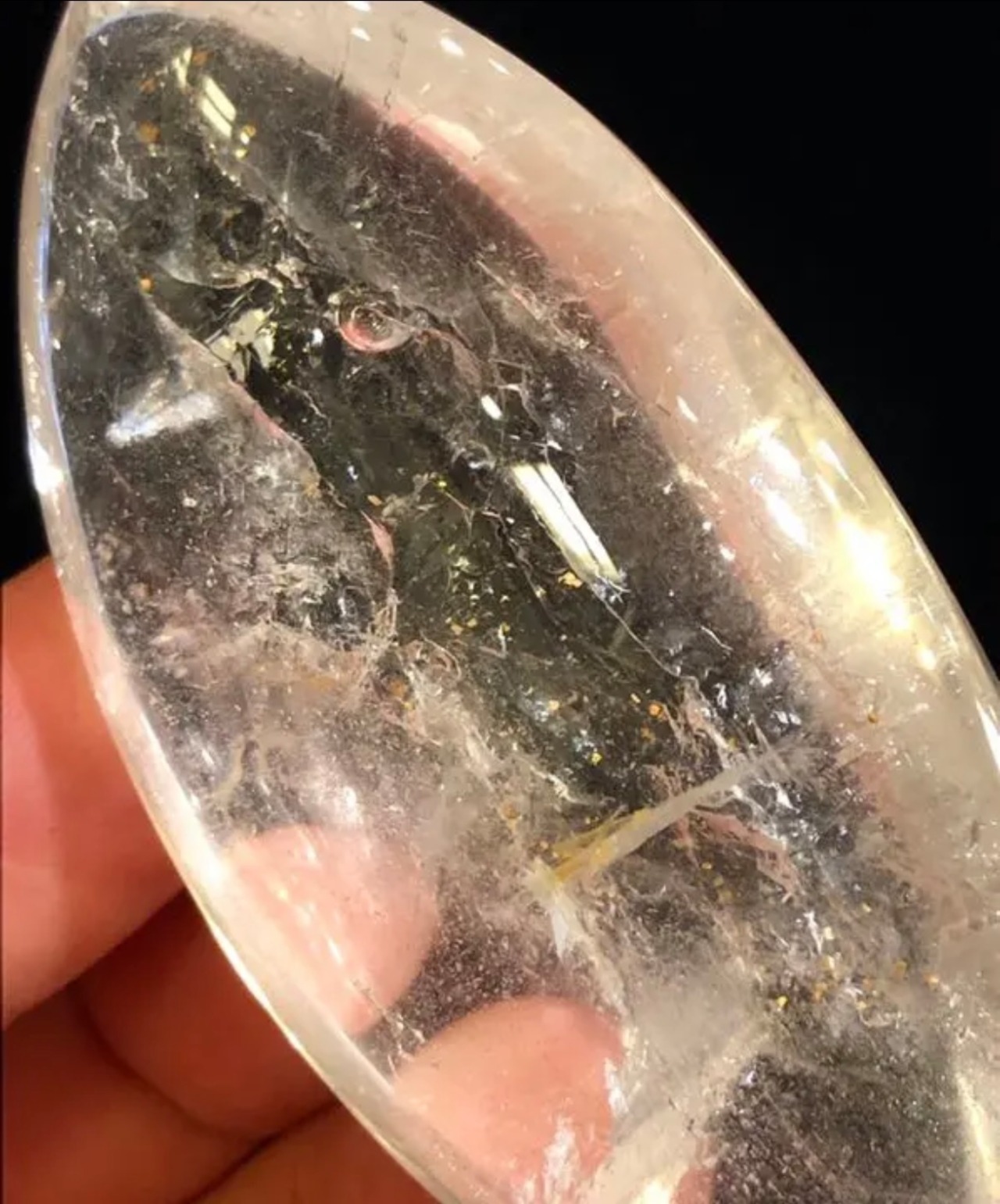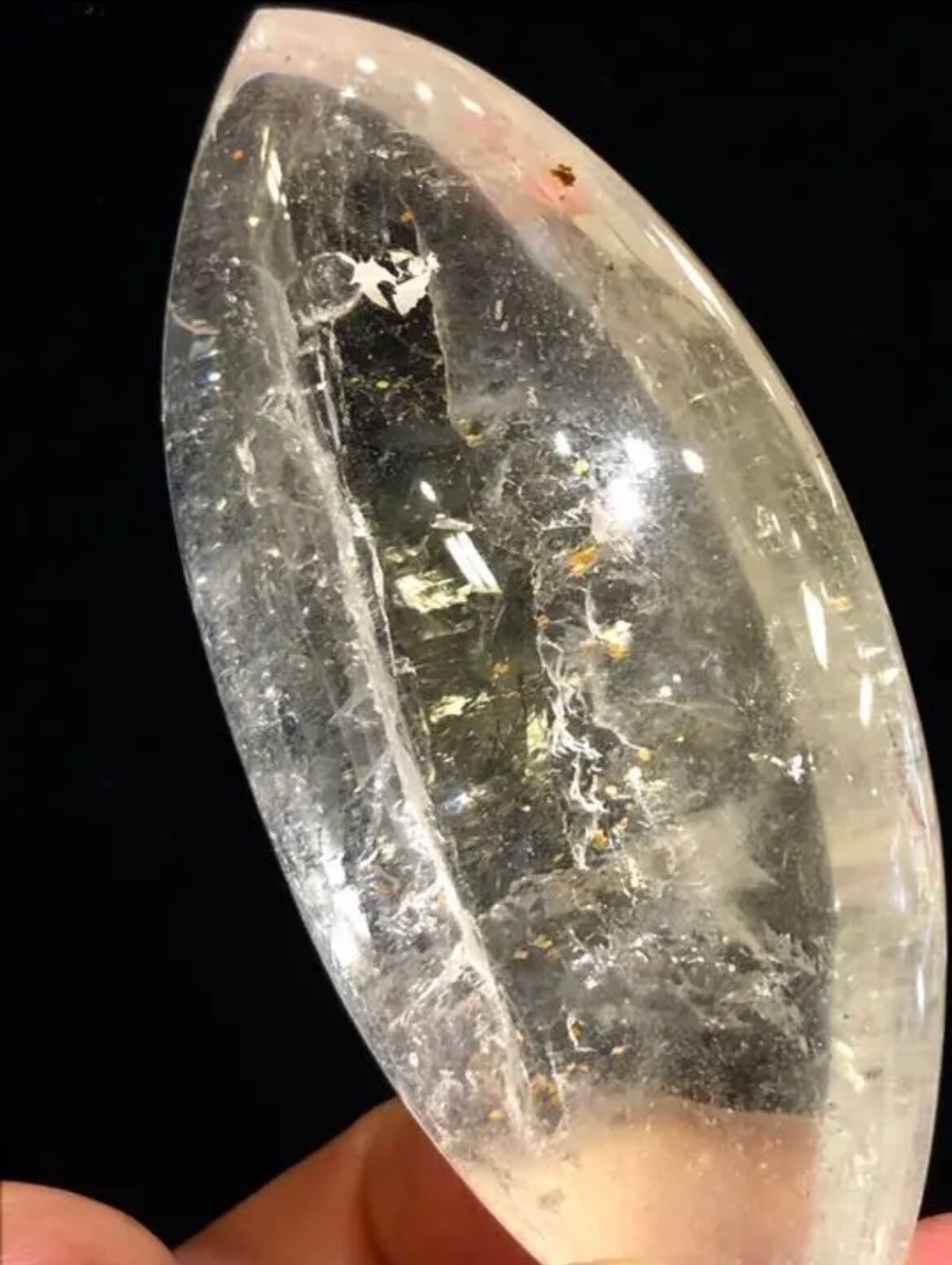 水晶を傾けて見ると水玉と金粉のような流砂が綺麗に流れます。