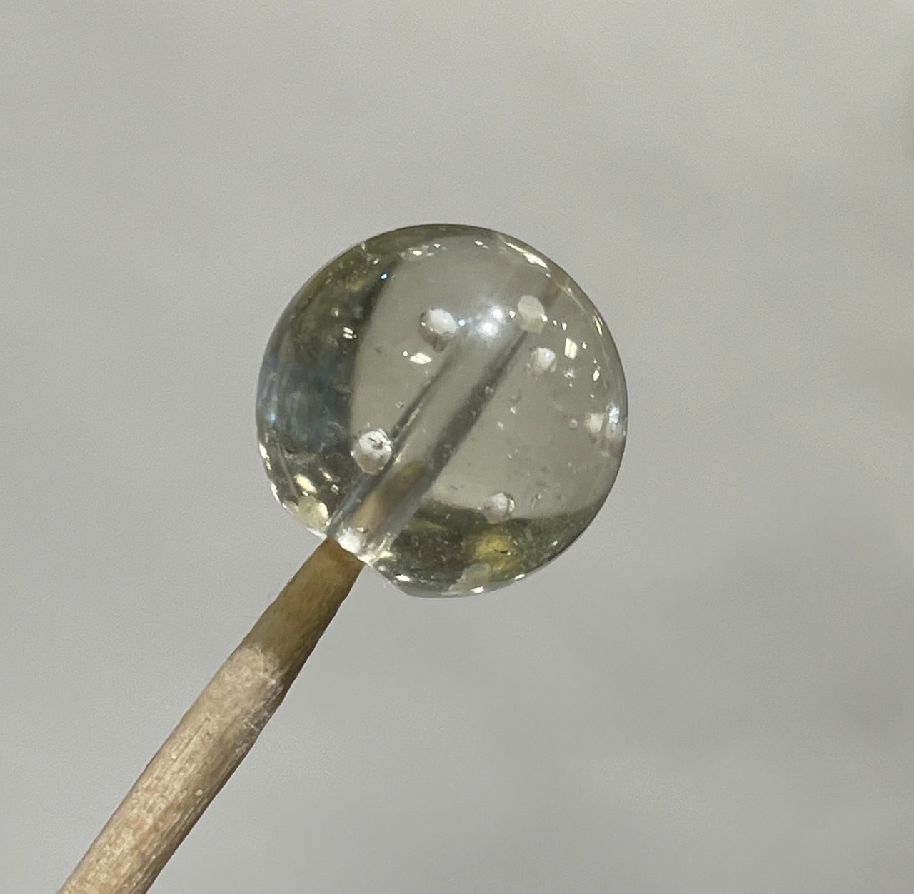 淡い黄色系が特徴であり、二酸化珪素(SiO2)の純度が98%で、黄緑、深緑、無色、乳白色等もあり気泡と内包物も良く含まれています。