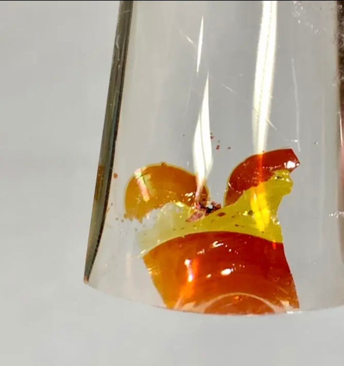 膜状の鮮やかな赤や黄色が水晶に内包されているのが特徴です。