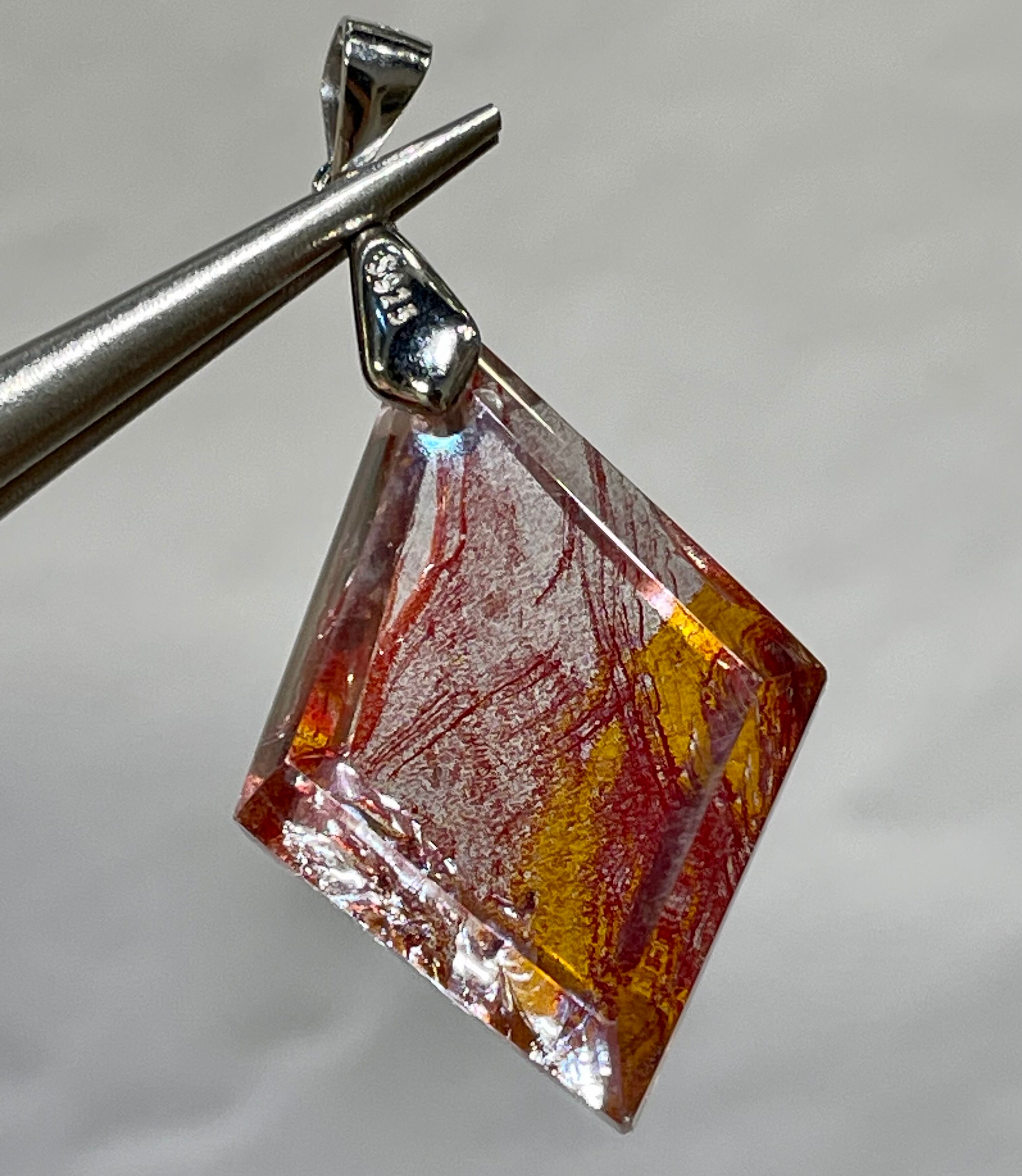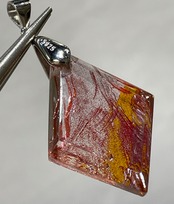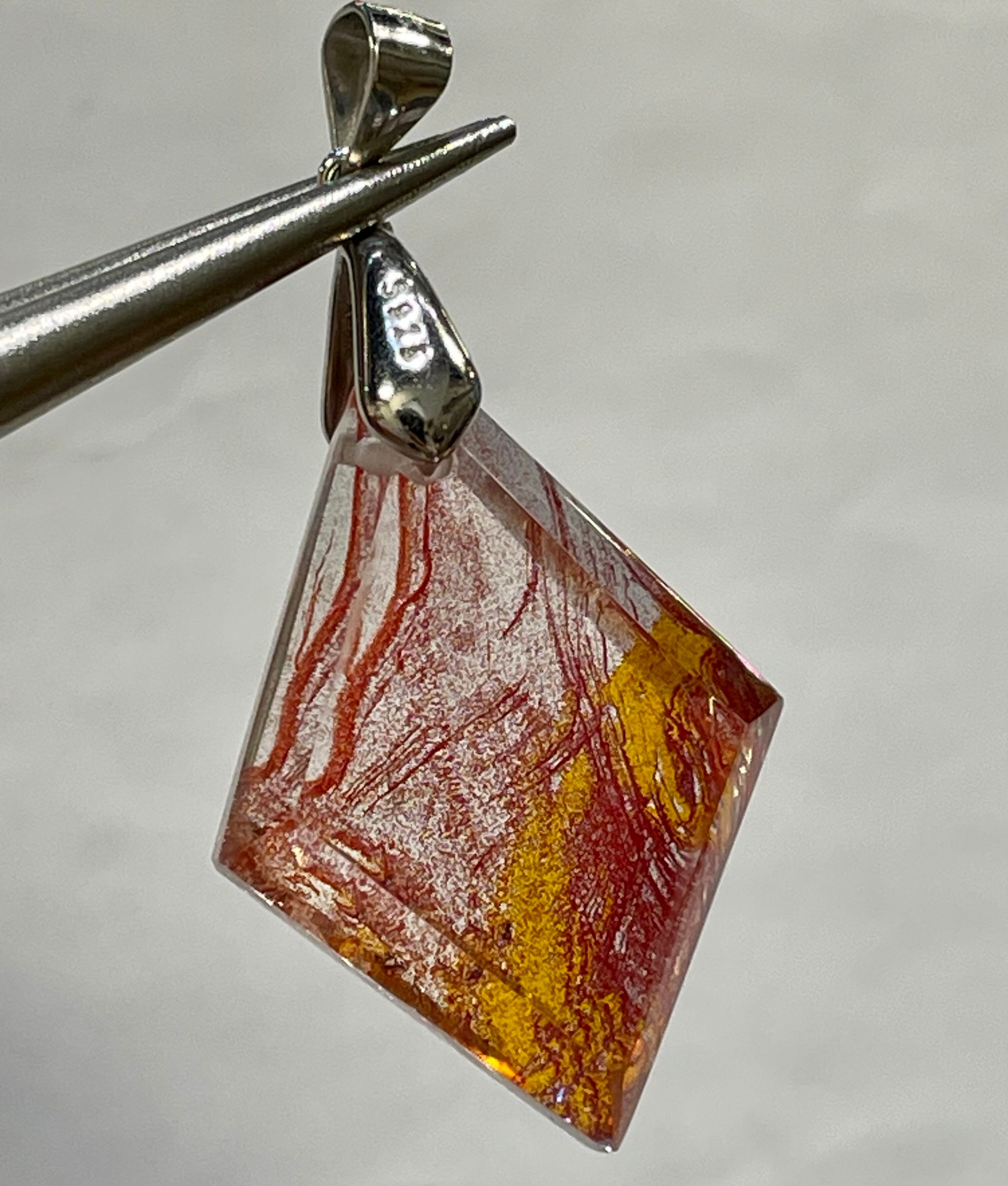 膜状の鮮やかな赤や黄色が水晶に内包されているのが特徴です。