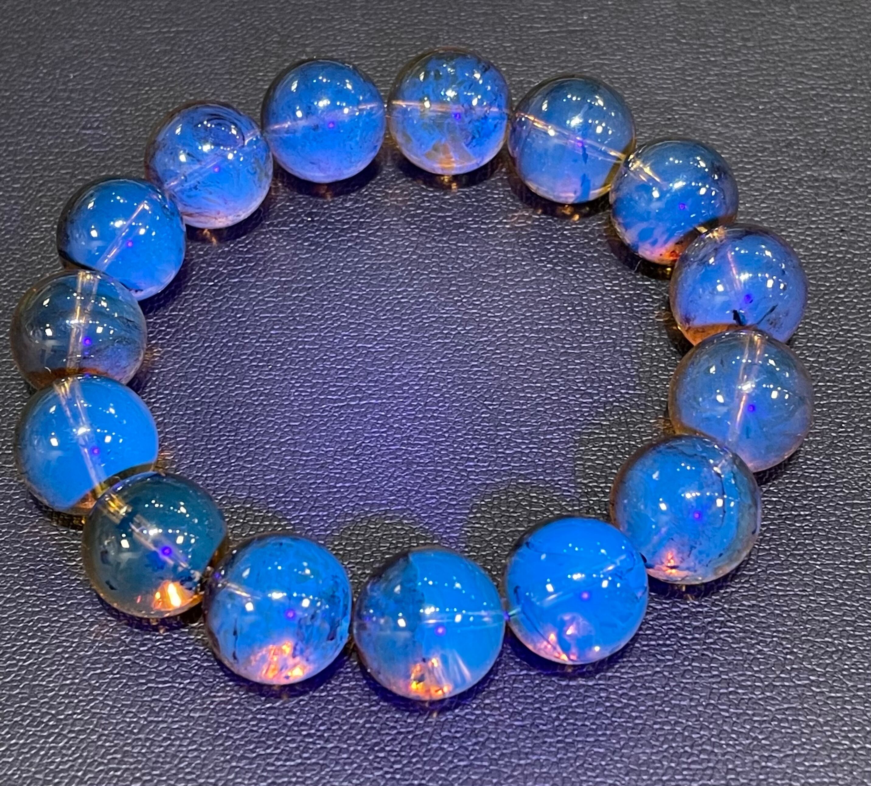 一見普通のアンバーとはなんら変りはないですが、太陽光やブラックライトなどの紫外線が当たると神秘的な美しいブルー光が表面を覆います。