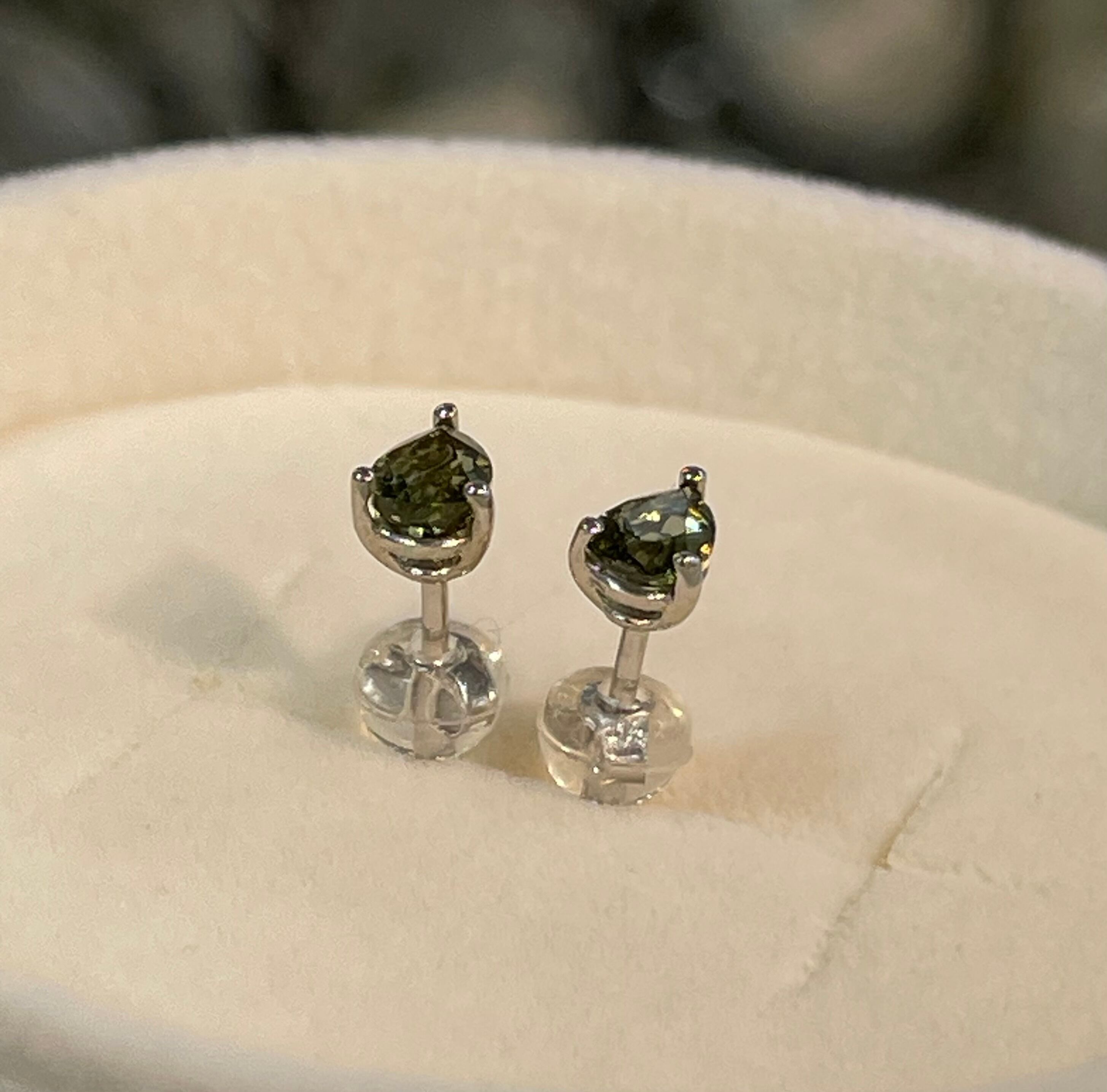 宝石質の天然モルダバイト ピアスです。プリンセスカットで光を反射してキラキラ♪