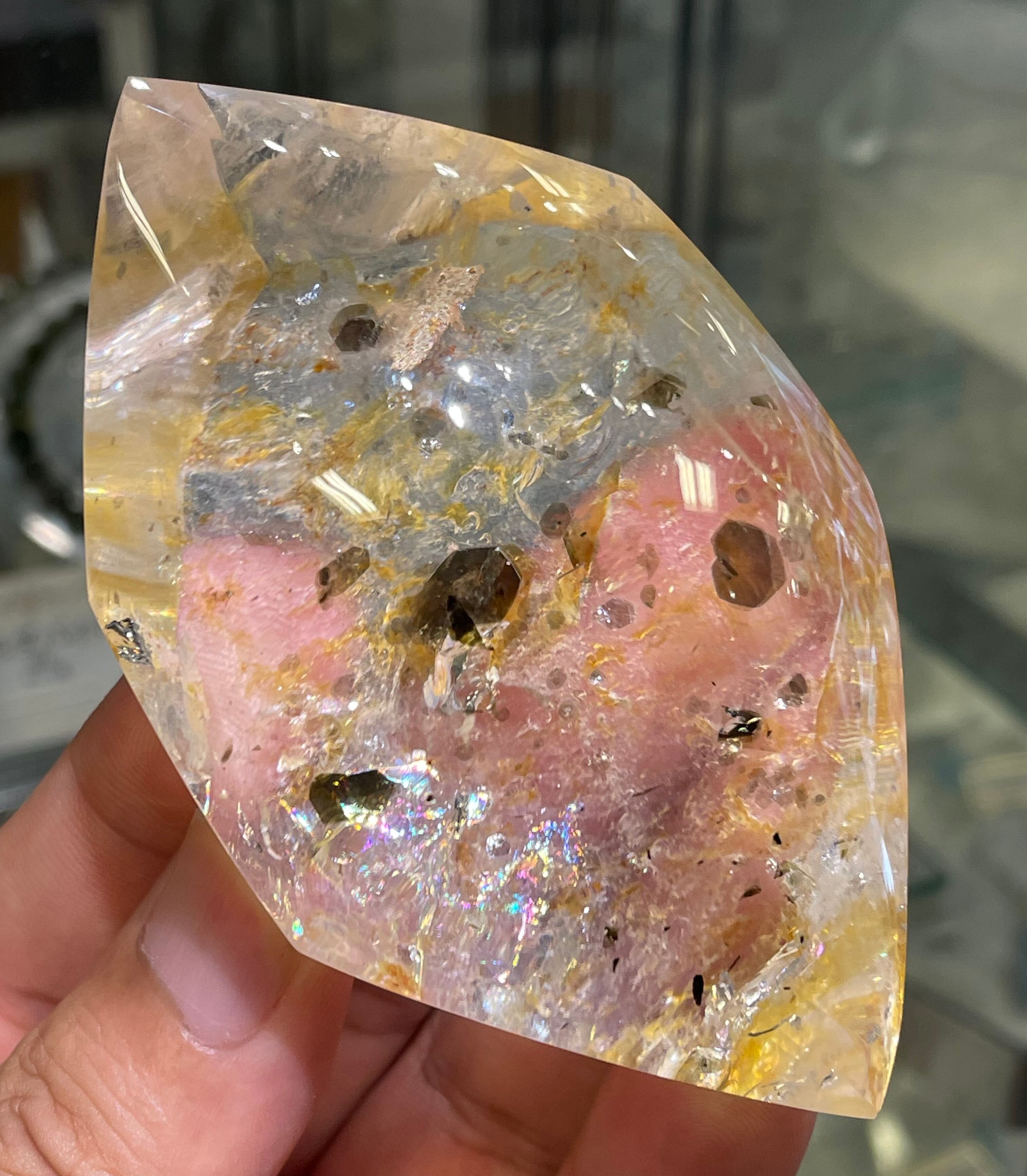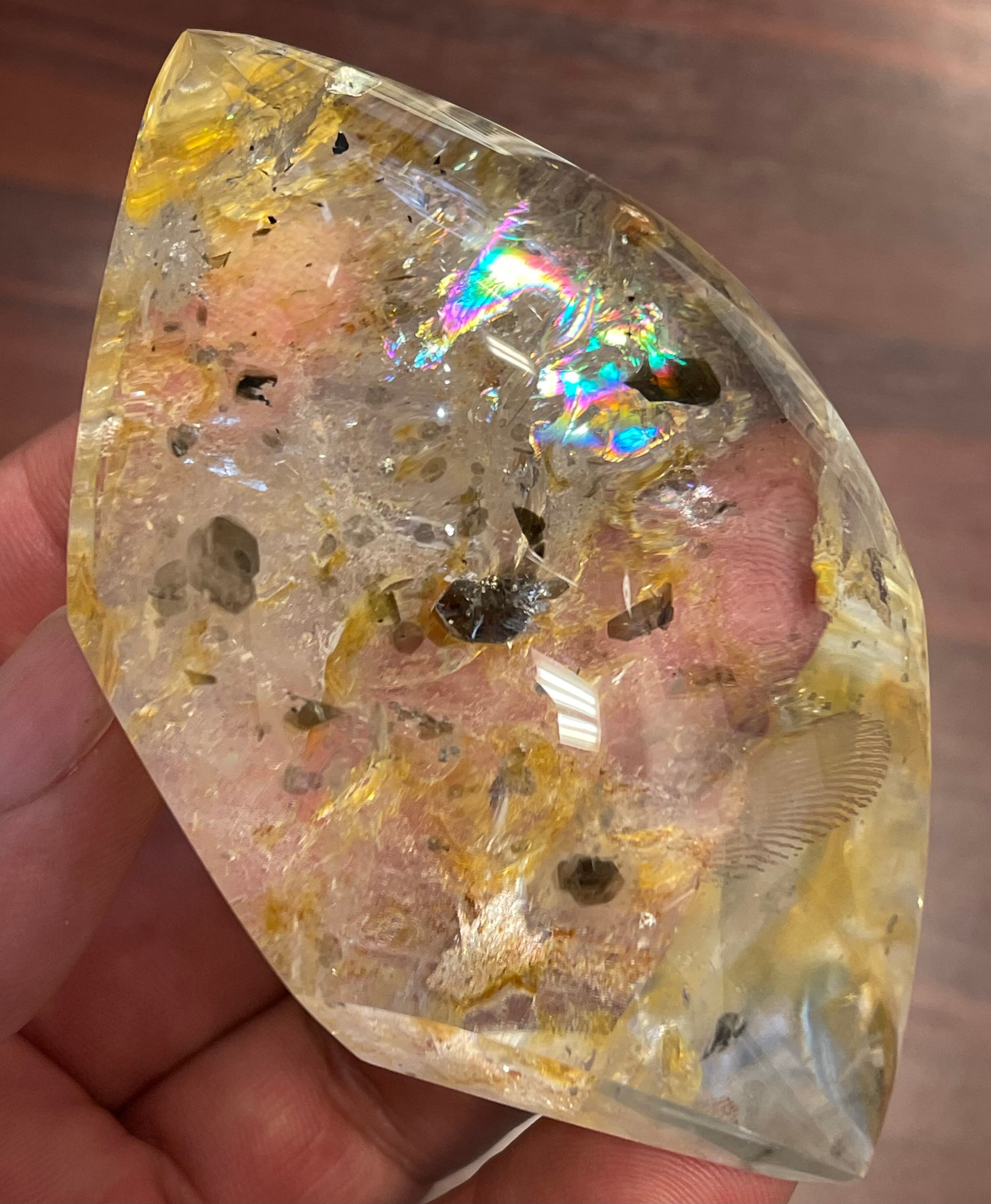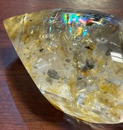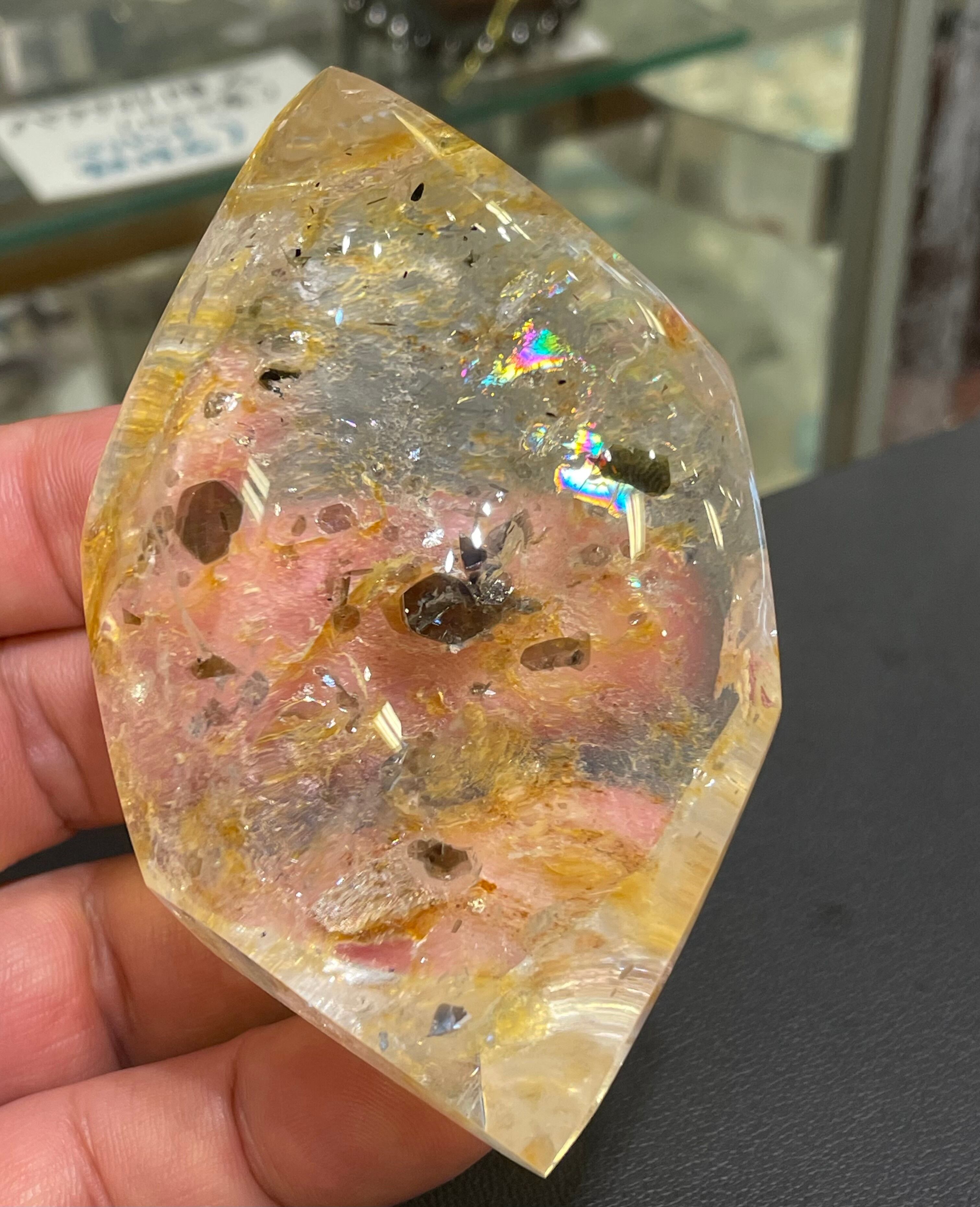 大きな虹入りのライモナイト入り、ヘマタイト入り水晶置物です♪