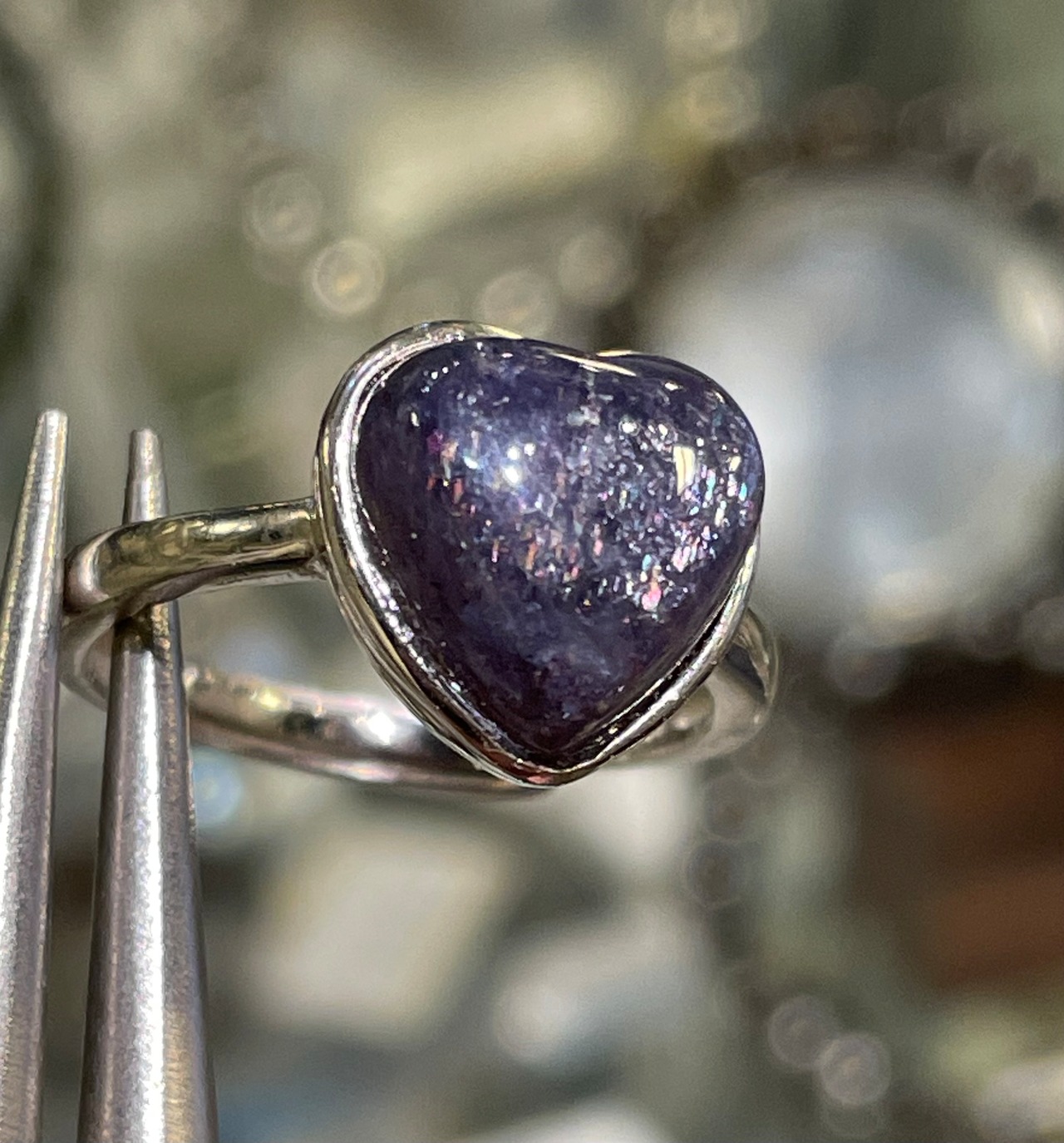 まるで星空のように煌めく宝石質のブラッドショットアイオライト指輪です。