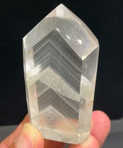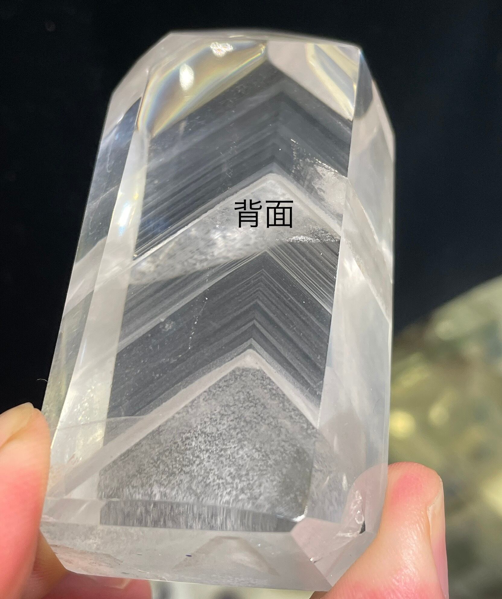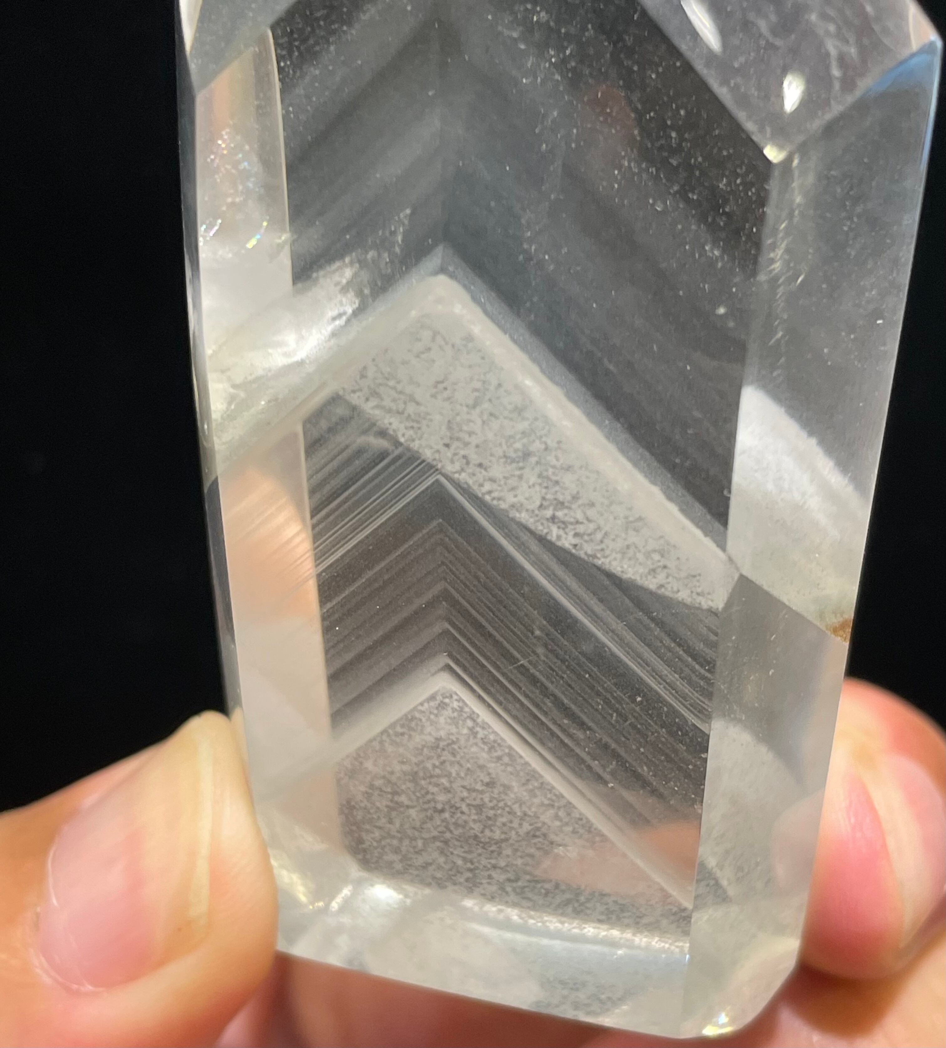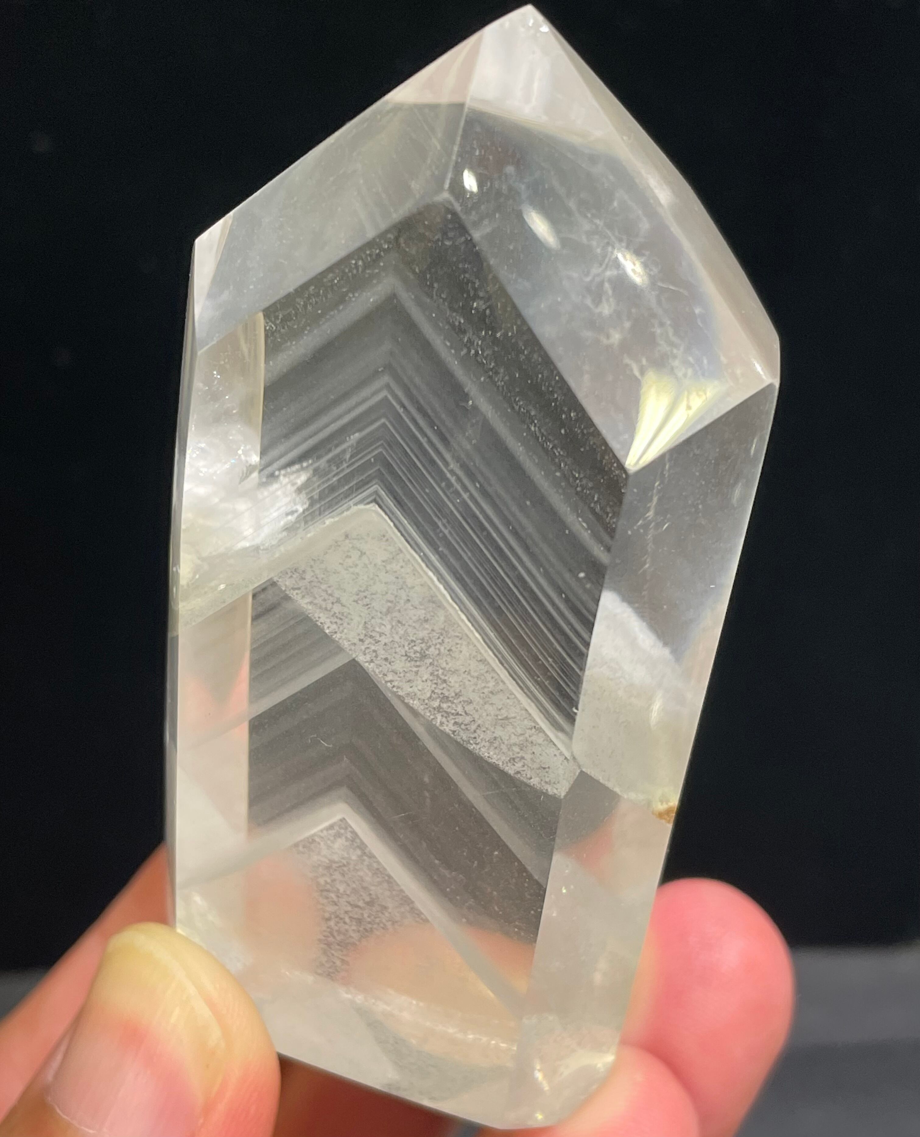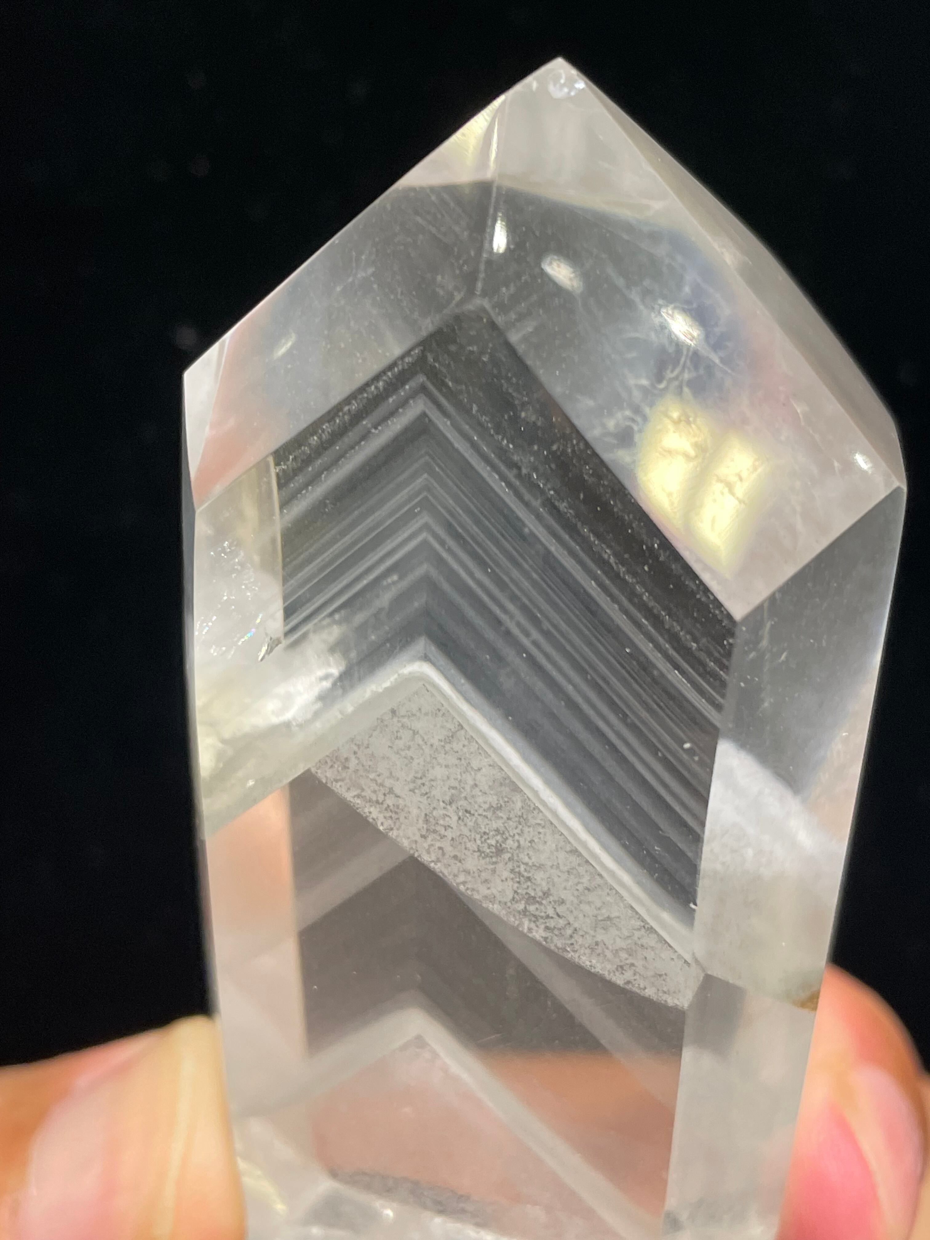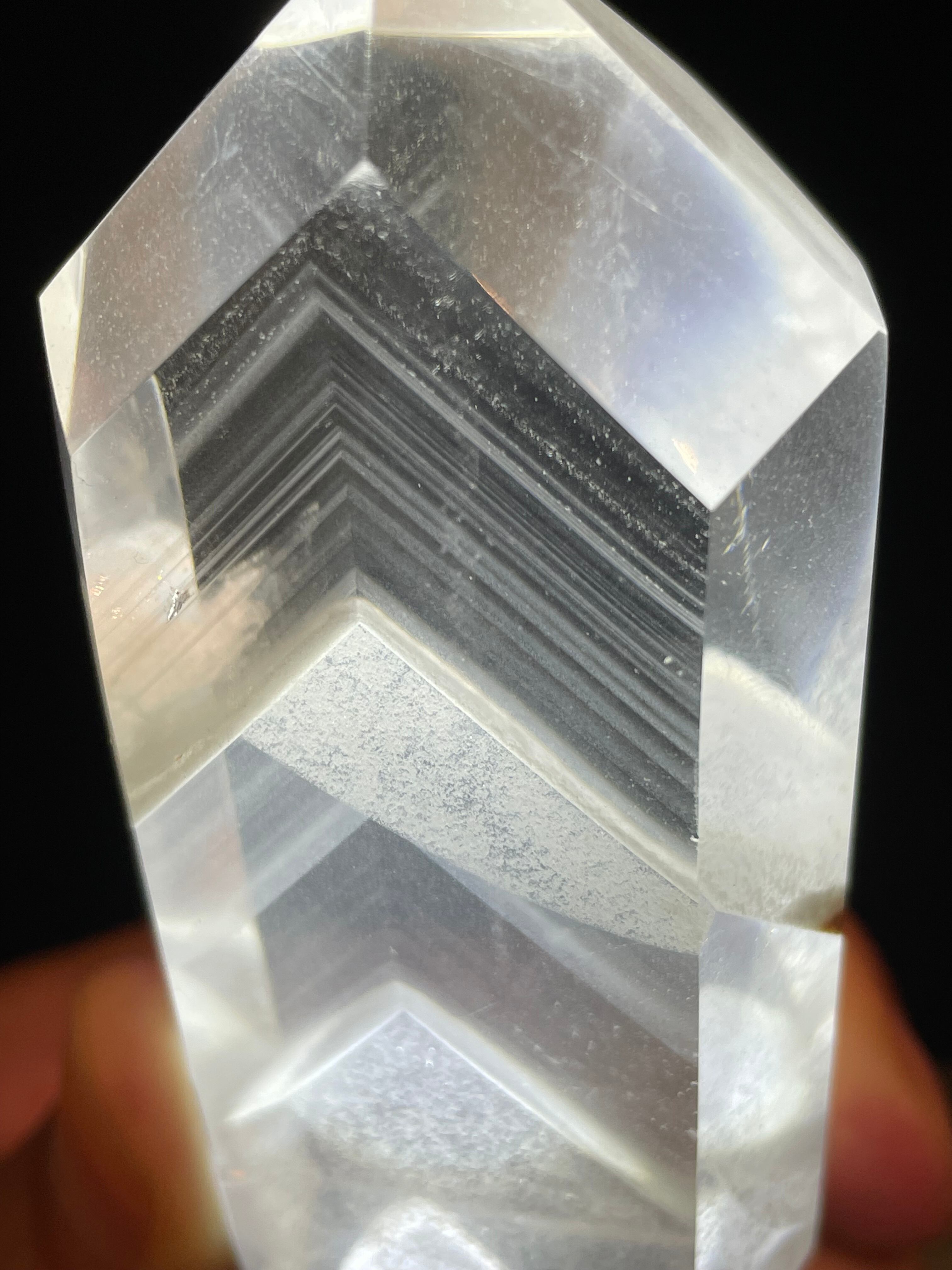 水晶の透明度が非常に高く、薄らとした白いファントムが何十層にも重ねて、下からライトを当てれば幻想的なピラミッド層が浮かび上がります。