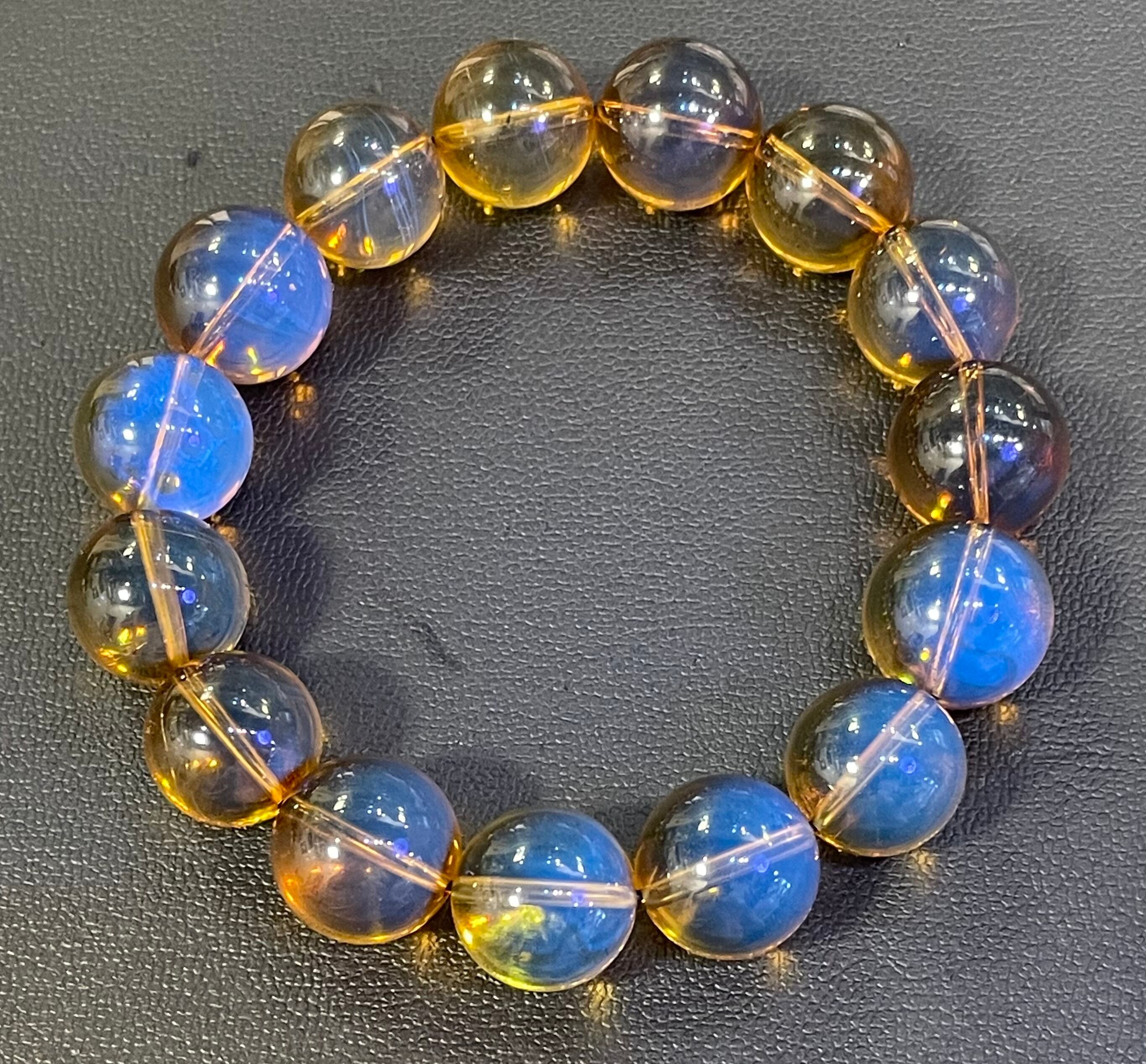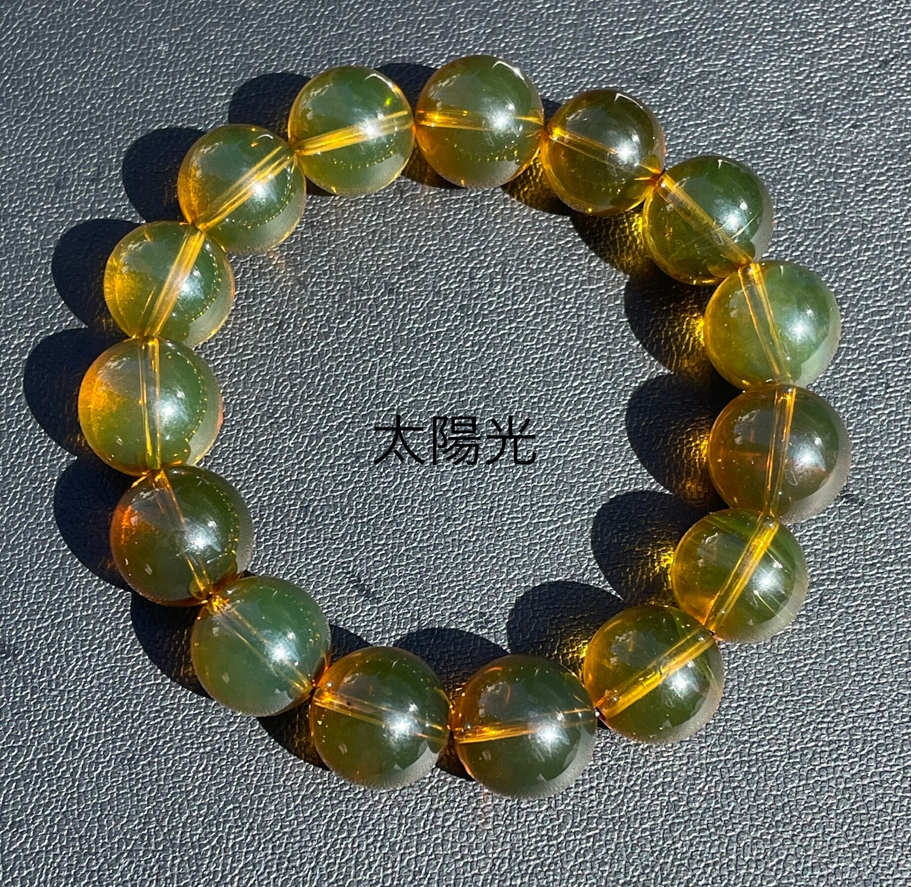 一見普通のアンバーとはなんら変りはないですが、太陽光やブラックライトなどの紫外線が当たると神秘的な美しいブルー光が表面を覆います。