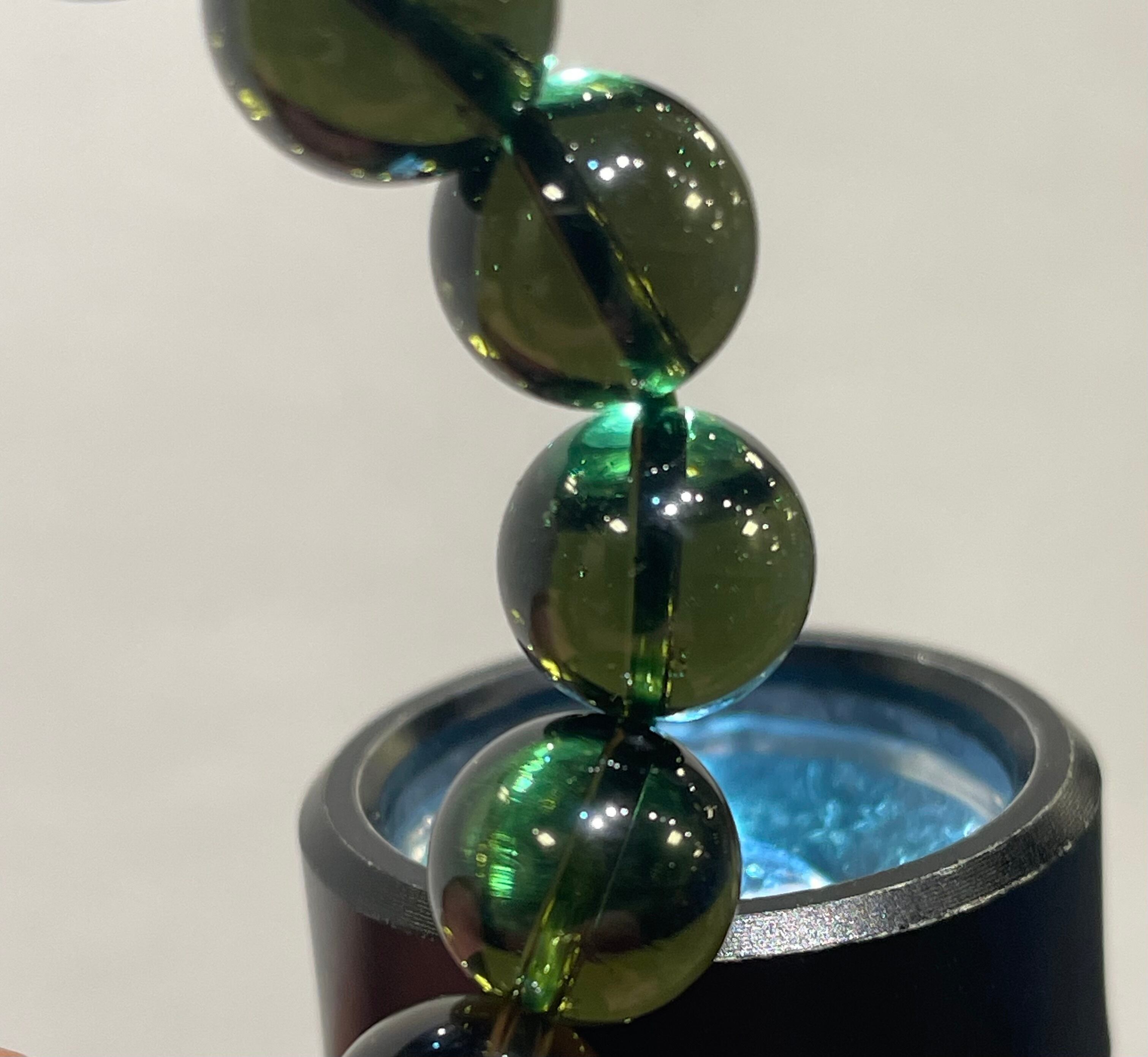 美しいフォレストグリーン色をしていまして、透かすと特にモルダバイト特有の綺麗なダークグリーン系の色合いを見せてくれます。玉が大きいので、少しダークグリーンになります。