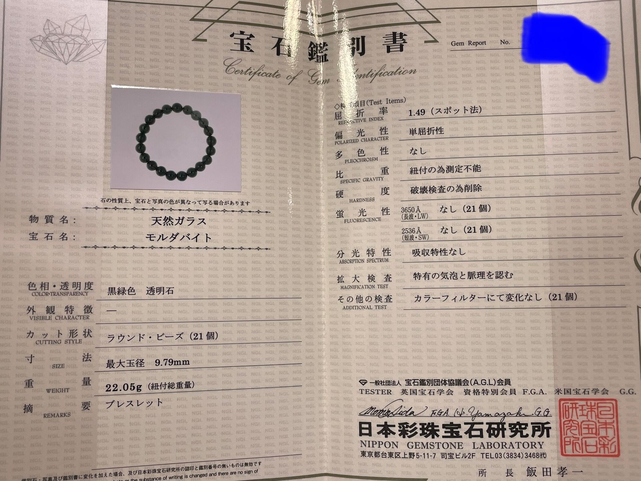 特選!最高グレード 天然モルダバイトブレスレット9.5〜9.7mm 鑑別書付き