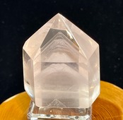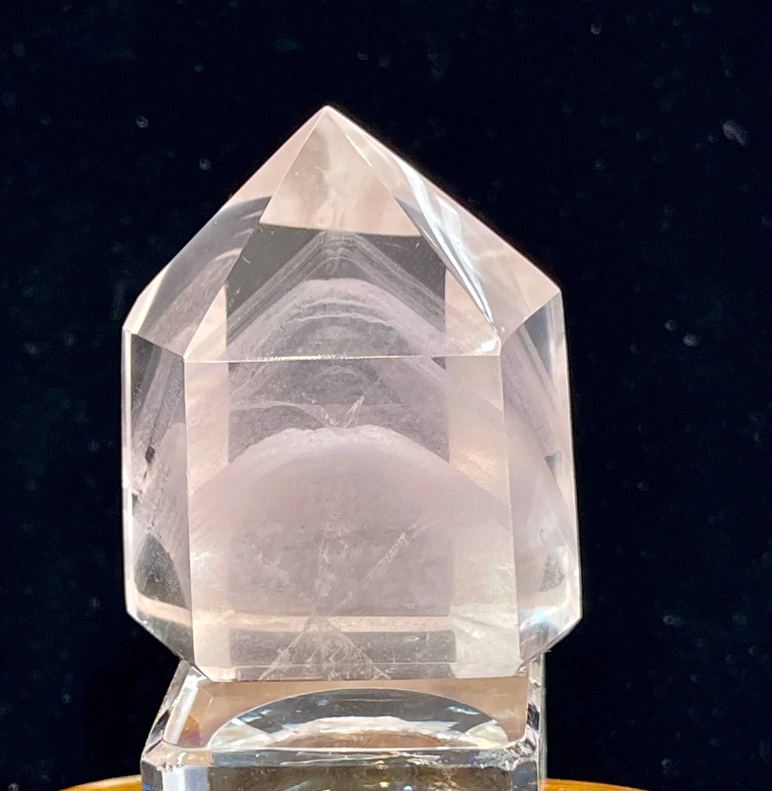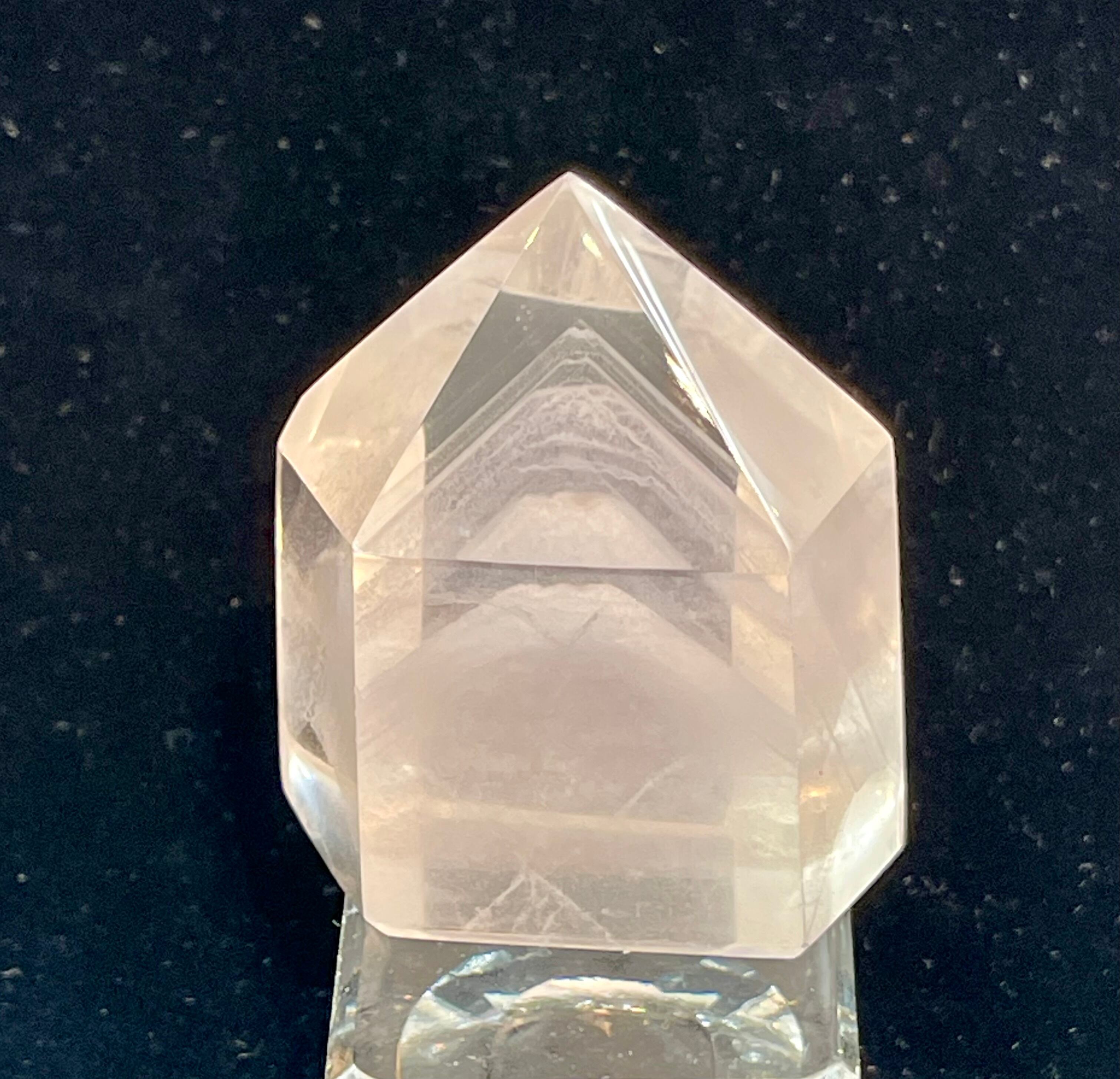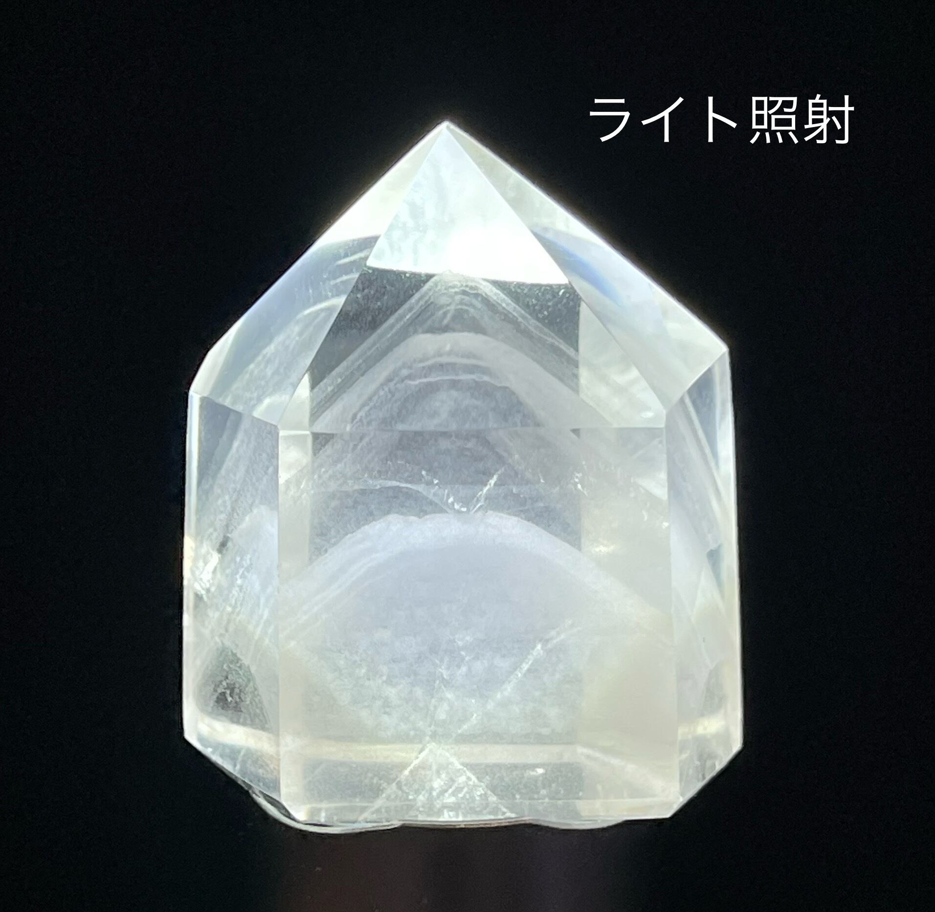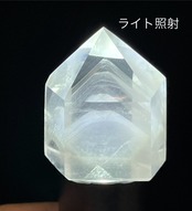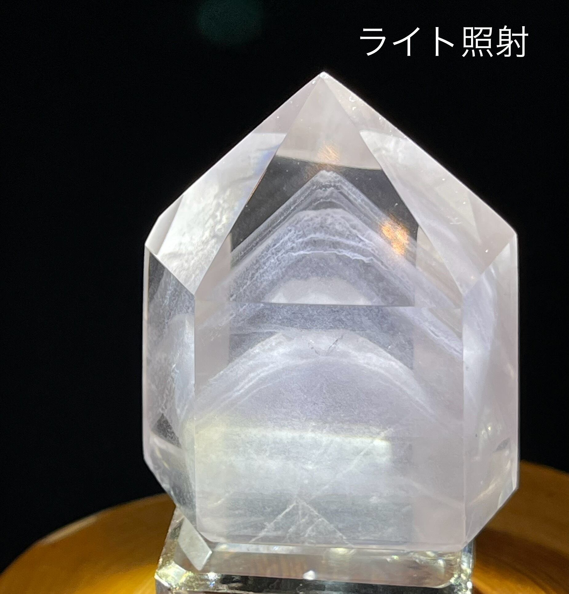 水晶の透明度が非常に高く、薄らとした白いファントムが何層にも重ねて、下からライトを当てれば幻想的なピラミッド層が浮かび上がります。