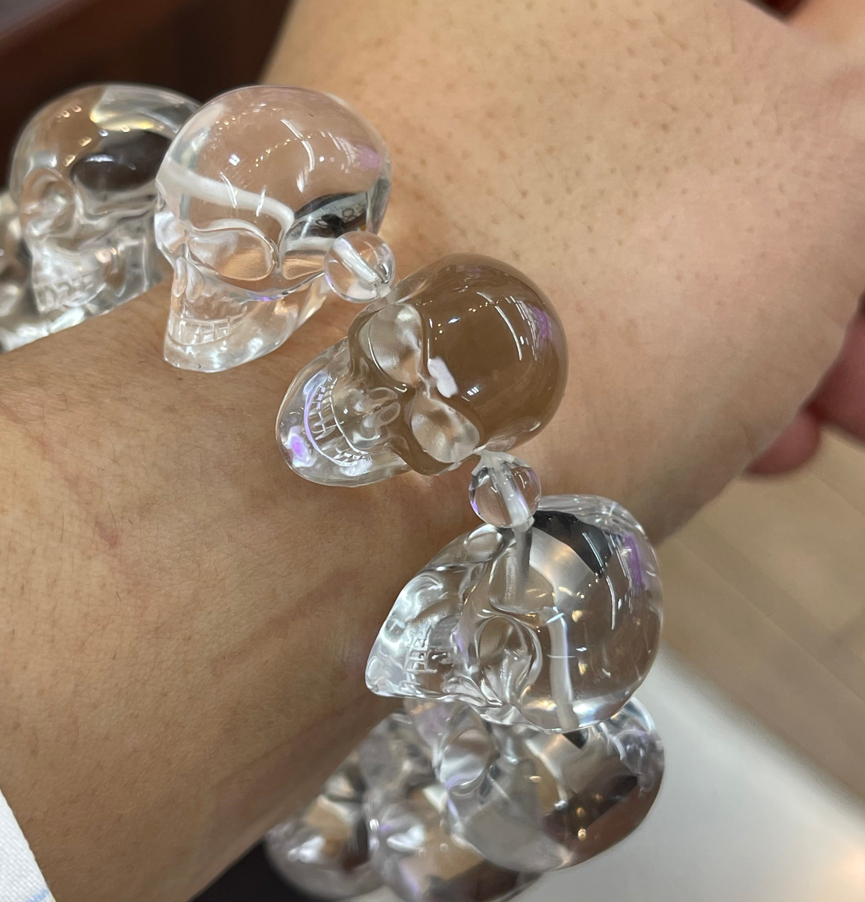 透明度抜群の天然水晶を精巧に彫って作った、水晶ドクロブレスレットです。天然水晶髑髏のブレスレットあまりありません^_^